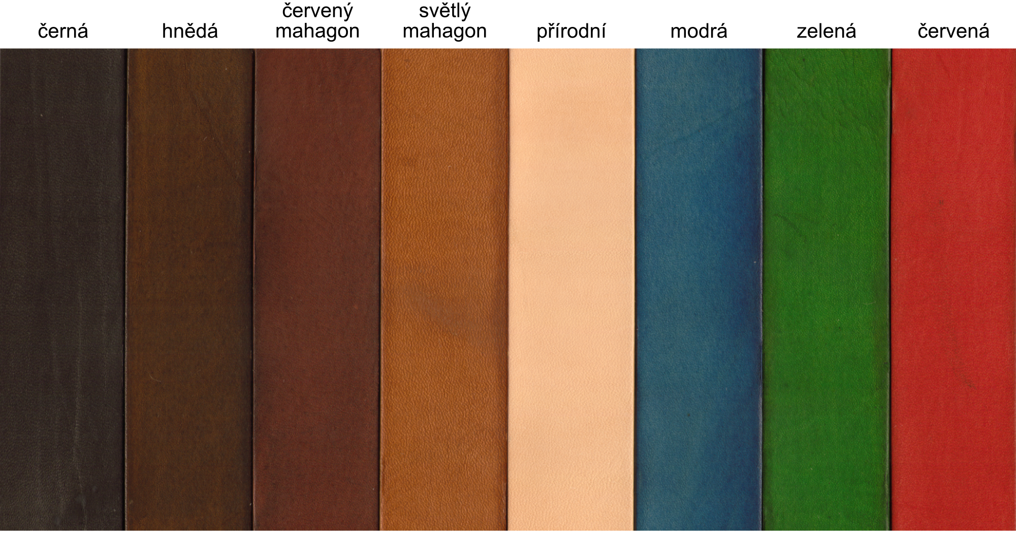 Kůže barvíme v těchto základních barvách: černá, hnědá, červený mahagon, světlý mahagon, přírodní, modrá, zelená, červená. Níže na obrázku vám pro představu nabízíme paletu těchto základních barev. Protože je kůže barvená ručně, může se výsledný odstín dané barvy mírně lišit od odstínu ve vzorníku.