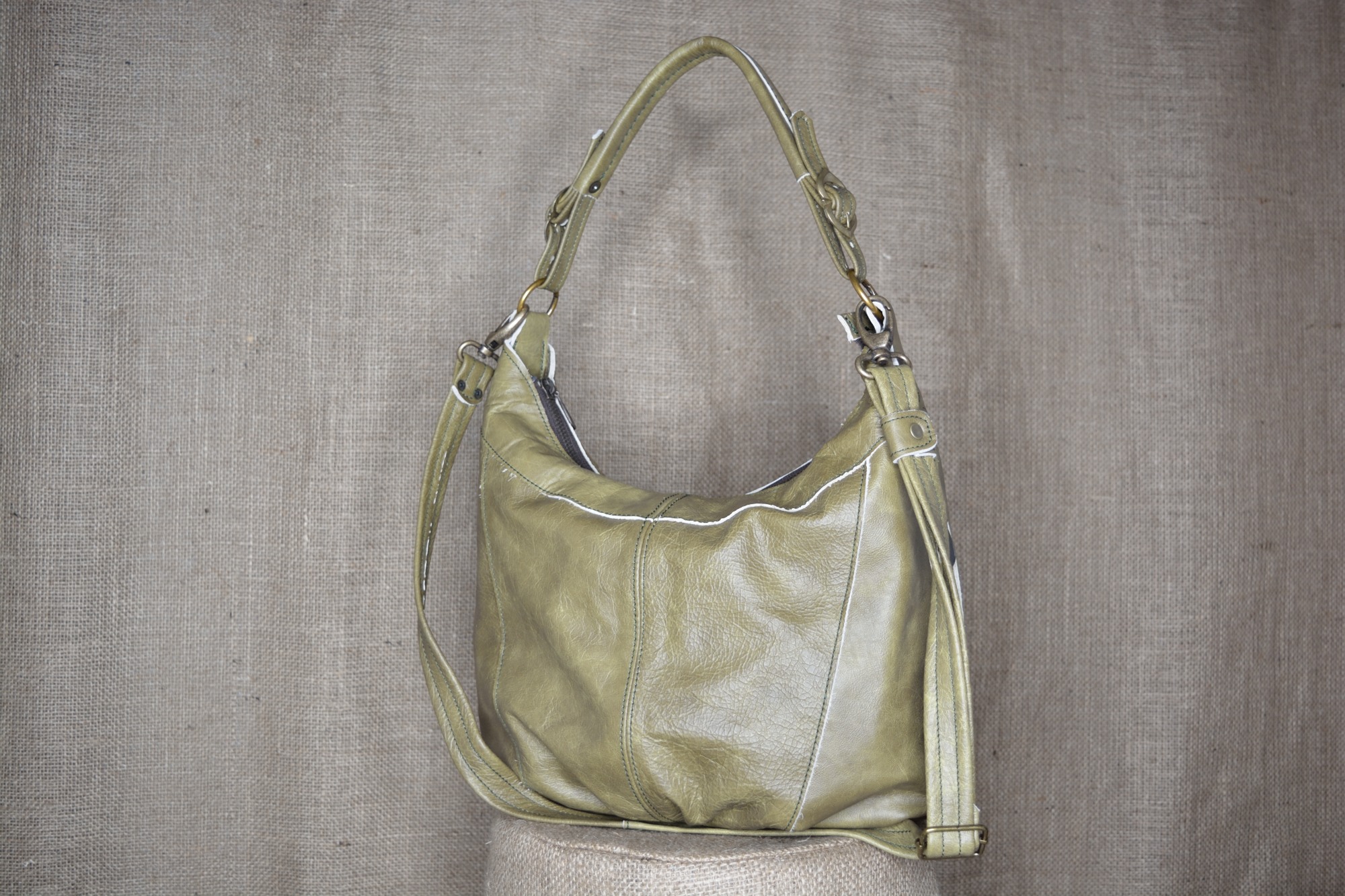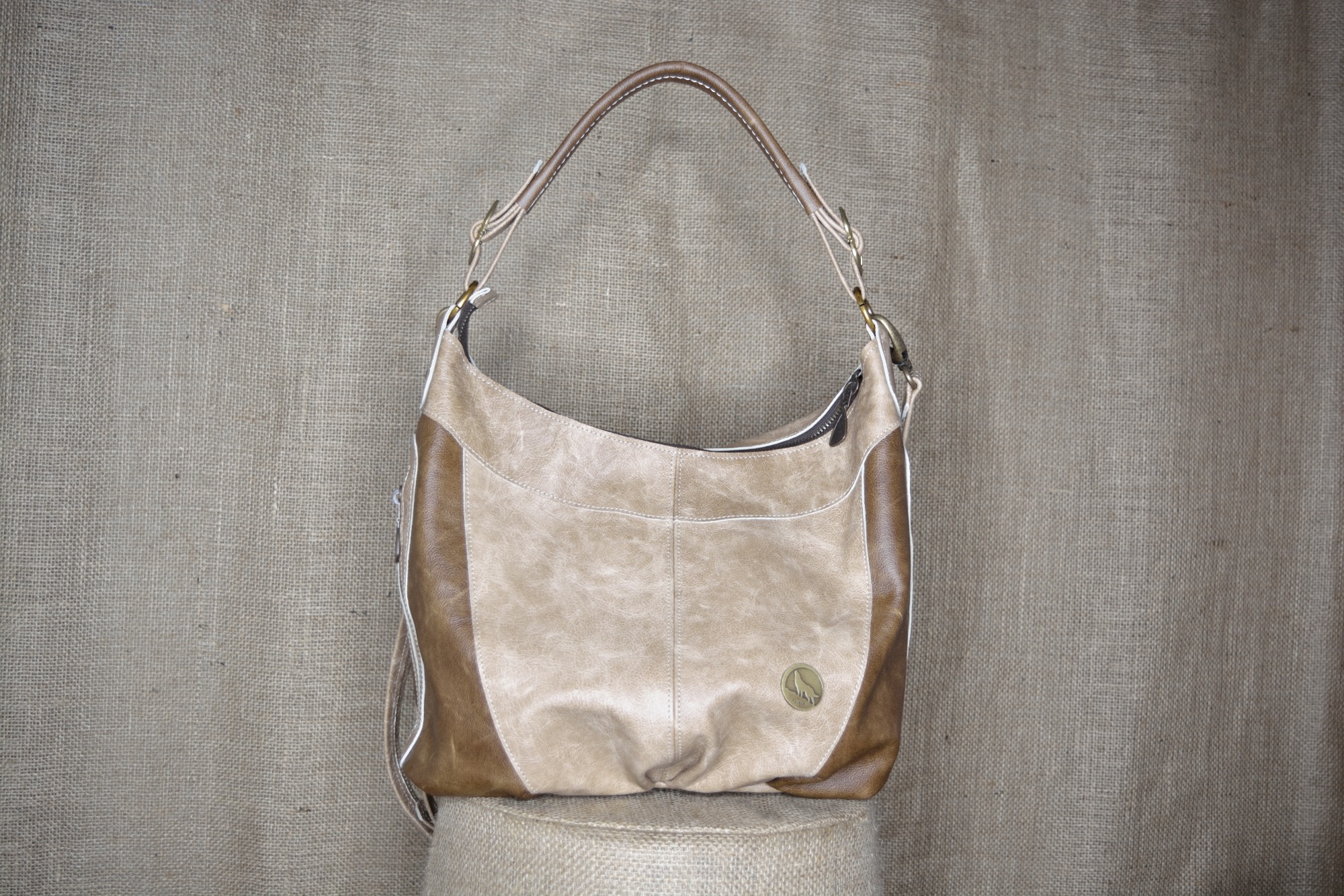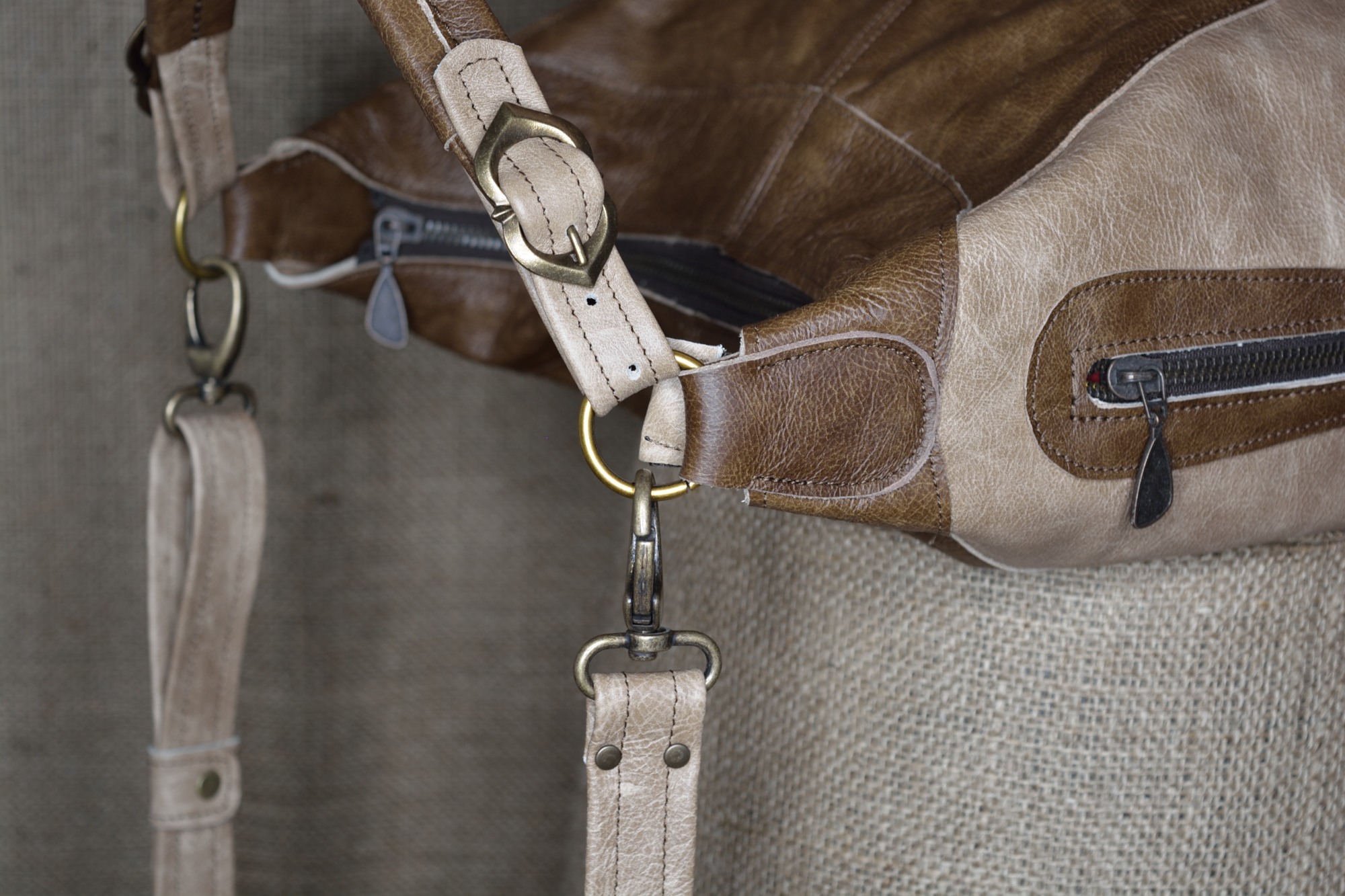 Kabelka má jedno držátko do ruky, které je ke kabelce ozdobně připevněno nastavitelnými přezkami. K držátku do ruky je pomocí karabin připevněn ještě popruh přes rameno, kterého délku je možné libovolně nastavovat.
