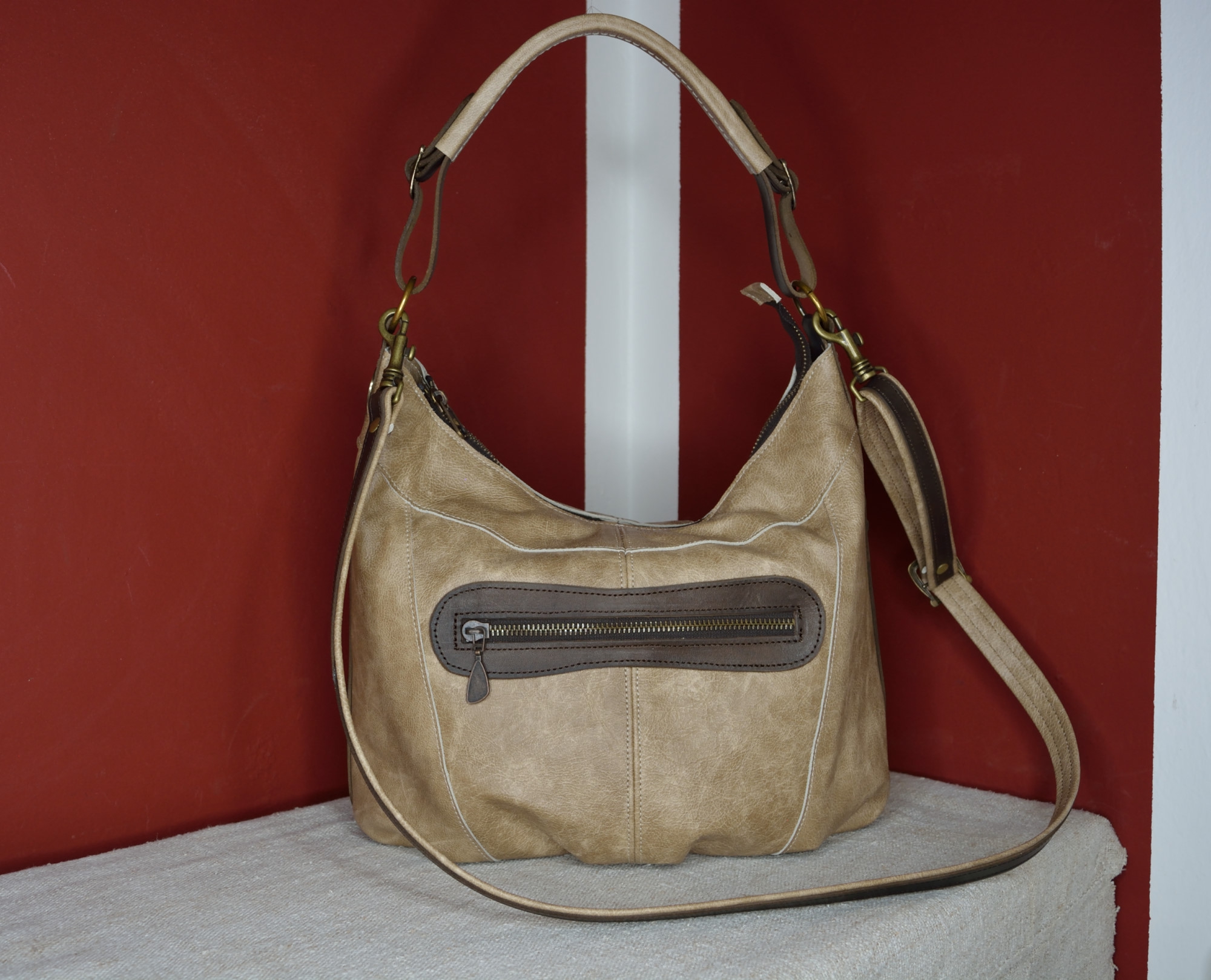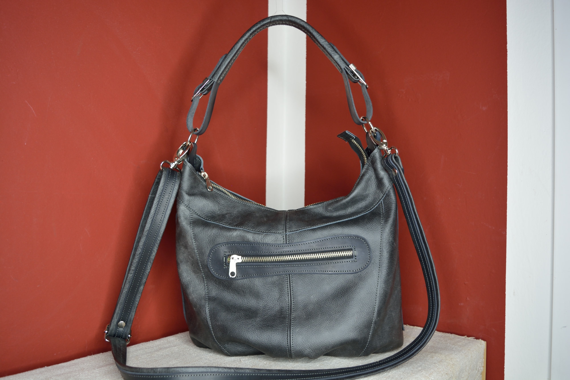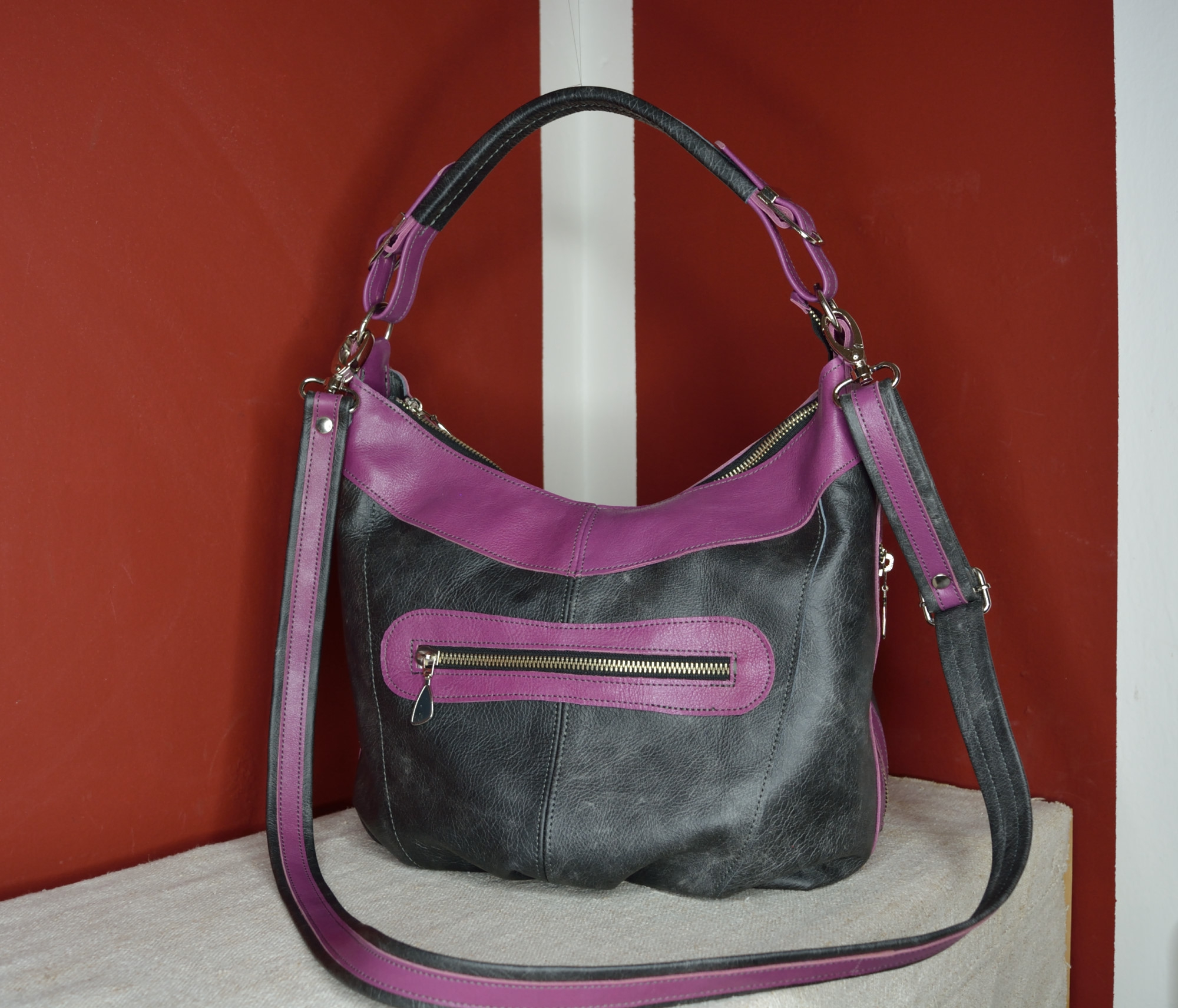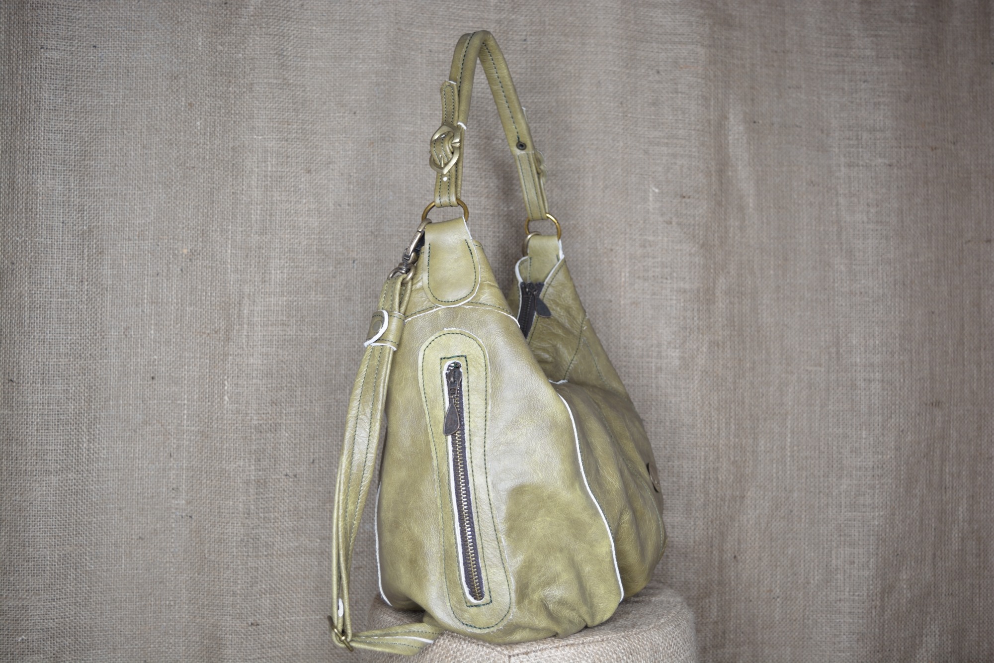 Dámská kožená kabelka Andys A4 - kvalitní dámská kožená kabelka vyrobená ručně z pravé hovězí kůže. Kožená kabelka má jedno hlavní oddělení, ve kterém se nachází na přední straně jedna kapsa z podšívky rozdělená na tři části. Zevnitř na zadní straně je zipová kapsa, která má na sobě našitou menší separaci uzavíratelnou na zip. Zvenčí na předním dílu má kabelka jednu funkční ozdobnou zipovou kapsu a po obou bocích má kabelka našité dvě ozdobní funkční zipové kapsy.