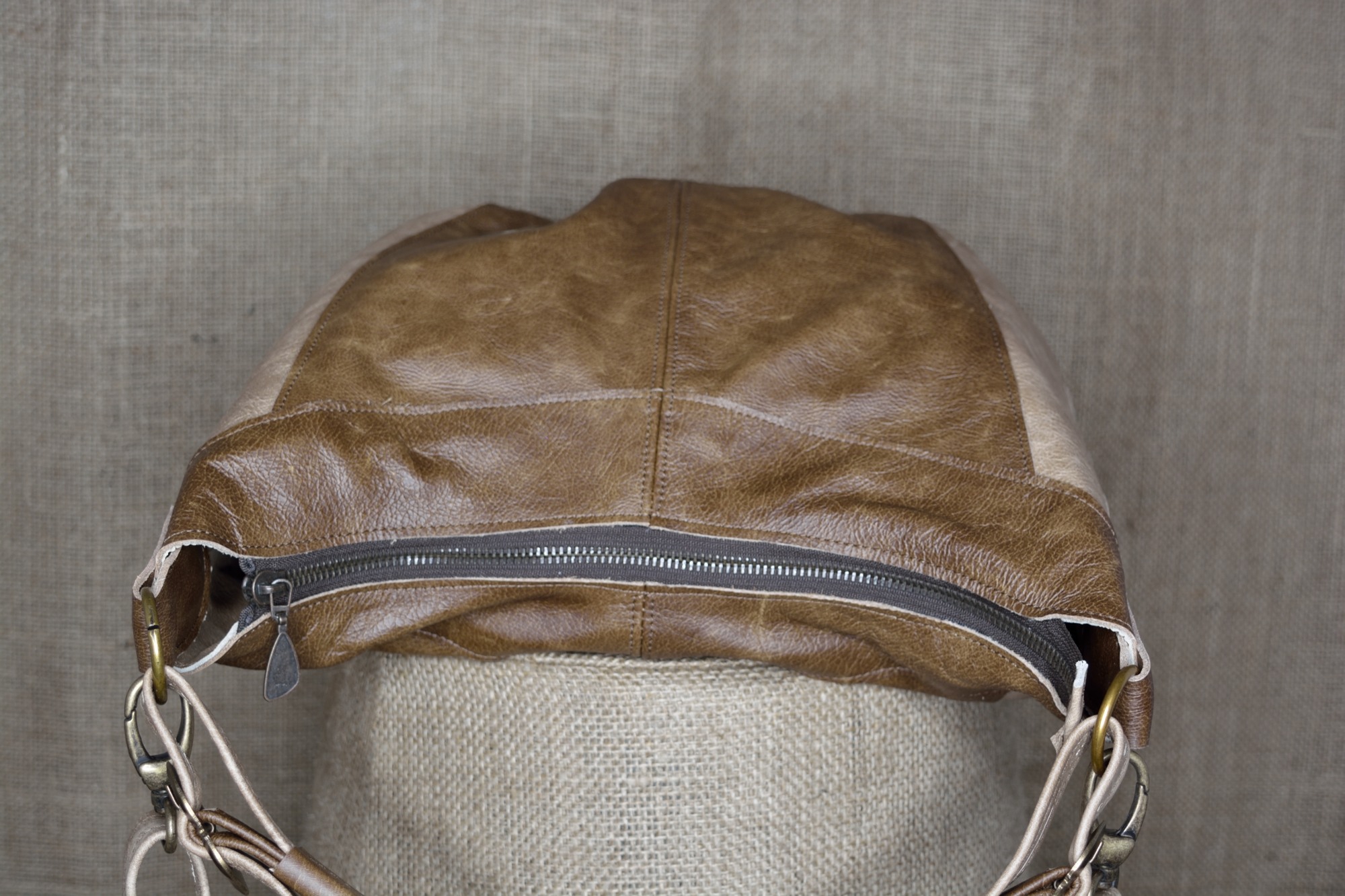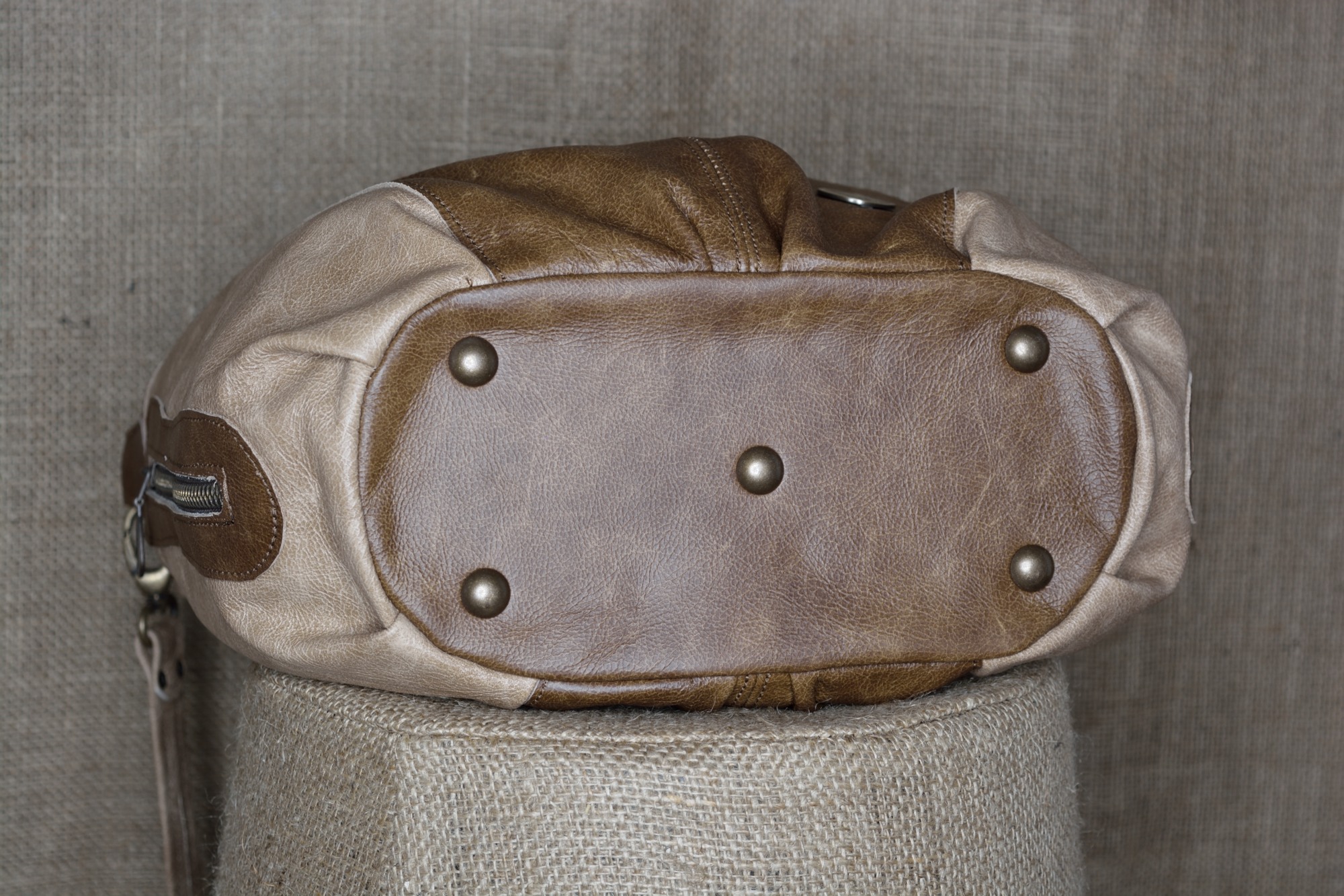Kožená kabelka Andys A4 je uzavíratelná z vrchní strany na zip. Aby se dno kabelky při manipulaci tolik neopotřebovávalo je vyztuženo a chráněno kovovými nýty (puklemi).
