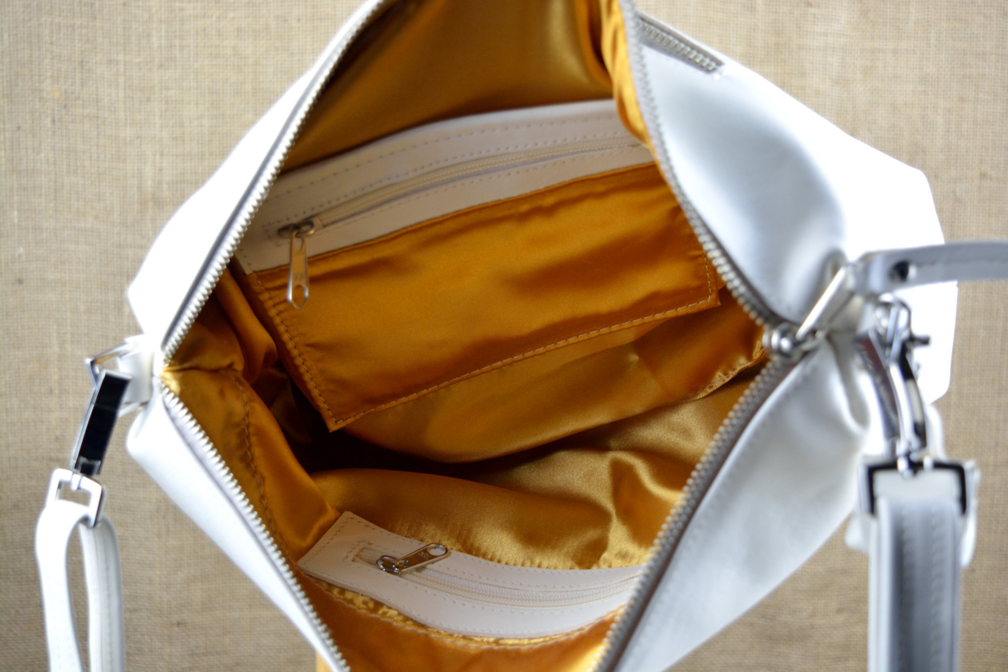 Vnitřek kabelky je navržen tak, aby v něm bylo možné pohodlně nosit dokumenty ve formátu A5.