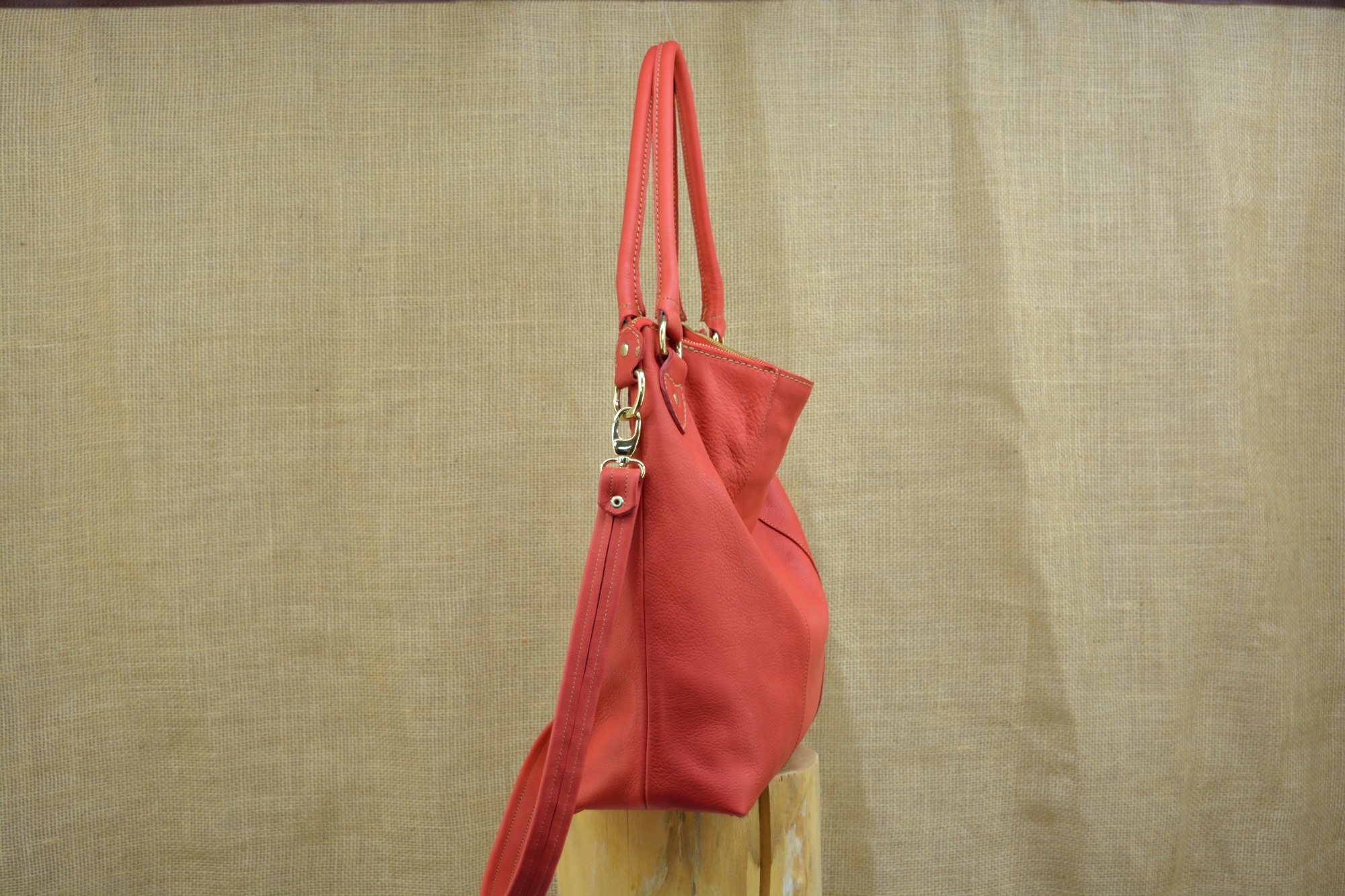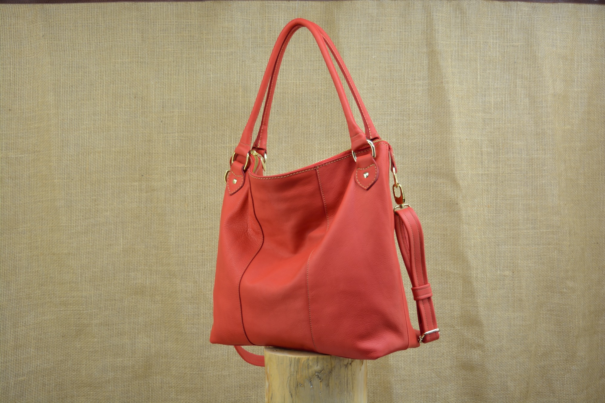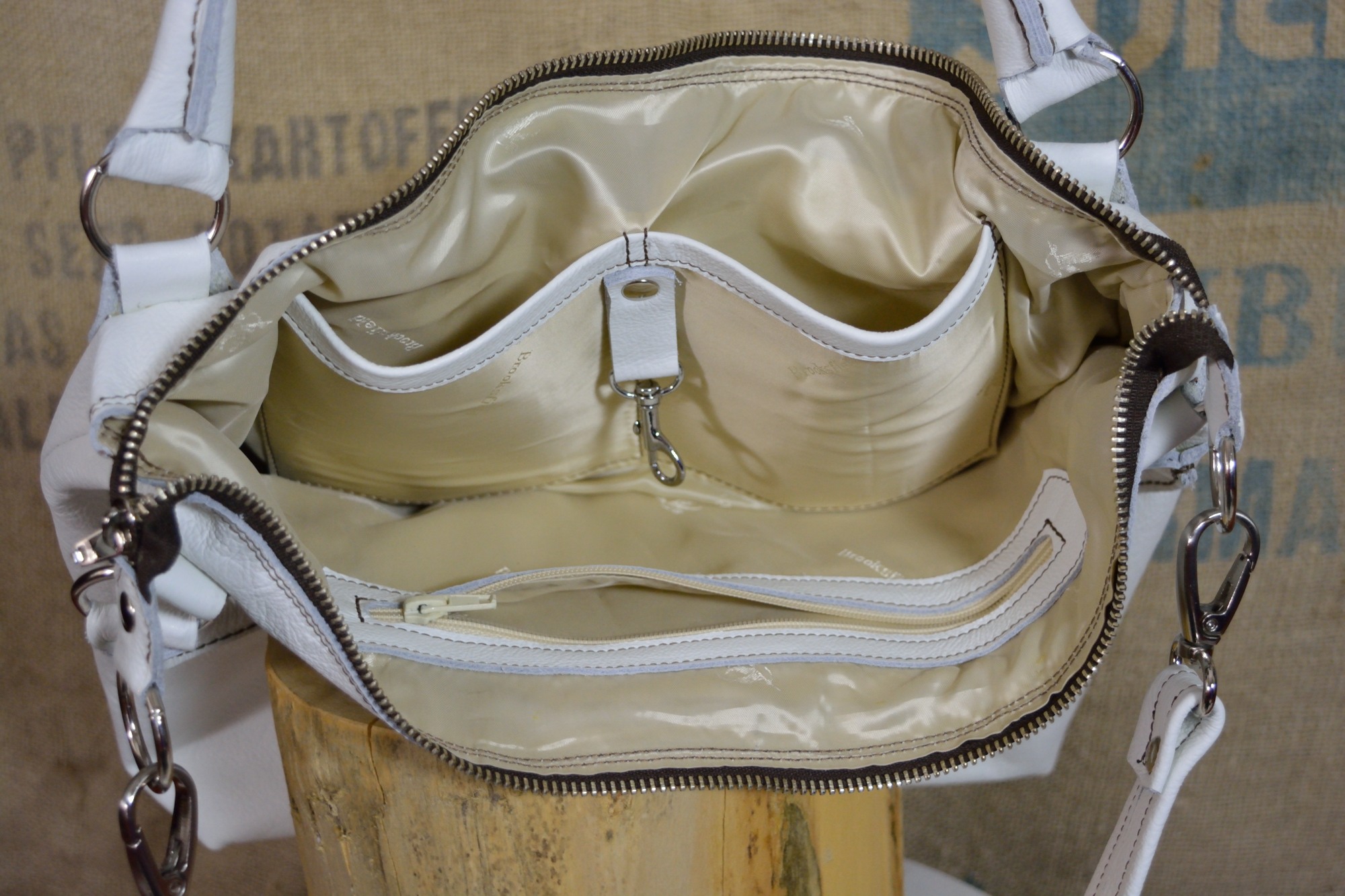 Dámská kožená kabelka Deneris A4 - kvalitní dámská kožená kabelka vyrobená ručně z pravé hovězí kůže. Kožená kabelka má jedno hlavní oddělení, ve kterém se nachází na přední straně dvě kapsy z podšívky a na zadní straně jedna uzavíratelná kapsa z podšívky na zip.