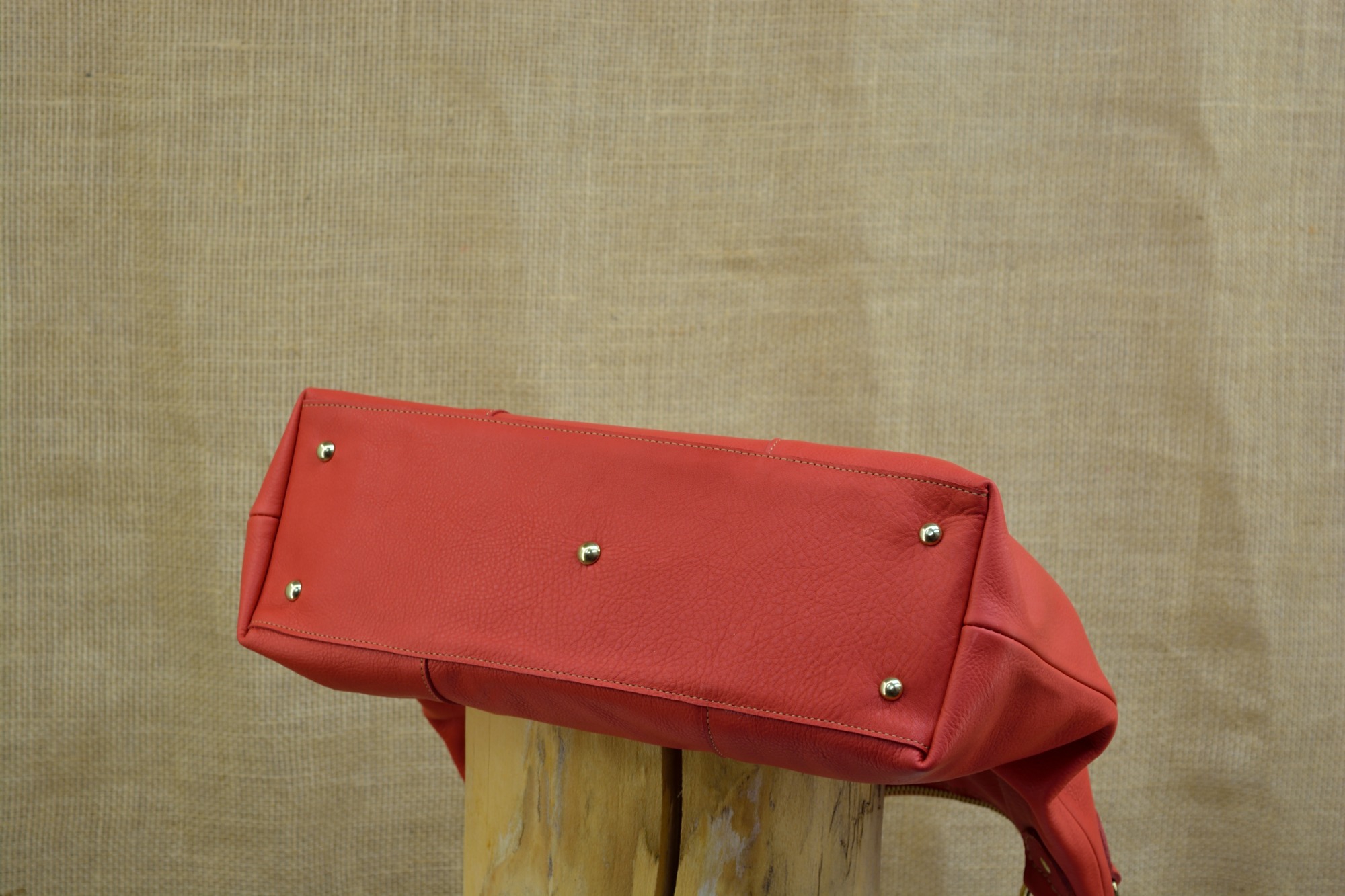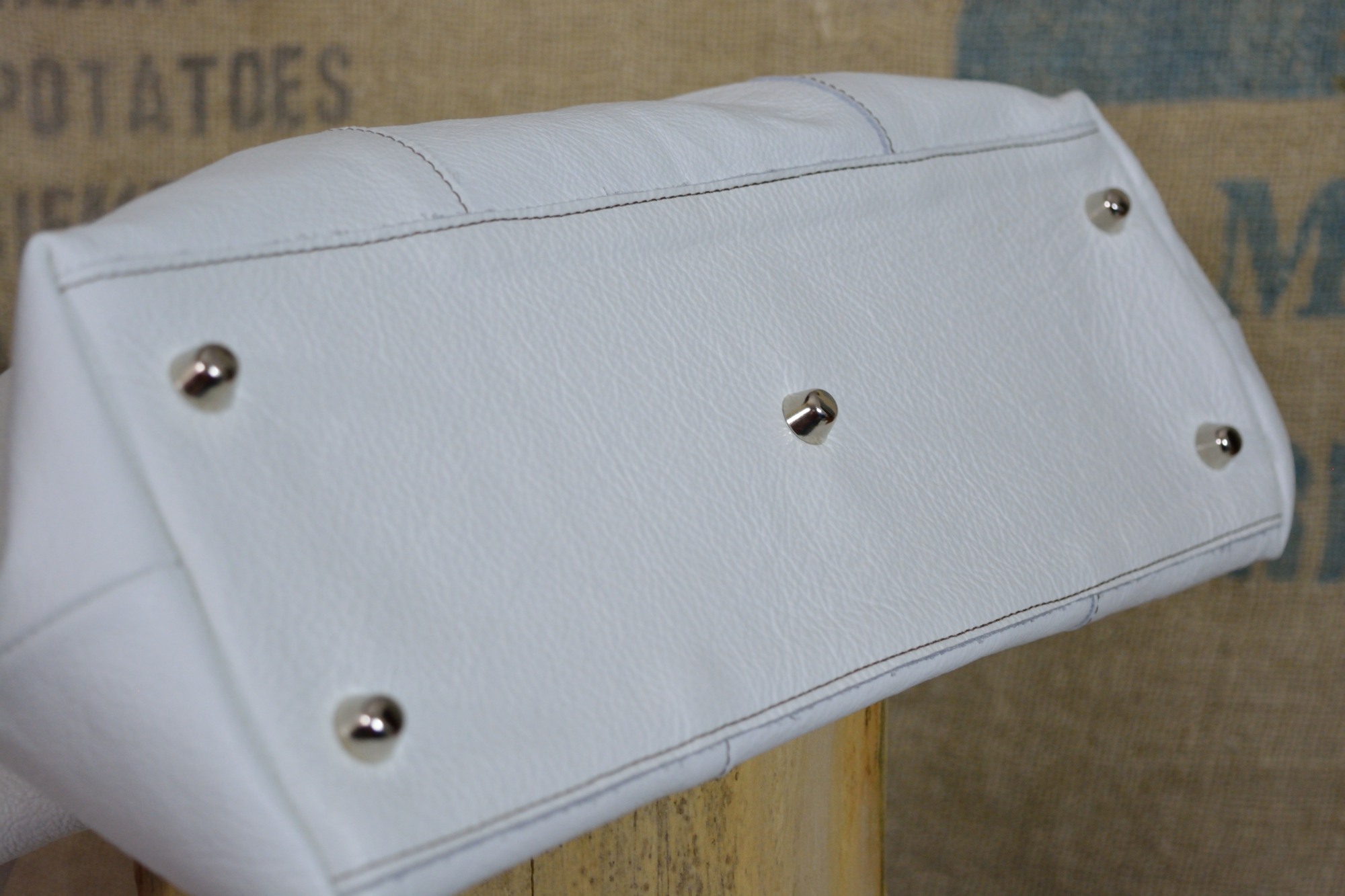 Kožená kabelka Deneris A4 je uzavíratelná z vrchní strany na zip. Aby se dno kabelky při manipulaci tolik neopotřebovávalo je vyztuženo a chráněno kovovými nýty (puklemi).
