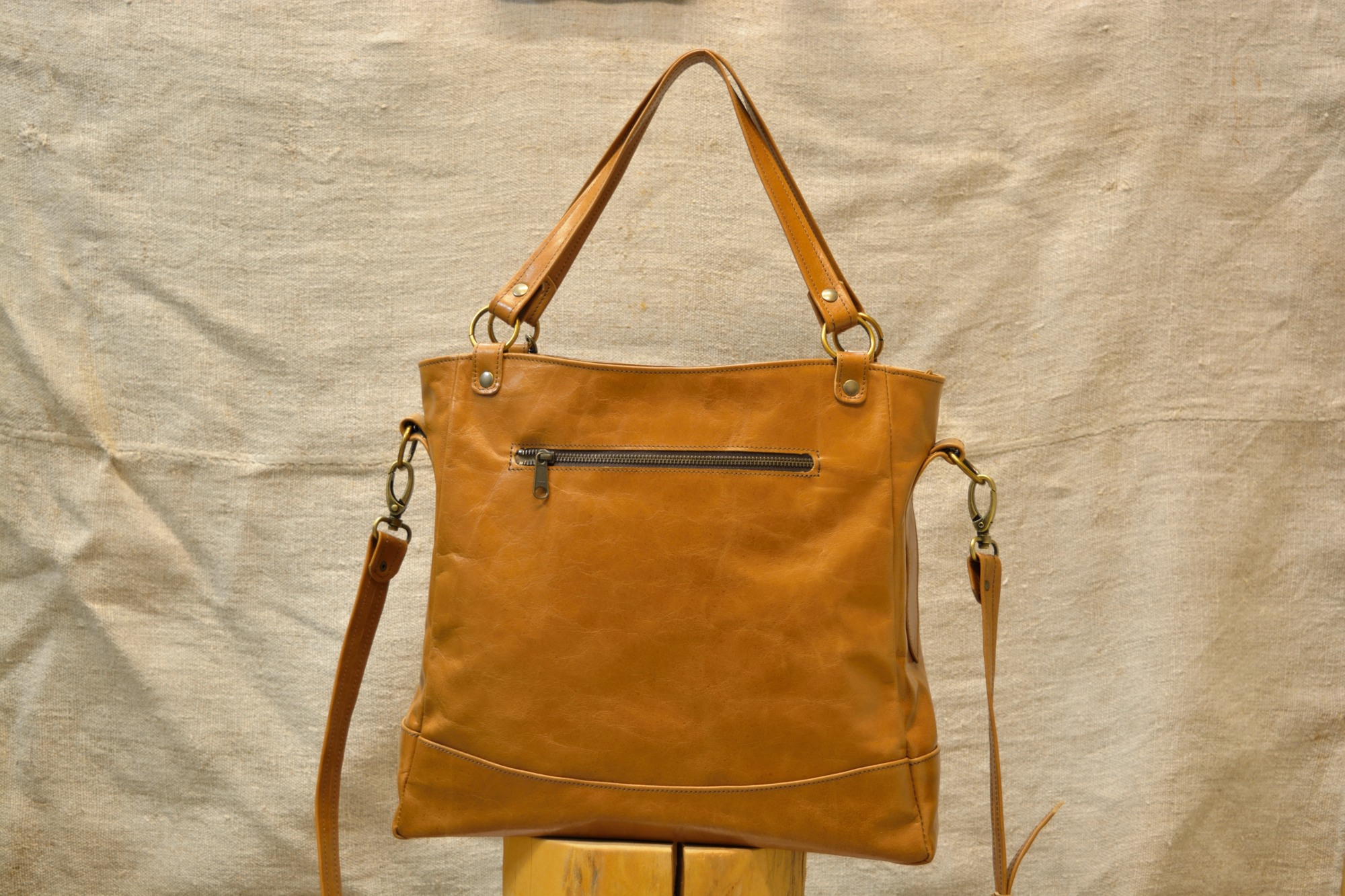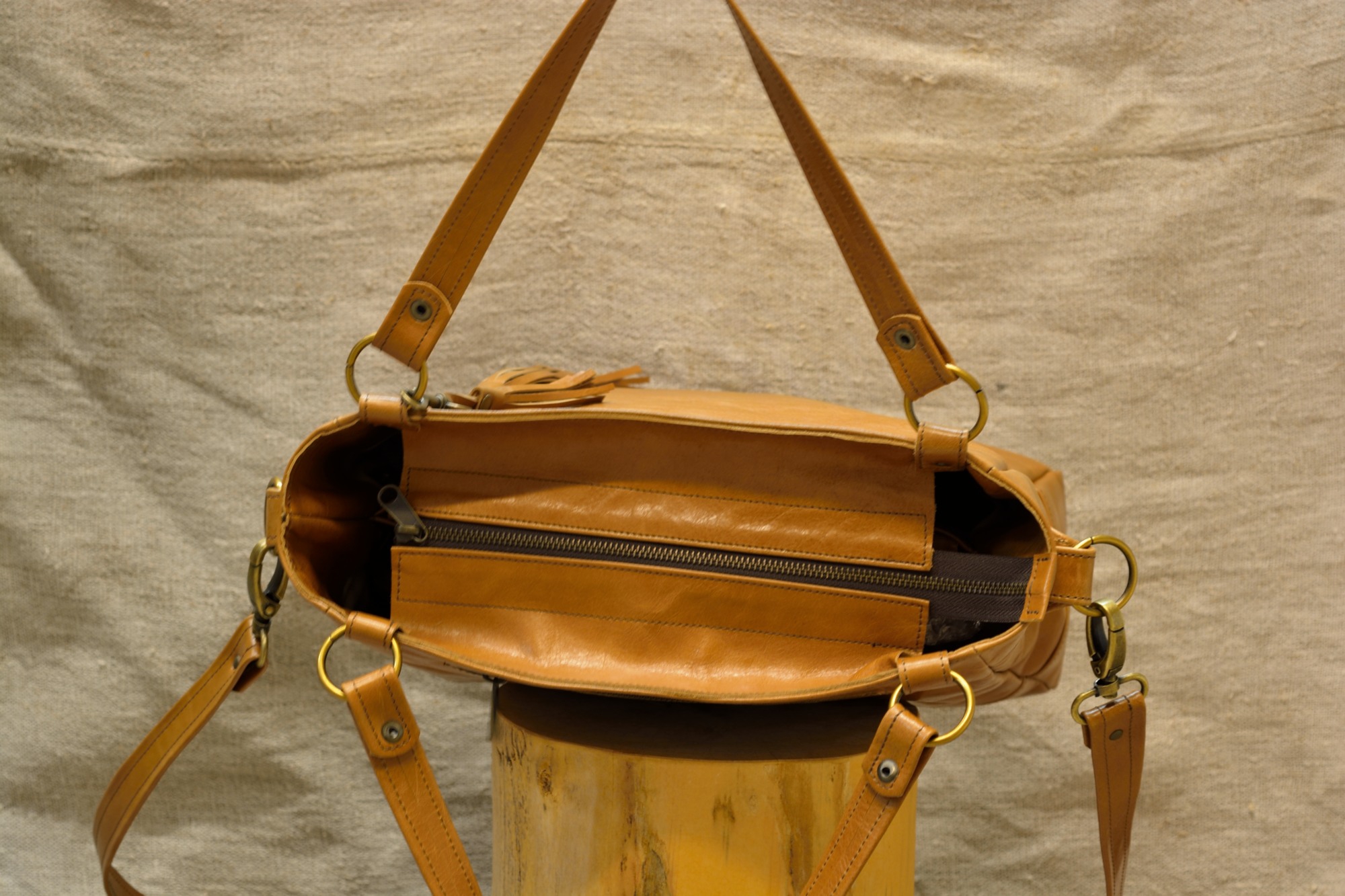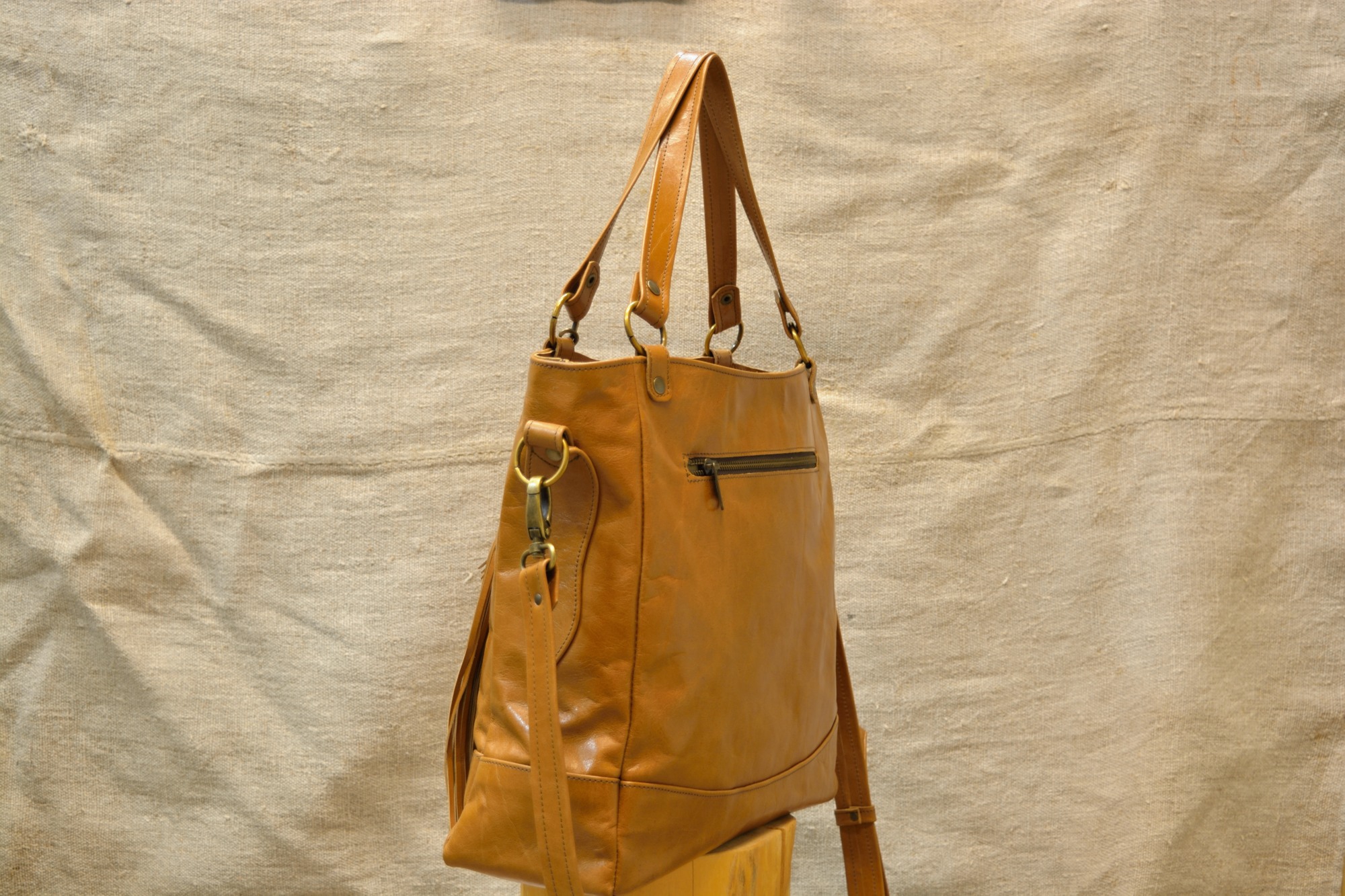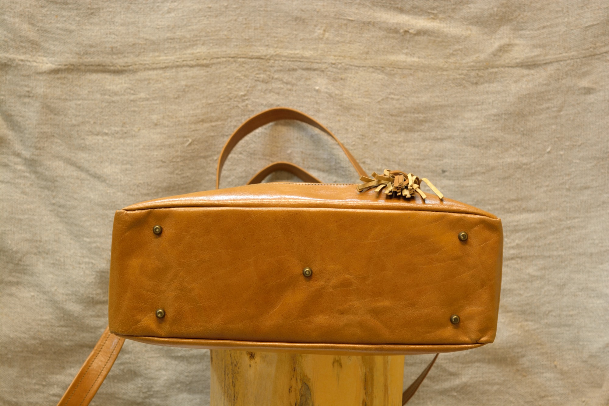 Kožená kabelka Paris je uzavíratelná z vrchní strany na zip. Zvenčí zezadu je na kabelce našitá ještě jedna kapsa na zip a zepředu jsou na držátku do ruky pověšené pomocí karabinky dva ozdobné střapce. Aby se dno kabelky při manipulaci tolik neopotřebovávalo je vyztuženo a chráněno kovovými nýty (puklemi).