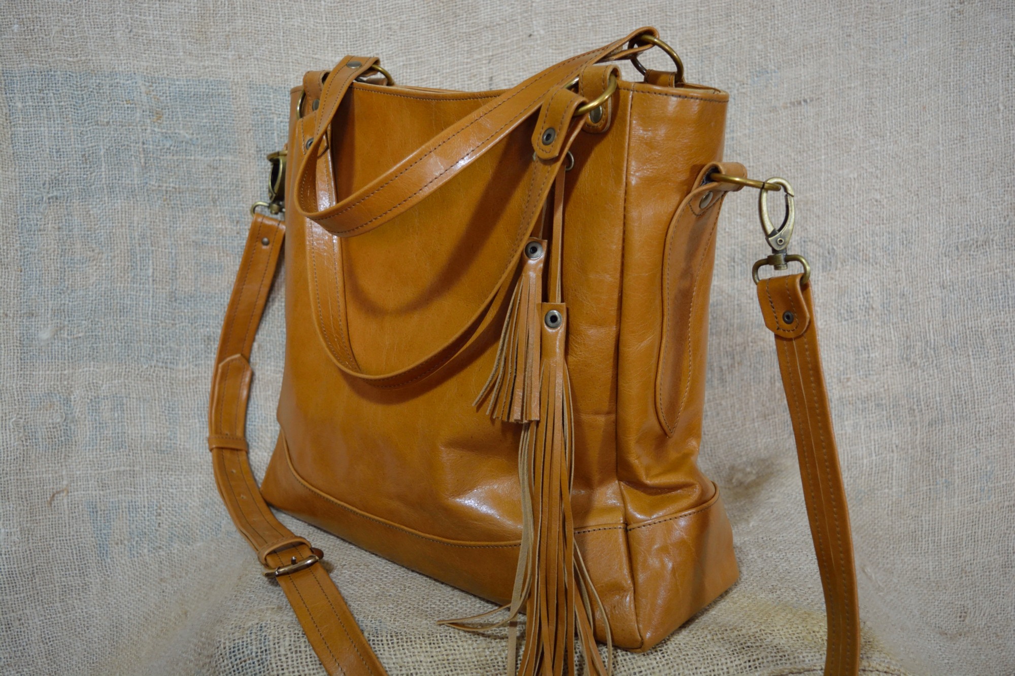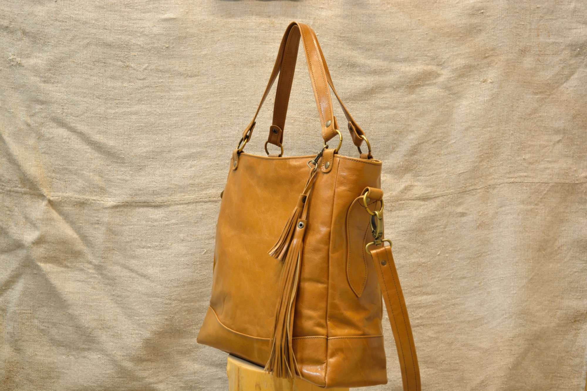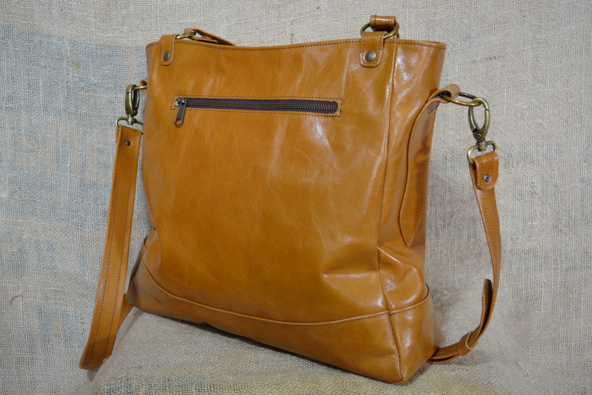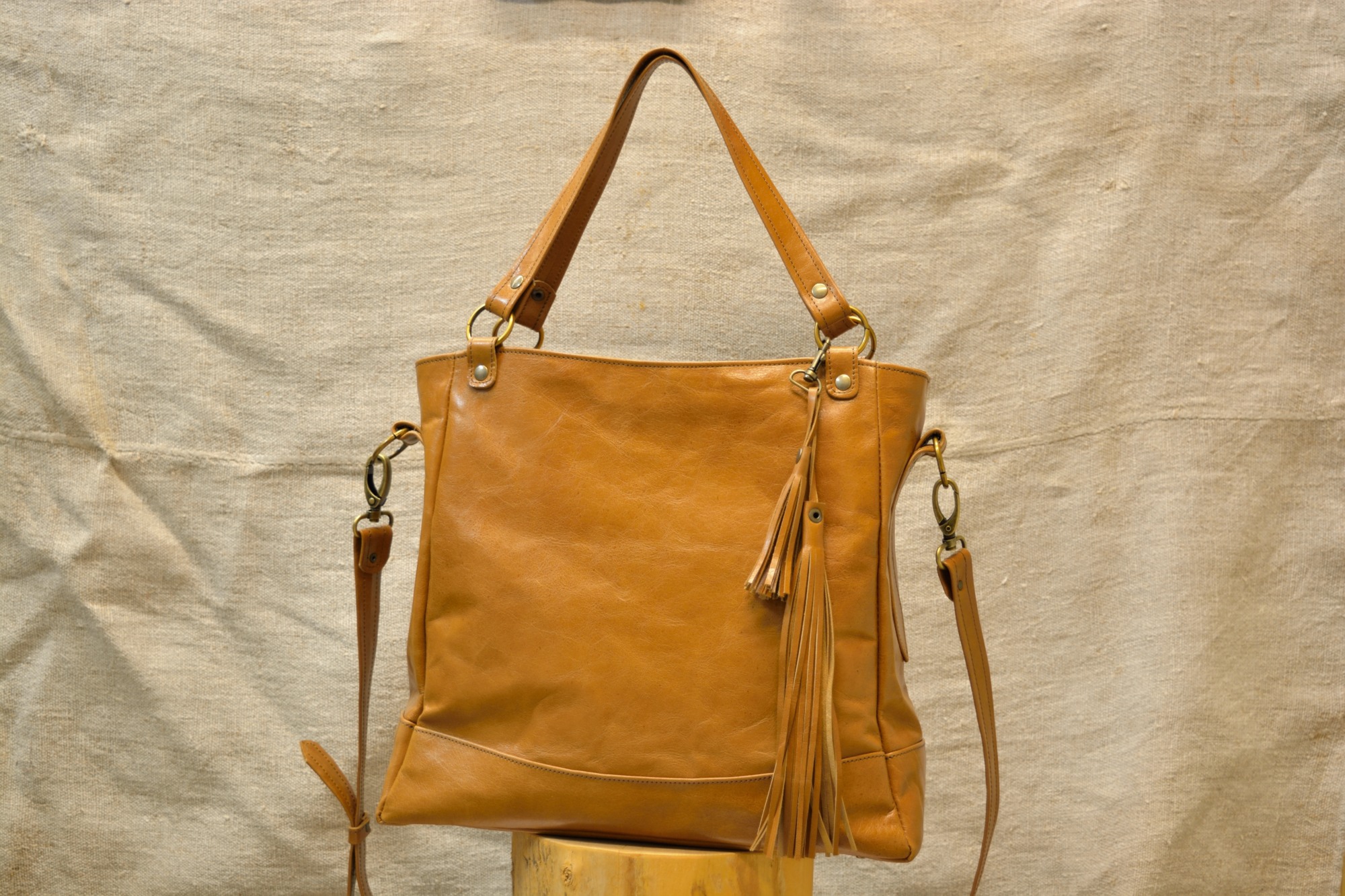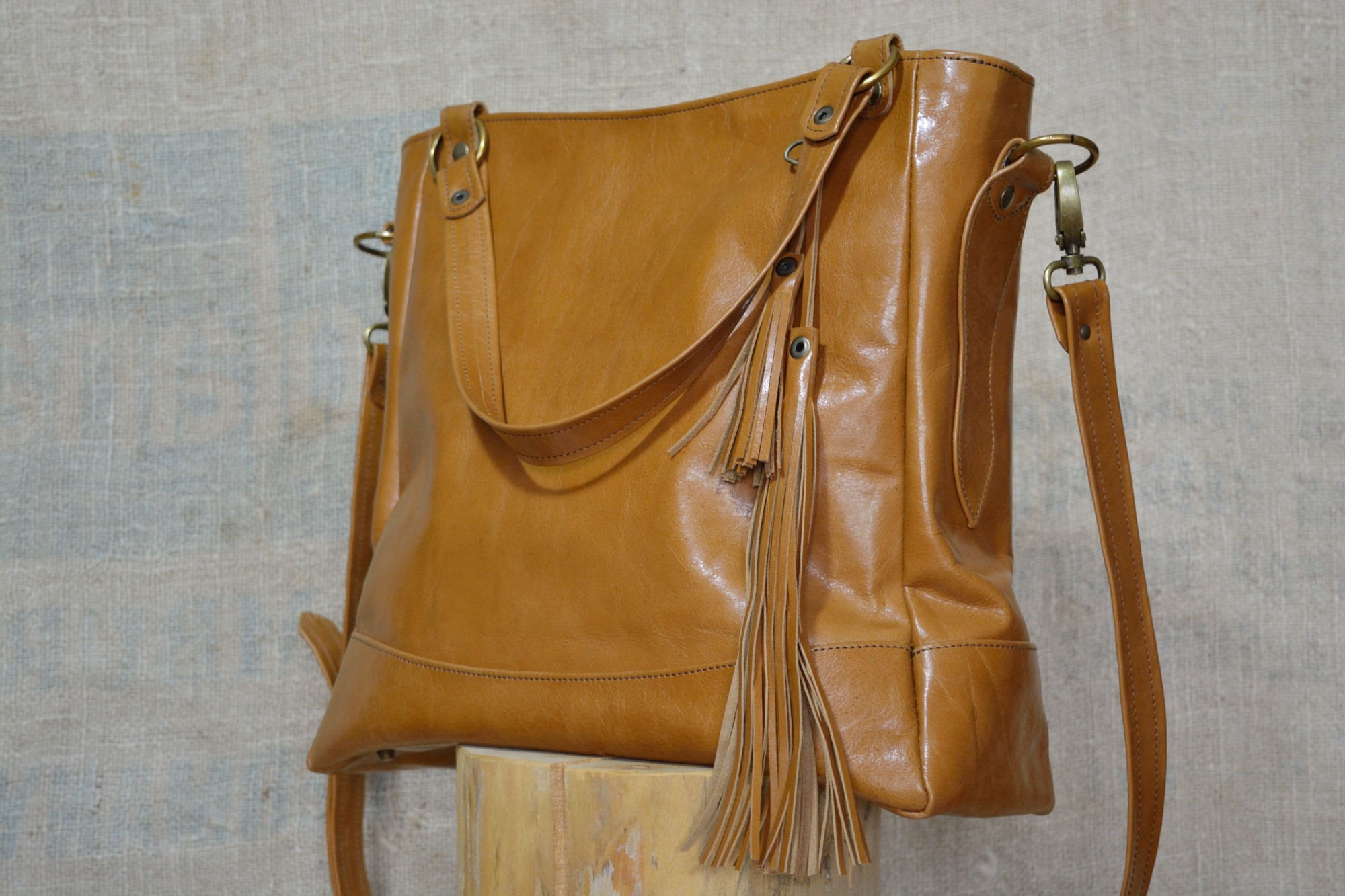 Kožená kabelka Paris je uzavíratelná z vrchní strany na zip. Zvenčí zezadu je na kabelce našitá ještě jedna kapsa na zip a zepředu jsou na držátku do ruky pověšené pomocí karabinky dva ozdobné střapce. Aby se dno kabelky při manipulaci tolik neopotřebovávalo je vyztuženo a chráněno kovovými nýty (puklemi).