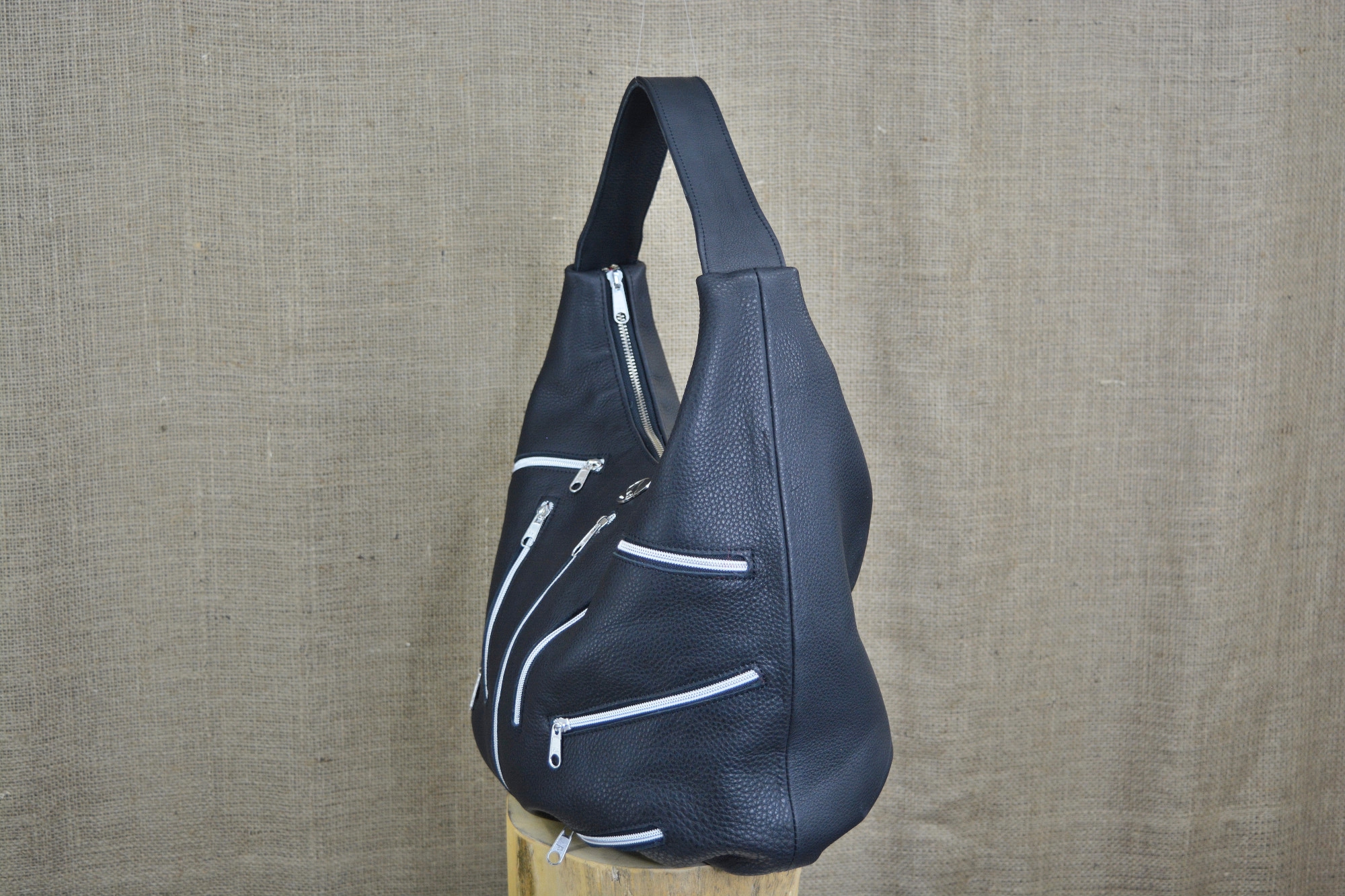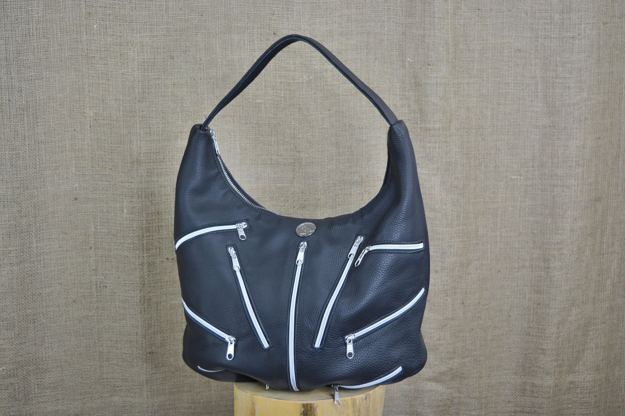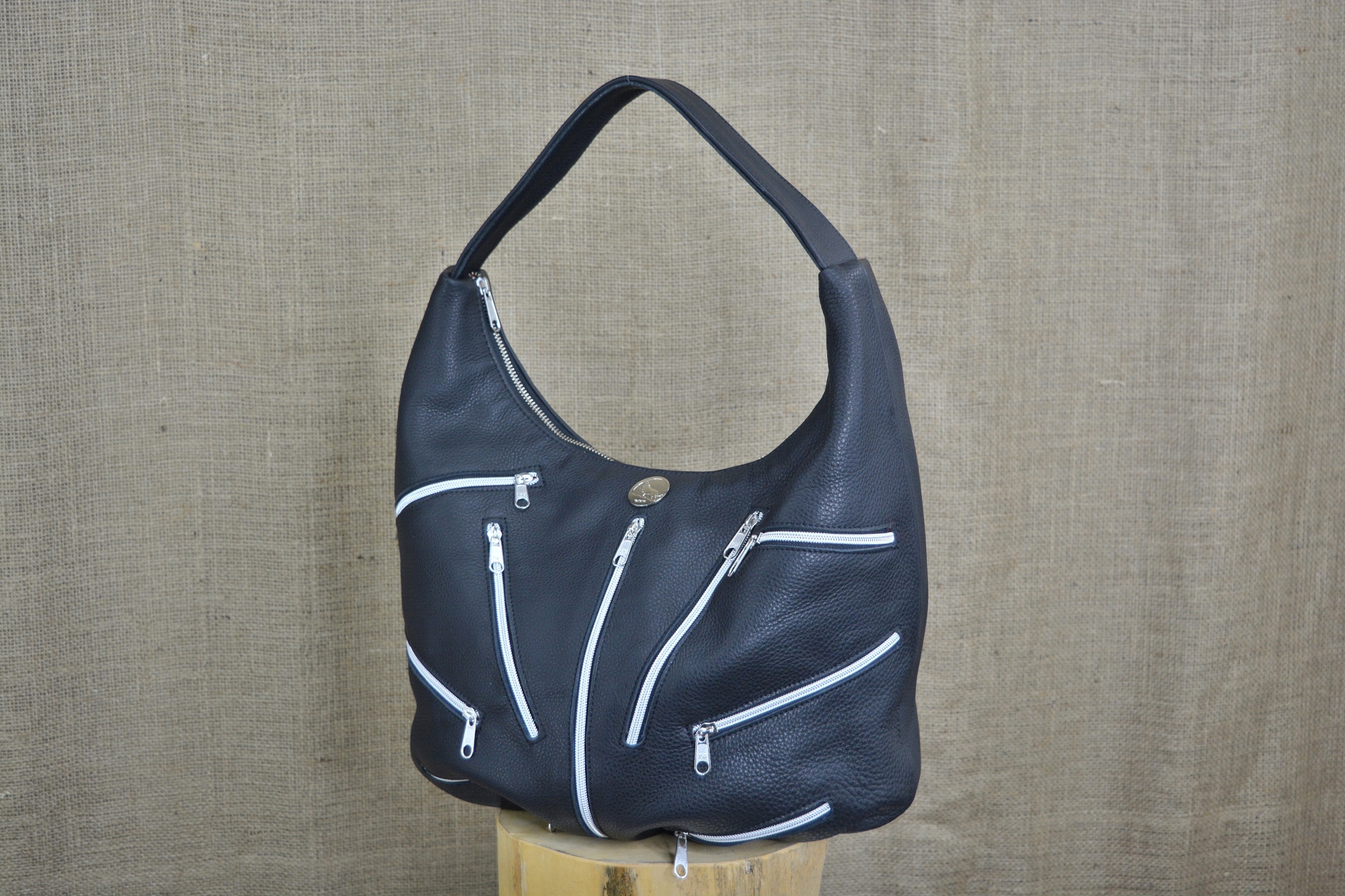 Dámská kožená kabelka Rebelka - kvalitní dámská kožená kabelka vyrobená ručně z pravé hovězí kůže. Kabelka má uvnitř jedno hlavní oddělení. Zevnitř na přední straně má našité ještě dvě malé volné kapsičky na drobnosti. Zevnitř na zadní straně se nachází jedna zipová kapsa z podšívky. Kabelka se ze shora uzavírá zipem. Po stranách kabelka plynule přechází do kratšího popruhu, pomocí kterého se kabelka nosí přes rameno. Zvenčí na přední straně je kabelka zdobená ozdobnými zipy. Tyto zipy slouží pouze jako ozdoba kabelky a nenachází se zde žádné funkční kapsy.