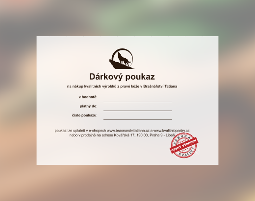 Dárkový poukaz na nákup zboží v Brašnářství Tatiana. Pokud chcete někoho obdarovat výrobkem z té nejkvalitnější pravé kůže, je dárkový poukaz do Brašnářství Tatiana tou správnou volbou.