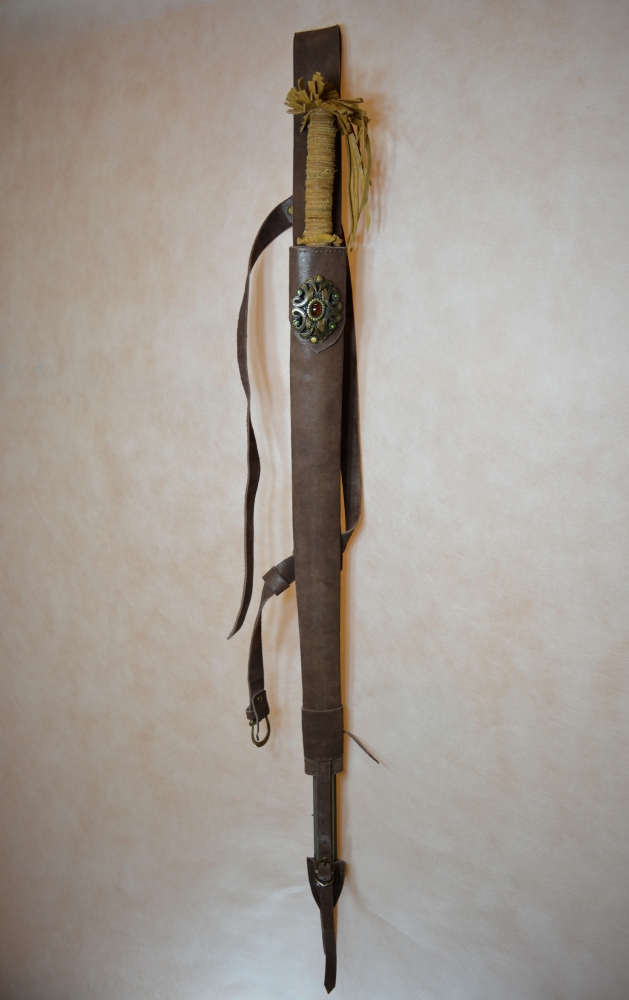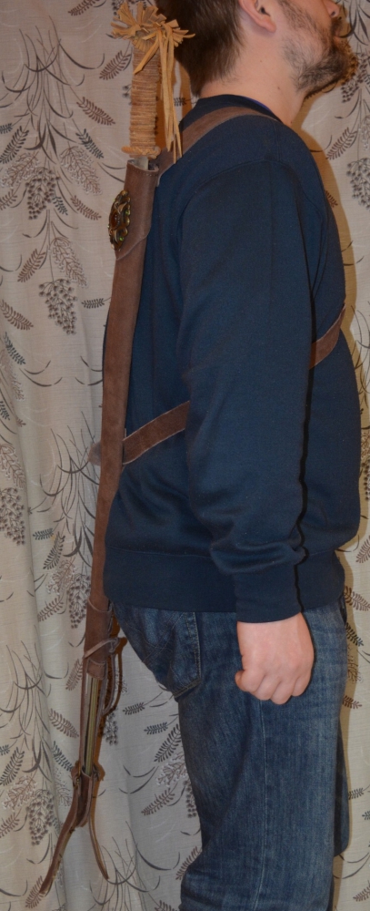 Součástí pochvy na meč jsou také kožené popruhy k pohodlnému nošení přes rameno. Popruhy se skládají ze tří dílů, které jsou vepředu spojeny ozdobným kovovým kroužkem.