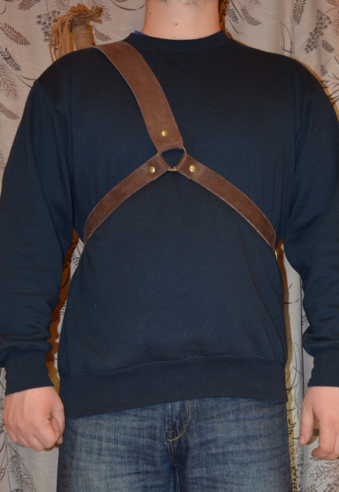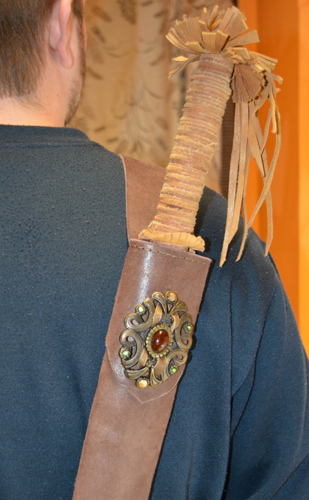 Součástí pochvy na meč jsou také kožené popruhy k pohodlnému nošení přes rameno. Popruhy se skládají ze tří dílů, které jsou vepředu spojeny ozdobným kovovým kroužkem.