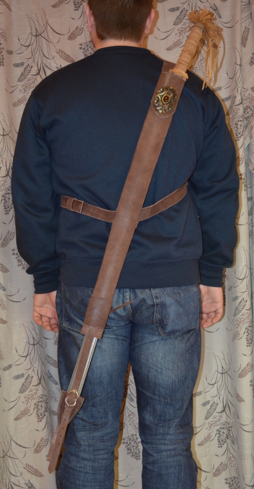 Součástí pochvy na meč jsou také kožené popruhy k pohodlnému nošení přes rameno. Popruhy se skládají ze tří dílů, které jsou vepředu spojeny ozdobným kovovým kroužkem.