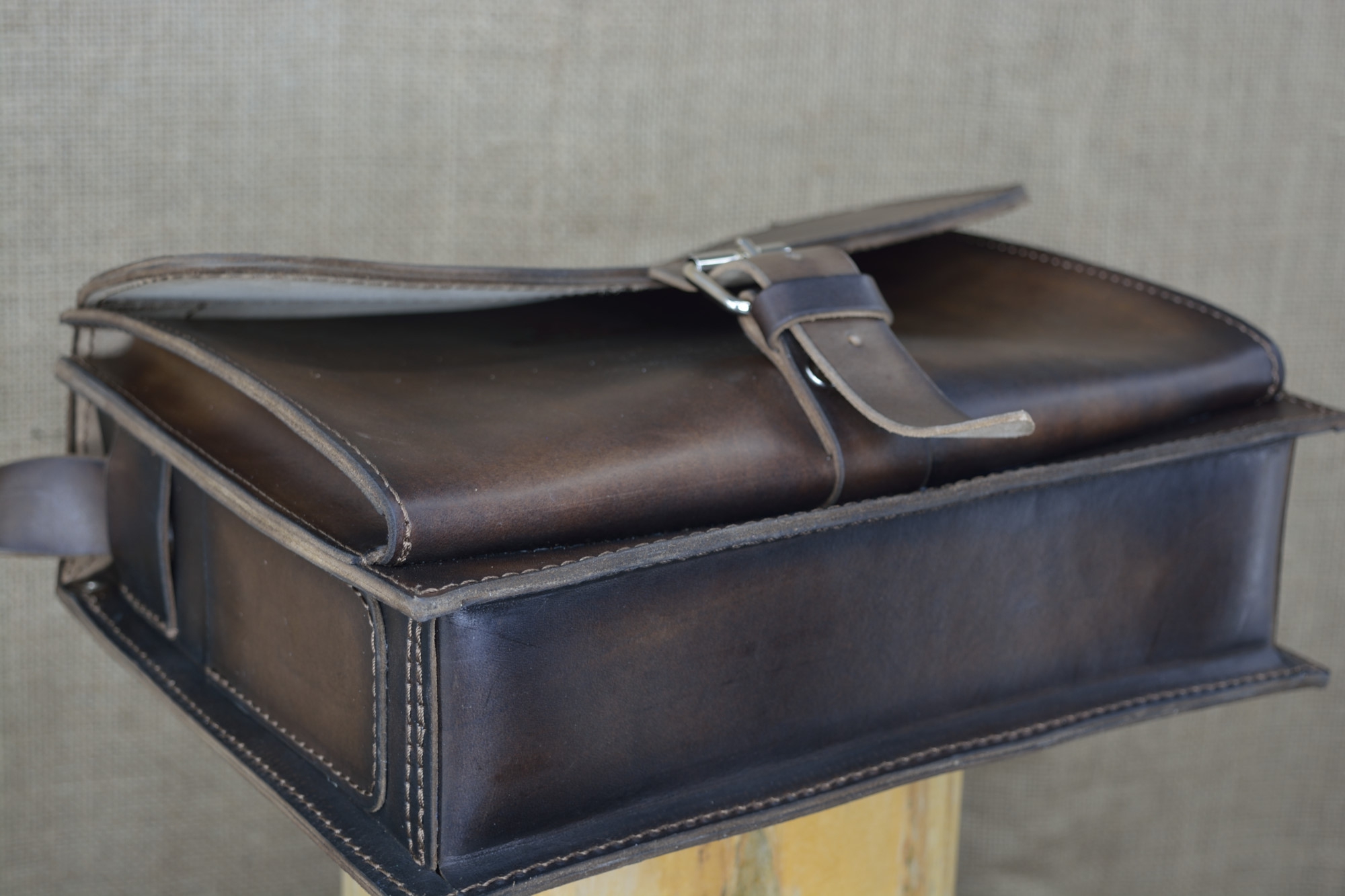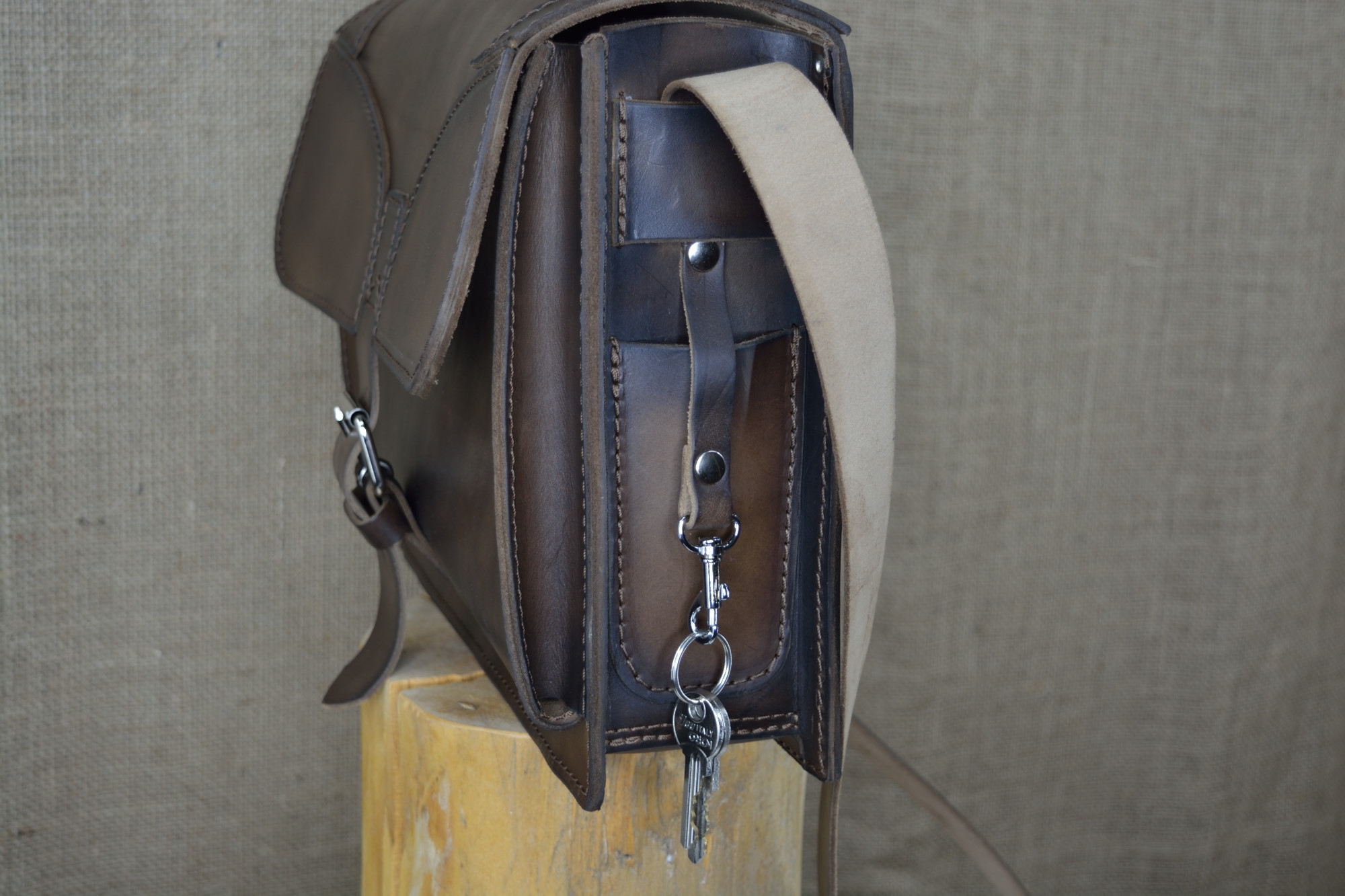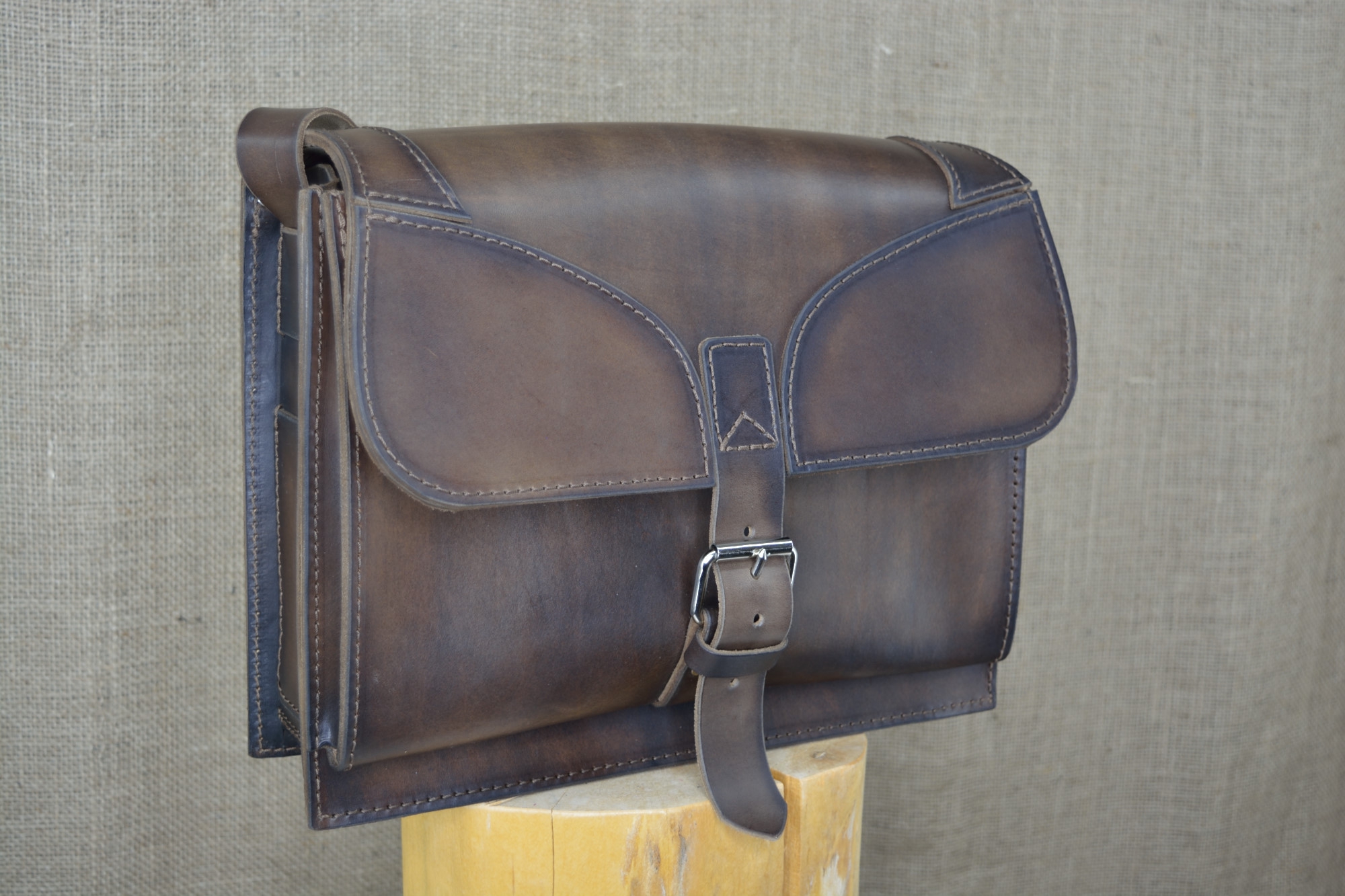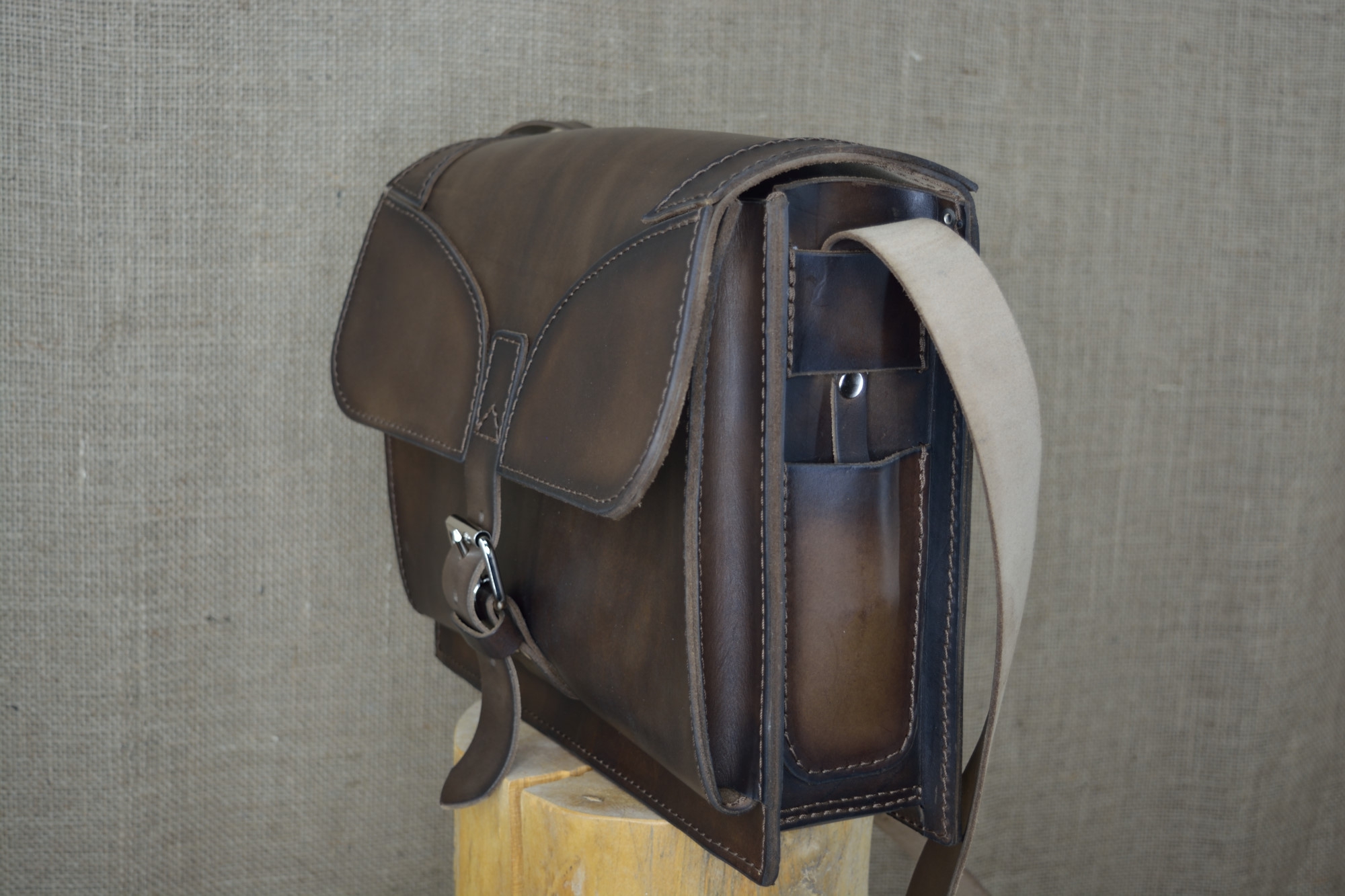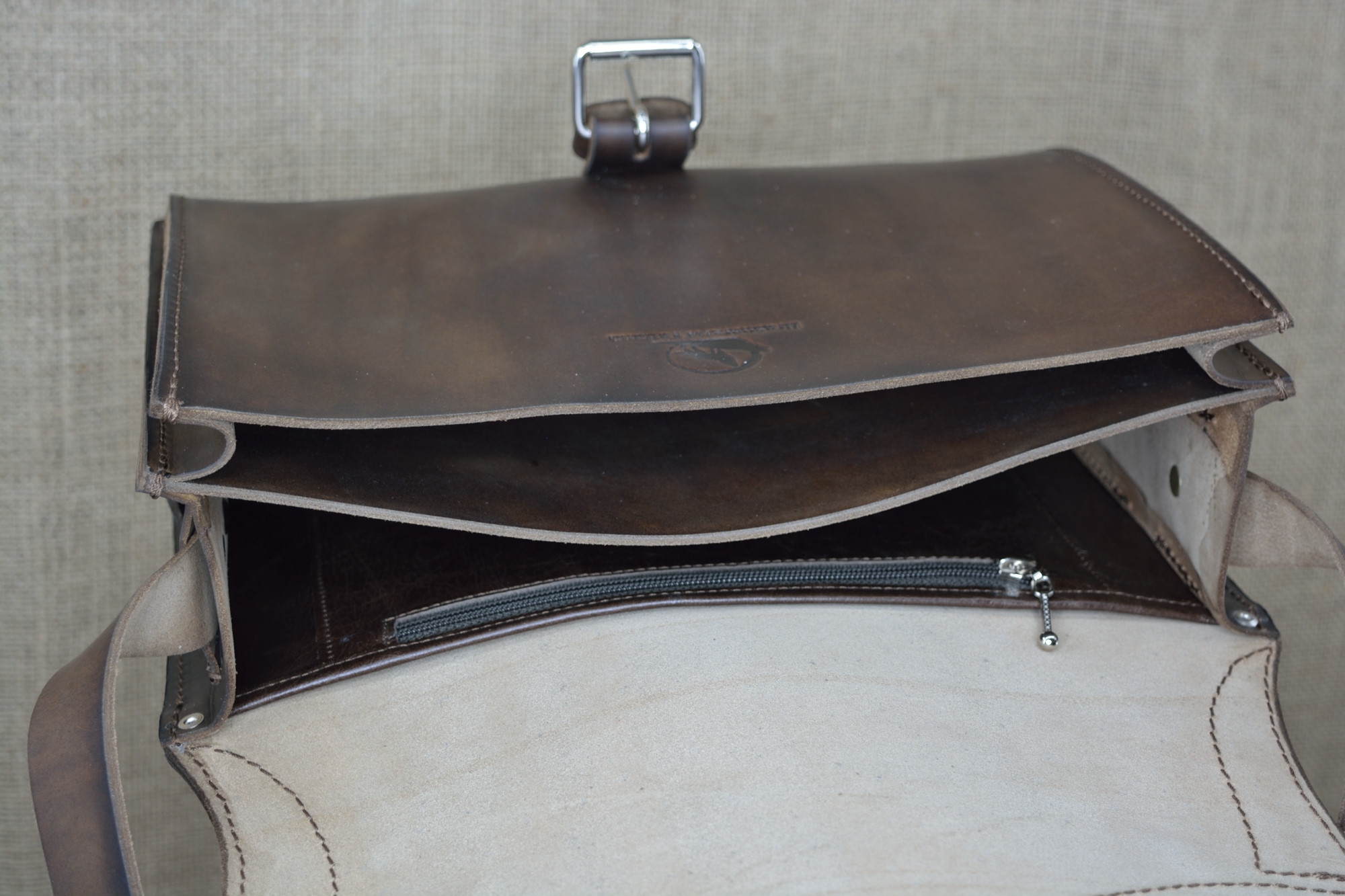 Kožená kabela Vážka A4 vyrobená z pravé hovězí kůže - hlazenice, která je ručně barvená. Kabela Vážka je vyrobená z kůže tlusté 2,5 mm. Uvnitř má kabela jedno hlavní oddělení, které má na zadní straně volnou kapsu, na které je našitá menší zipová kapsa. Na předním dílu má kabela ještě jednu velkou koženou kapsu. Celá kabela se uzavírá zdobenou klapnou, která je doplněna ozdobnými pruhy kůže a uzavírá se pomocí přezky. Kabela má po bocích našity ještě dvě malé funkční kapsičky a v jedné z nich má karabinku na klíče.