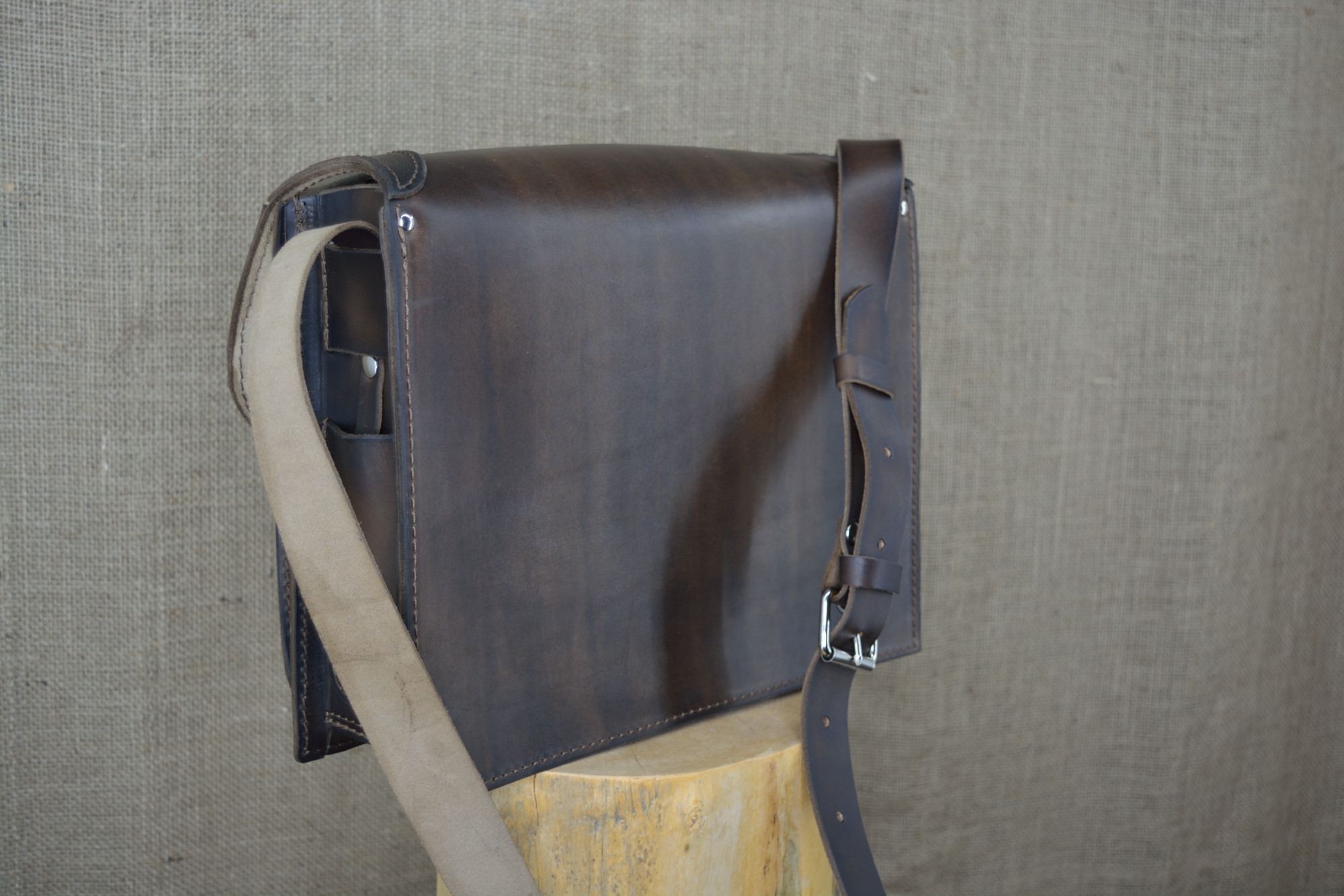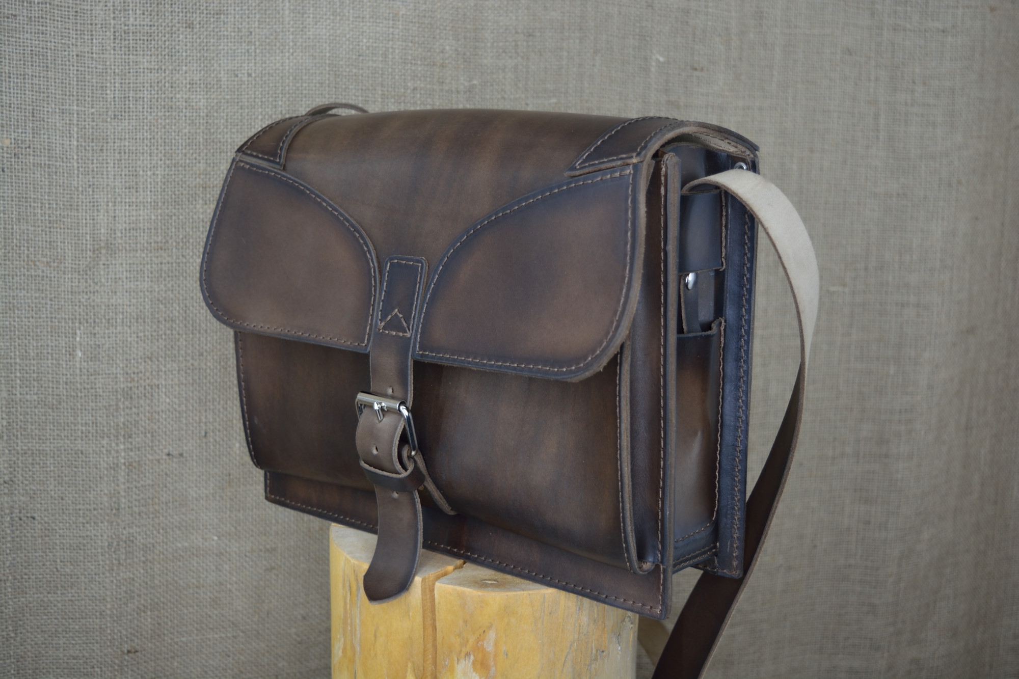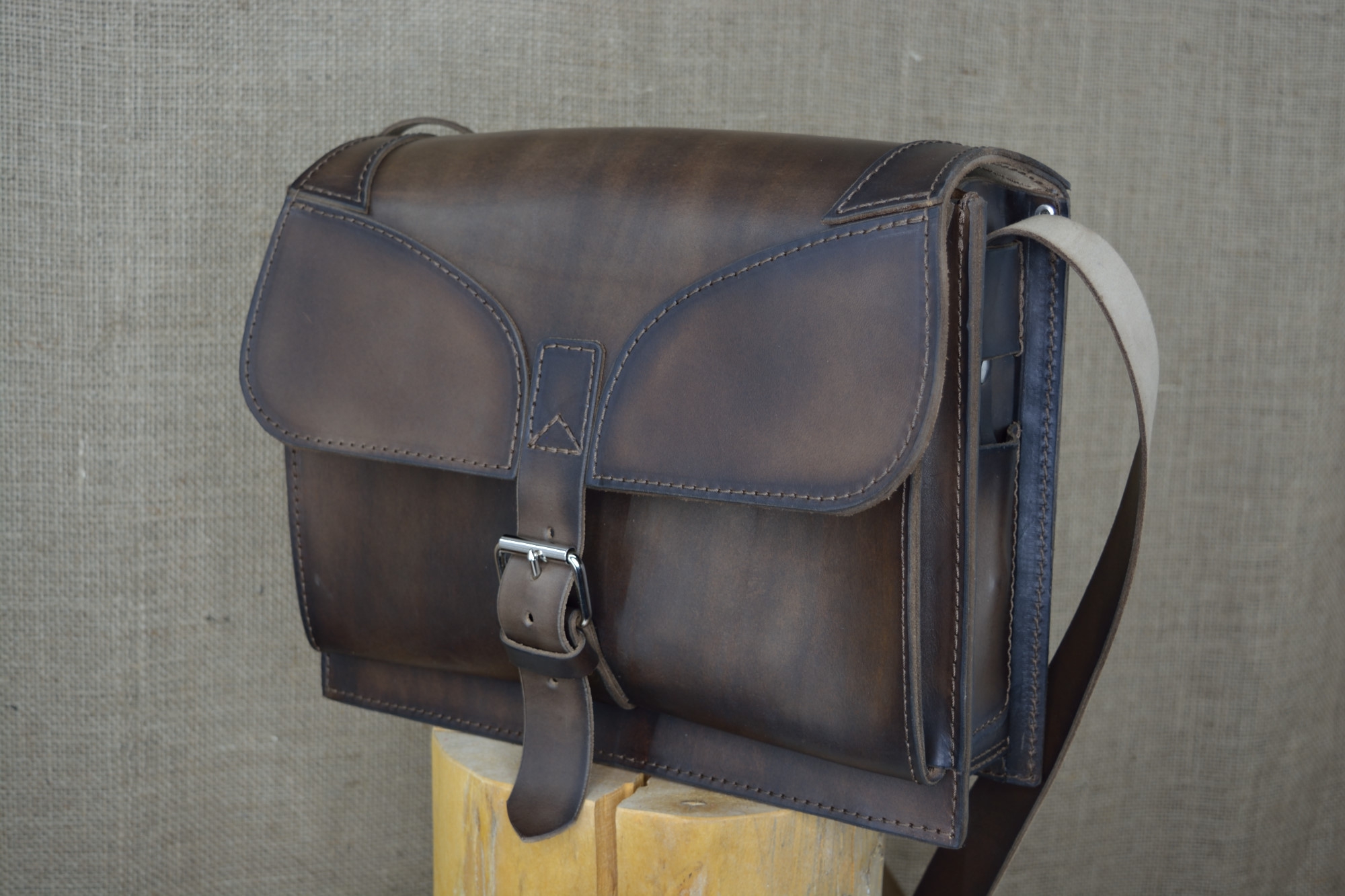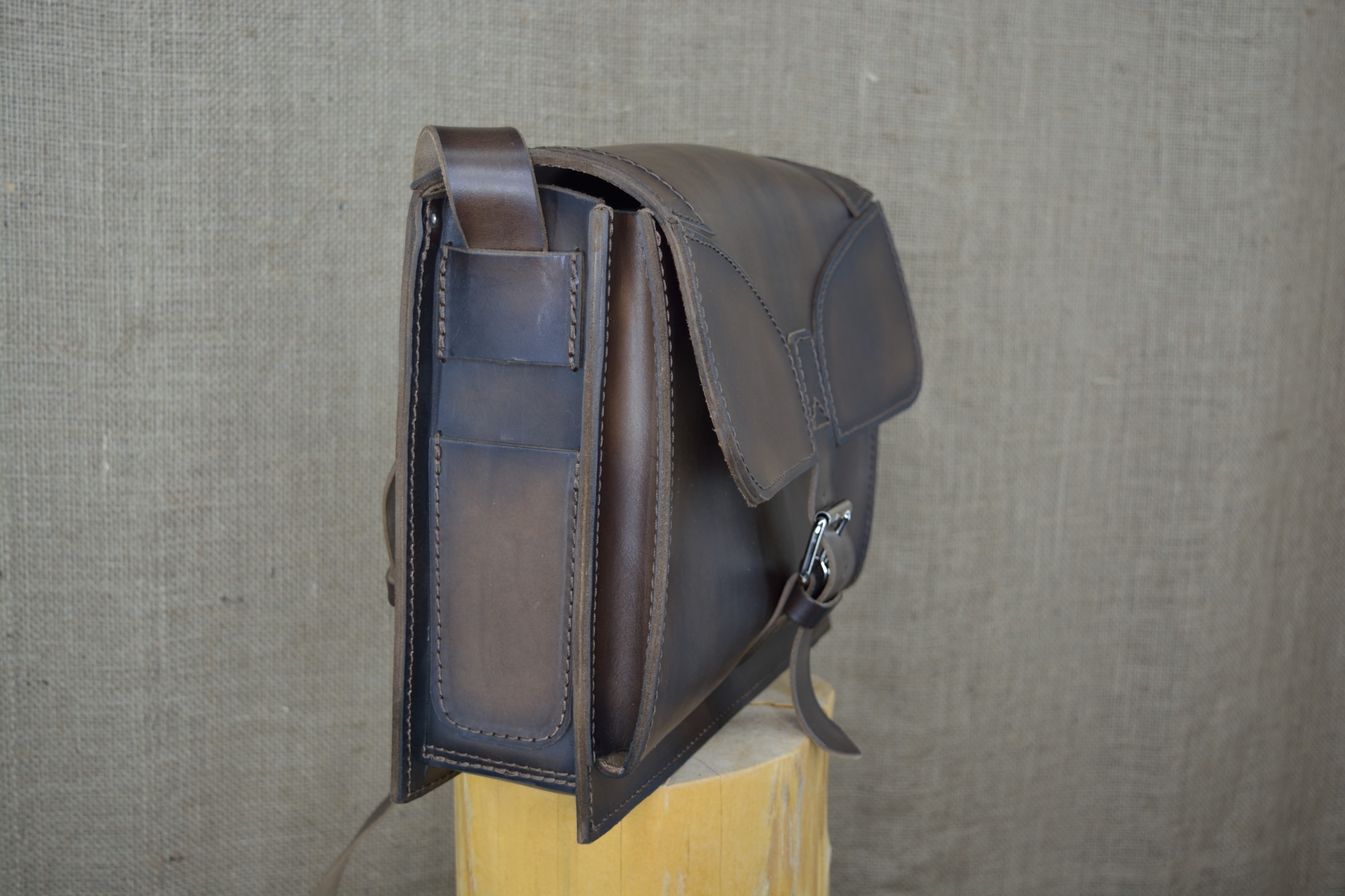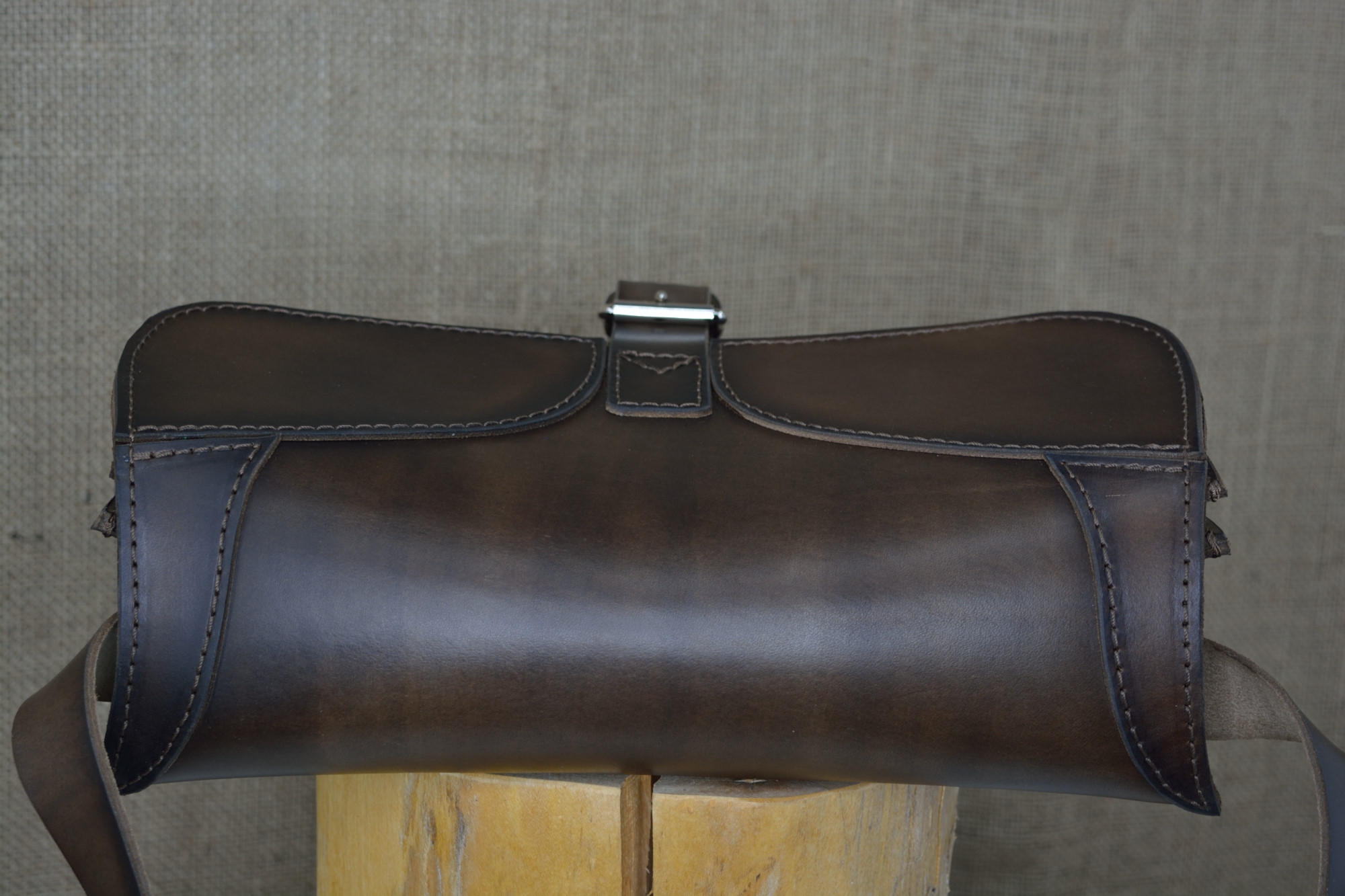 Kožená kabela Vážka A4 vyrobená z pravé hovězí kůže - hlazenice, která je ručně barvená. Kabela Vážka je vyrobená z kůže tlusté 2,5 mm. Uvnitř má kabela jedno hlavní oddělení, které má na zadní straně volnou kapsu, na které je našitá menší zipová kapsa. Na předním dílu má kabela ještě jednu velkou koženou kapsu. Celá kabela se uzavírá zdobenou klapnou, která je doplněna ozdobnými pruhy kůže a uzavírá se pomocí přezky. Kabela má po bocích našity ještě dvě malé funkční kapsičky a v jedné z nich má karabinku na klíče.