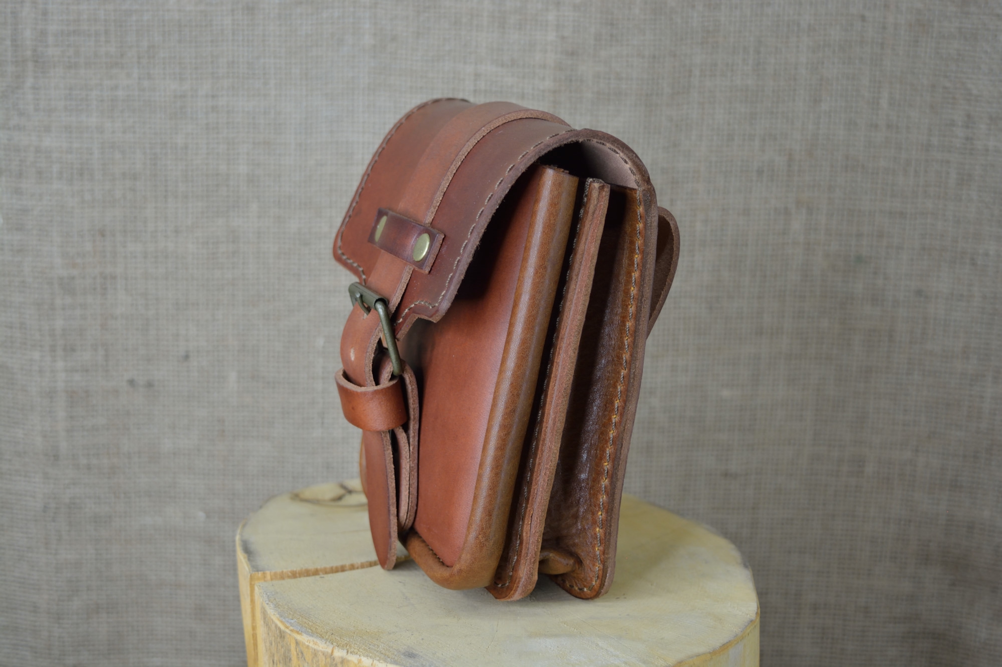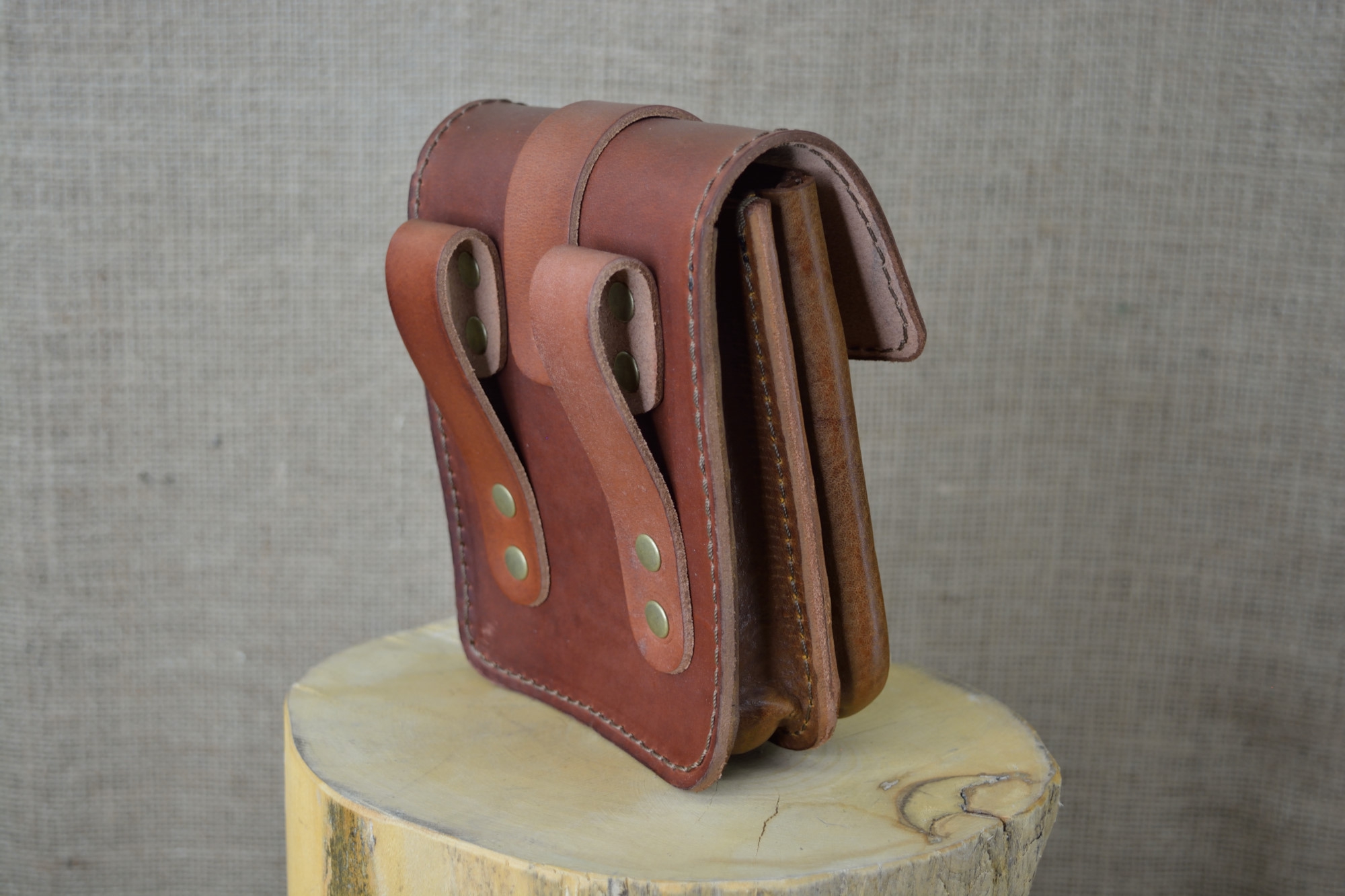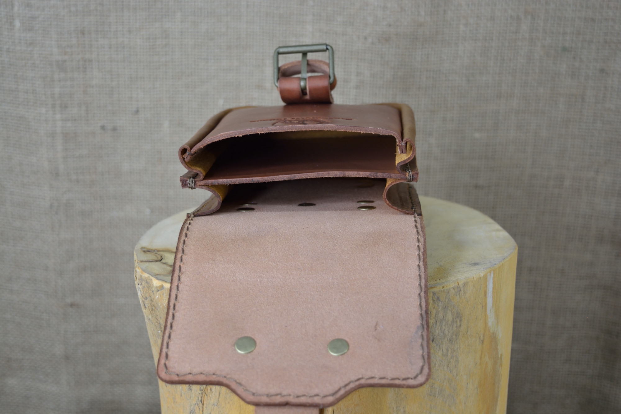 Kožená kapsa dvojitá na výšku na přezku ozdobná střední - kvalitní kožená kapsa vyrobená ručně z pravé hovězí kůže. Kožená kapsa se skládá ze dvou přihrádek. Zapínání kapsy je řešeno pomocí klapny na přezku. Na klapně je nanýtován ozdobný puh kůže a je ozdobně řezaná. Na zadní straně má dvě kožená poutka pro uchycení na opasek.