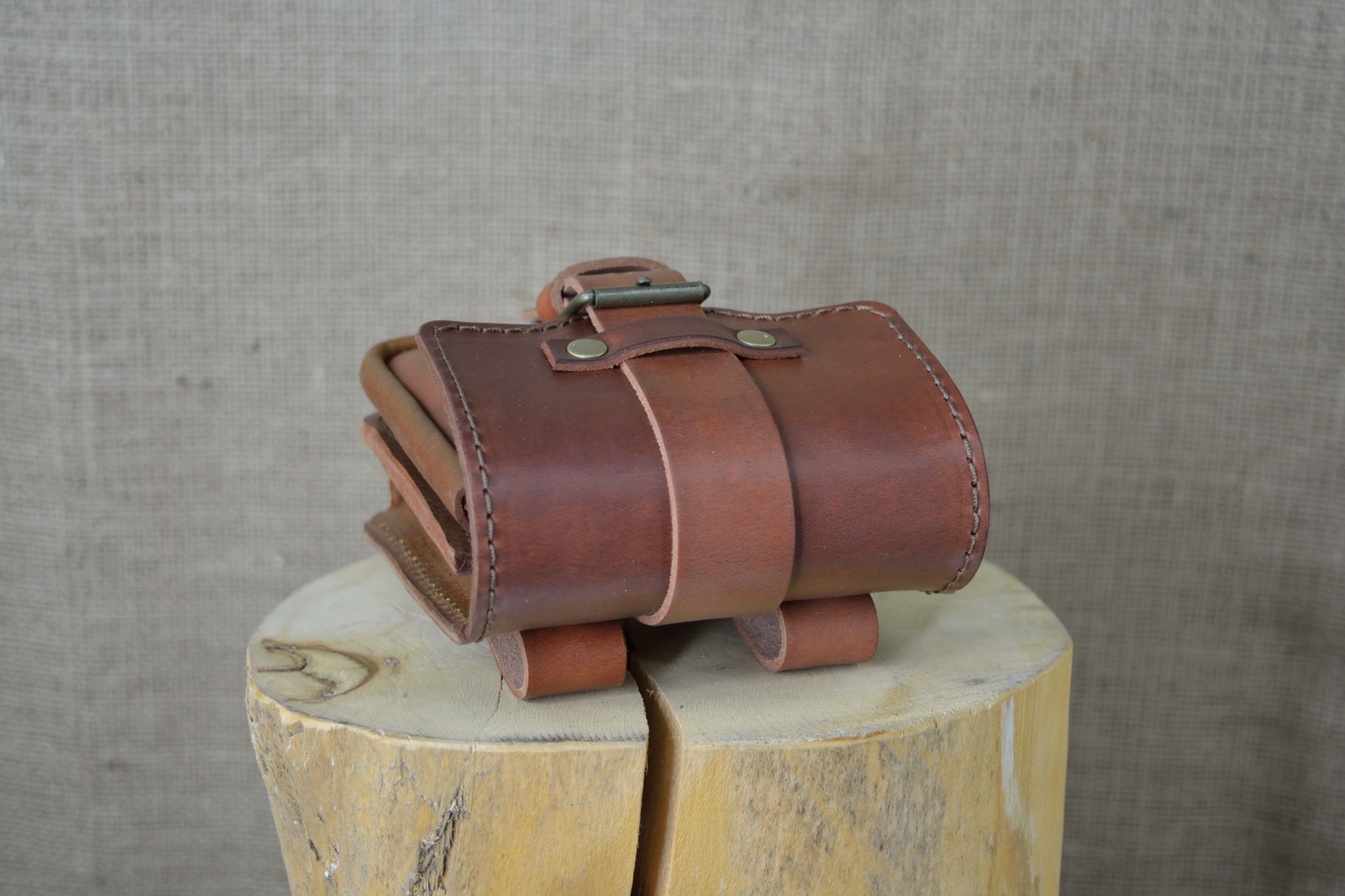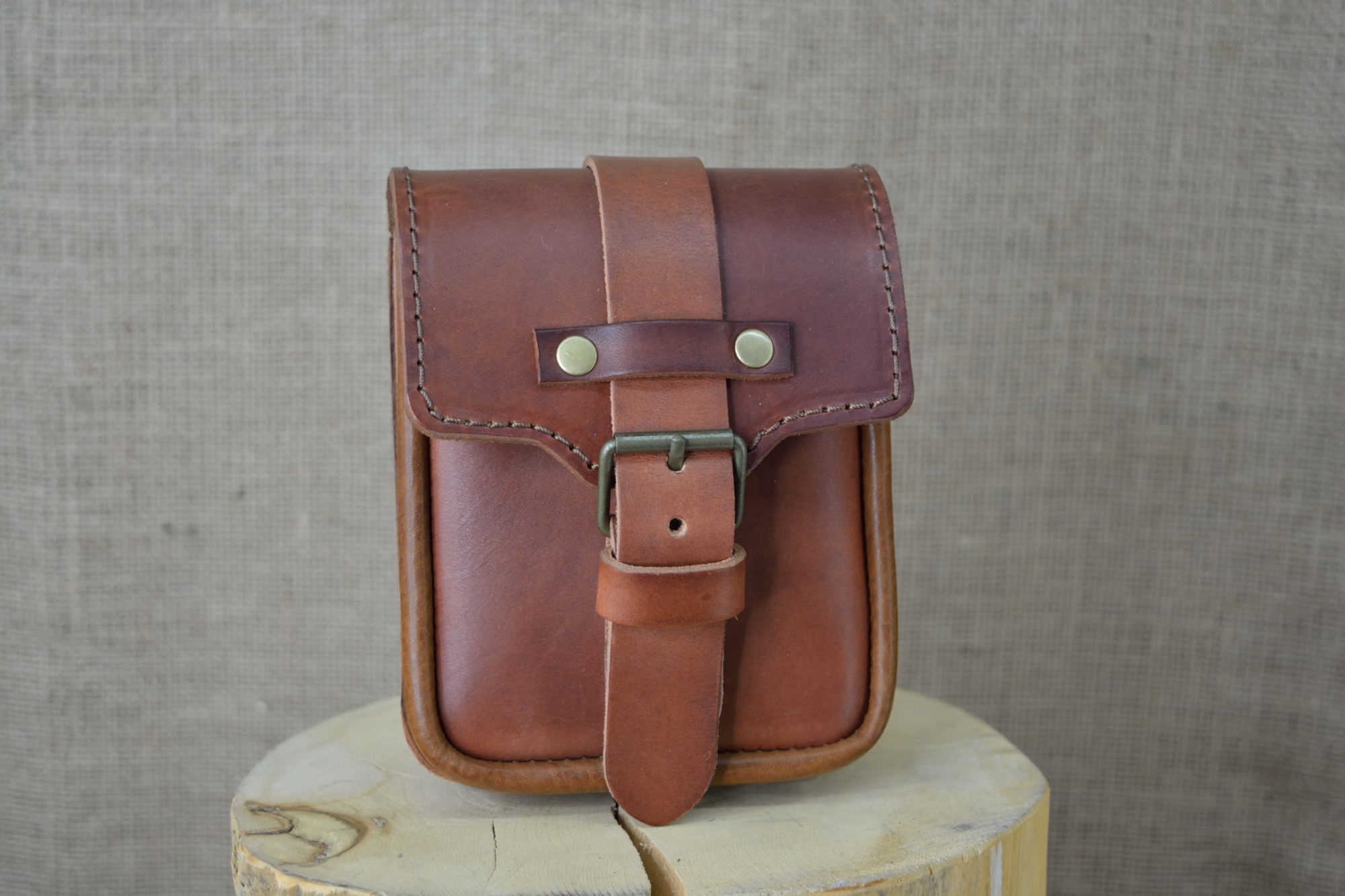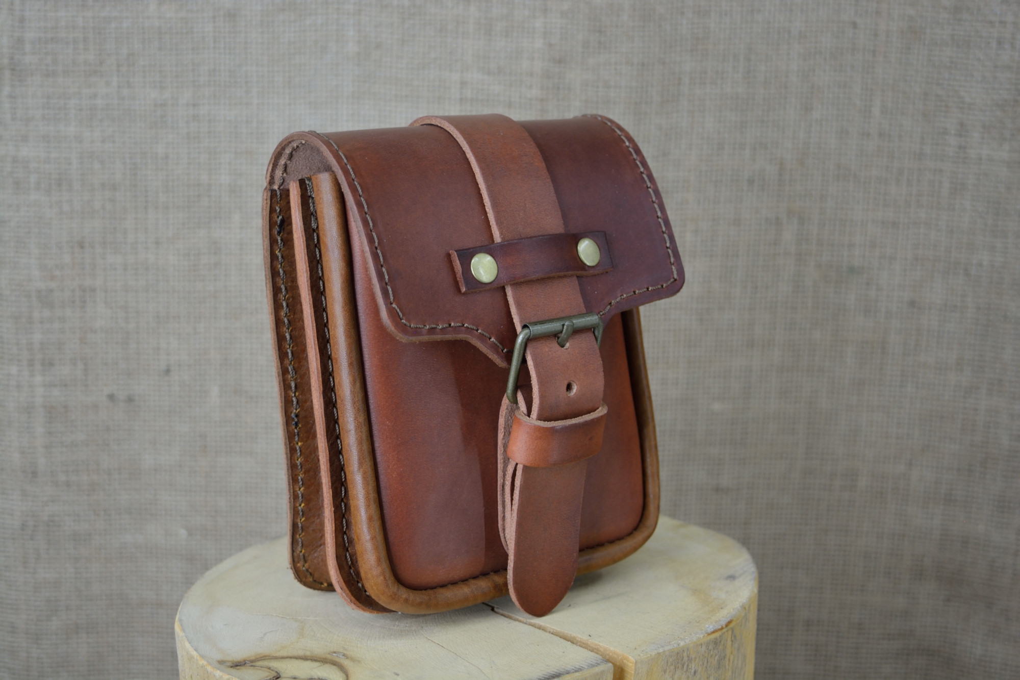 Kožená kapsa dvojitá na výšku na přezku ozdobná střední - kvalitní kožená kapsa vyrobená ručně z pravé hovězí kůže. Kožená kapsa se skládá ze dvou přihrádek. Zapínání kapsy je řešeno pomocí klapny na přezku. Na klapně je nanýtován ozdobný puh kůže a je ozdobně řezaná. Na zadní straně má dvě kožená poutka pro uchycení na opasek.