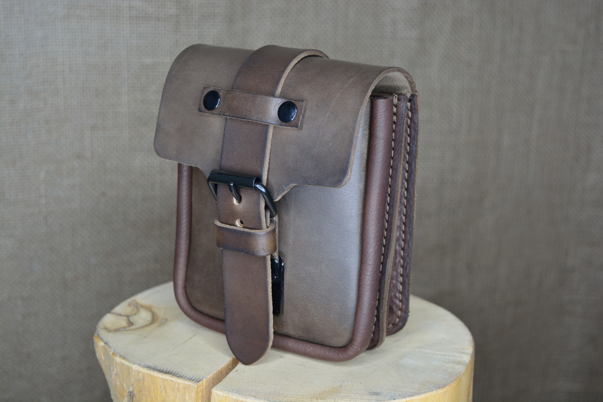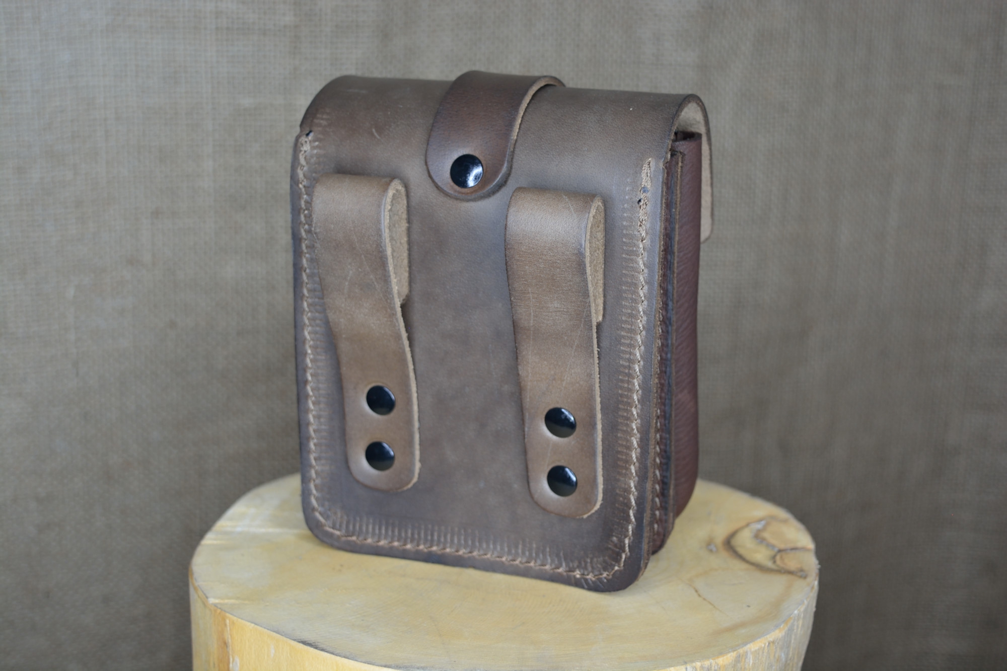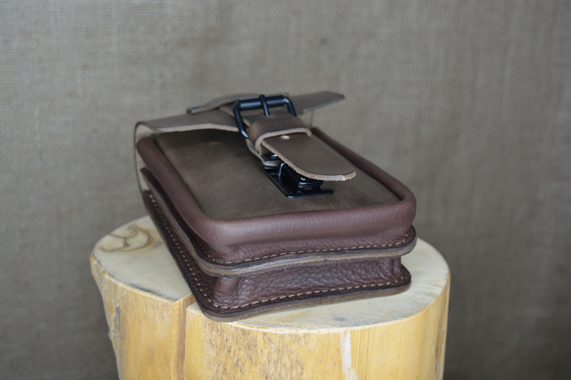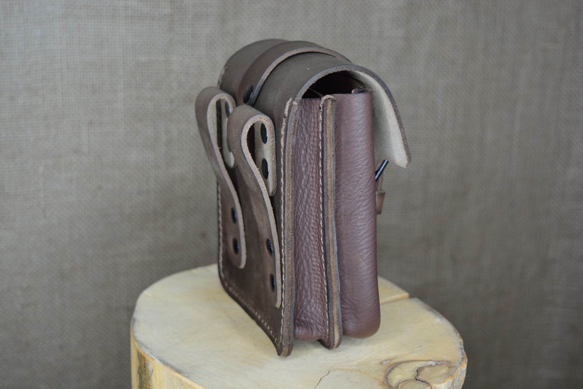 Kožená kapsa dvojitá na výšku s kombinovaným zapínáním ozdobná střední - kvalitní kožená kapsa vyrobená ručně z pravé hovězí kůže. Kožená kapsa se skládá ze dvou přihrádek. Zapínání kapsy je řešeno pomocí kombinace kovového zámečku a přezky. Na klapně je nanýtován ozdobný puh kůže a je ozdobně řezaná. Na zadní straně má dvě kožená poutka pro uchycení na opasek.