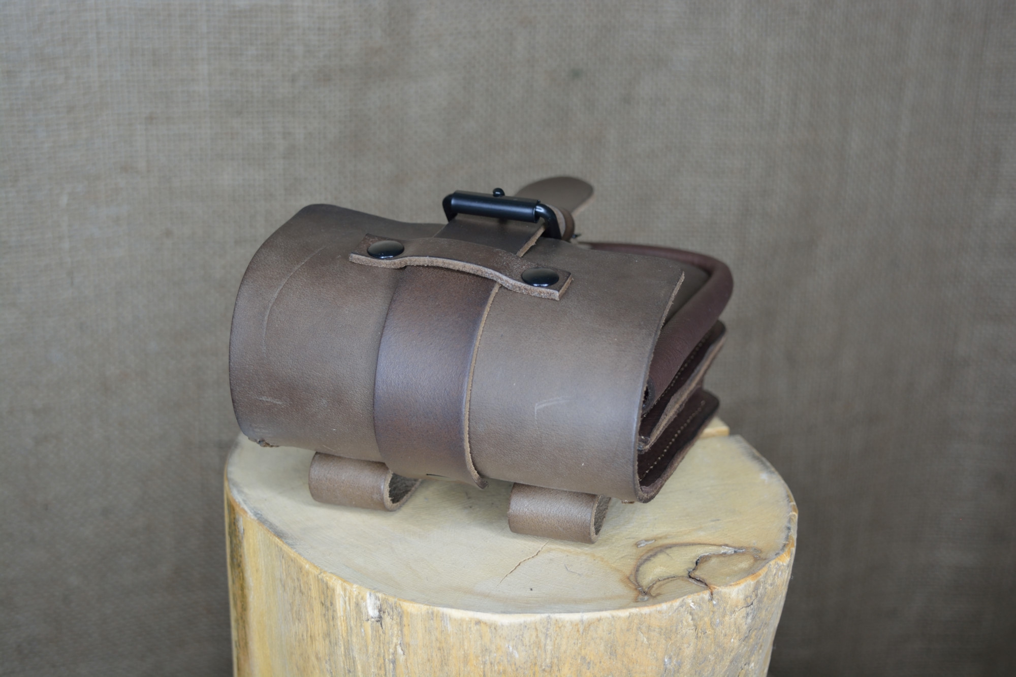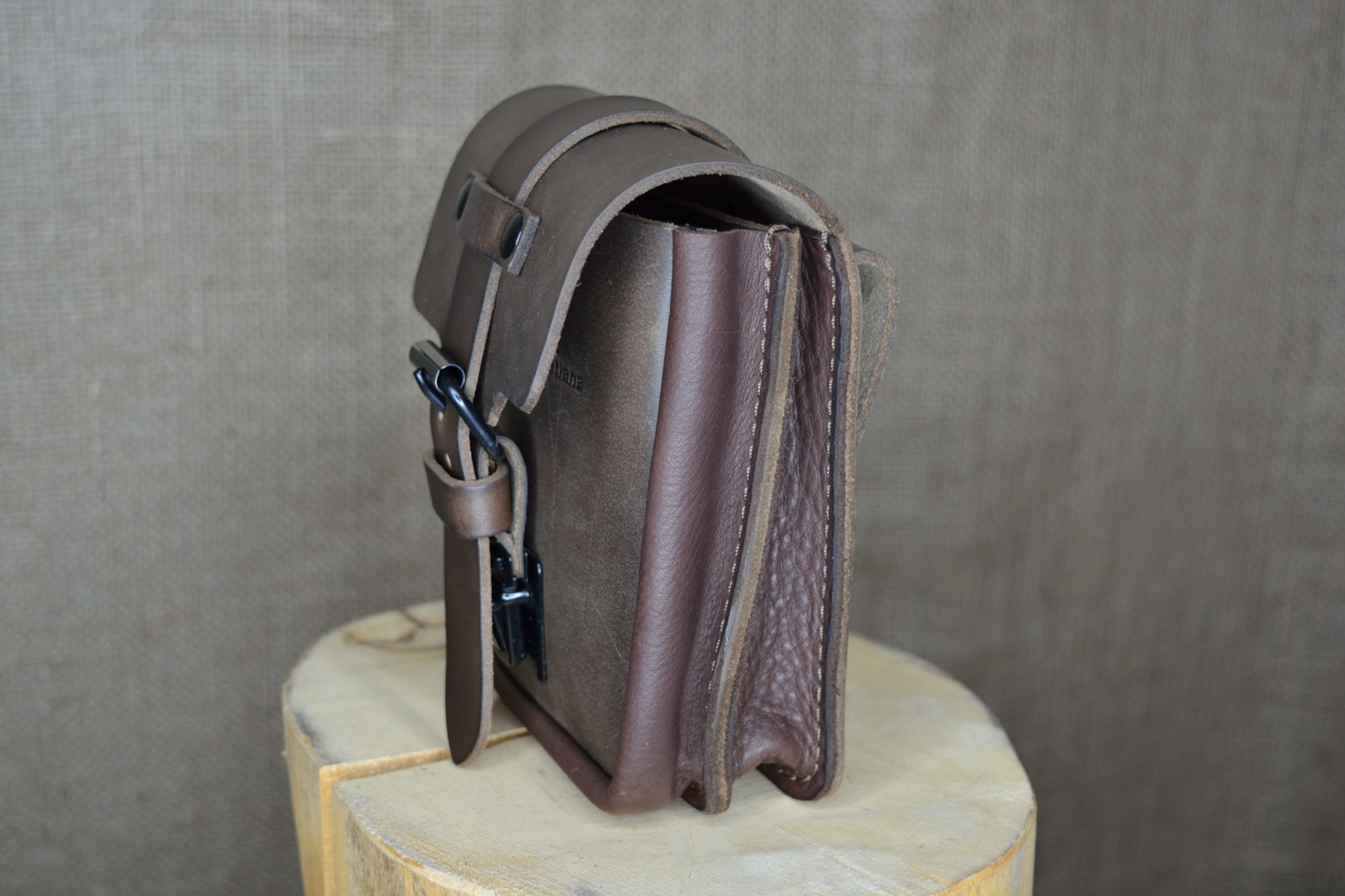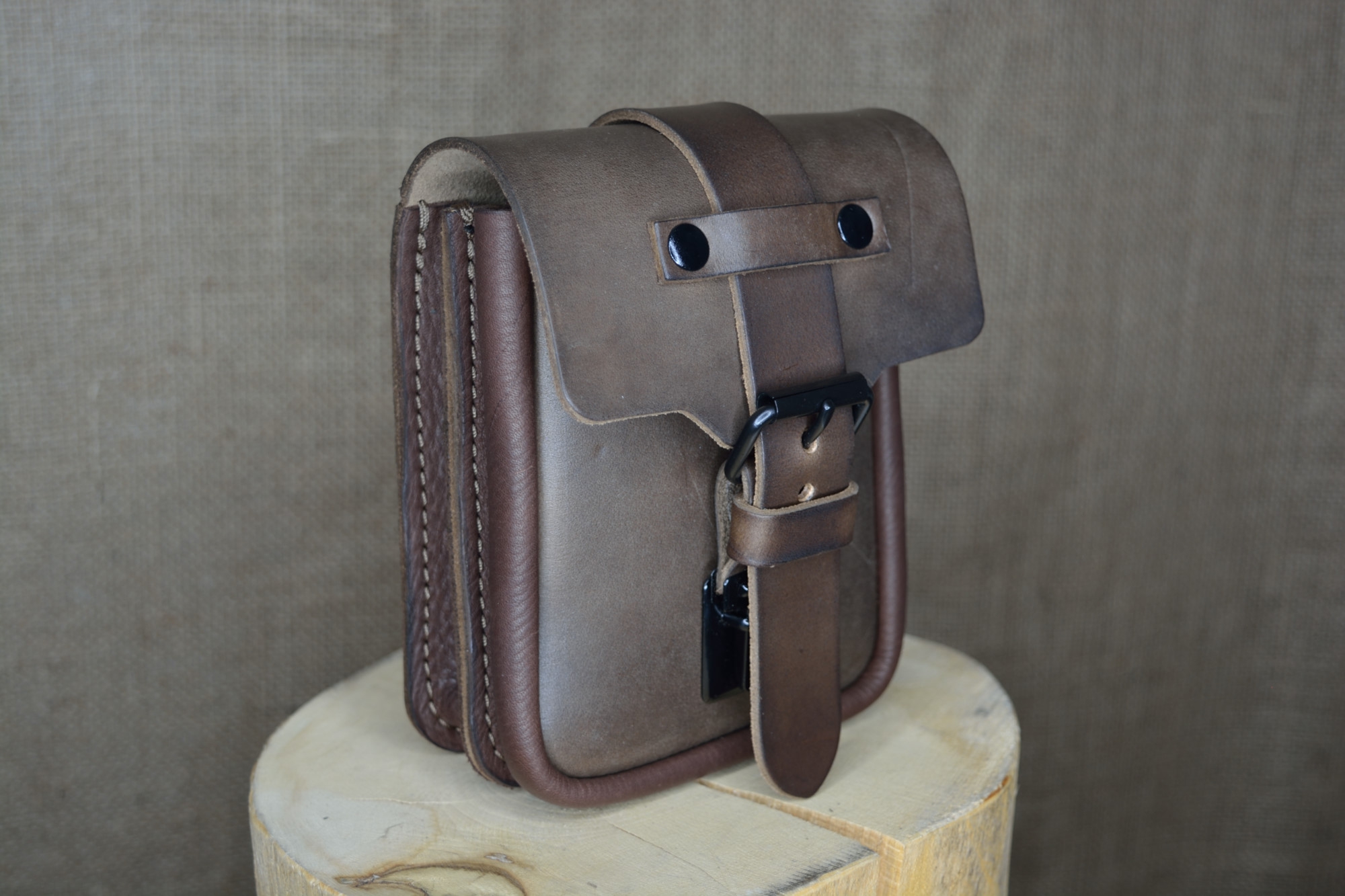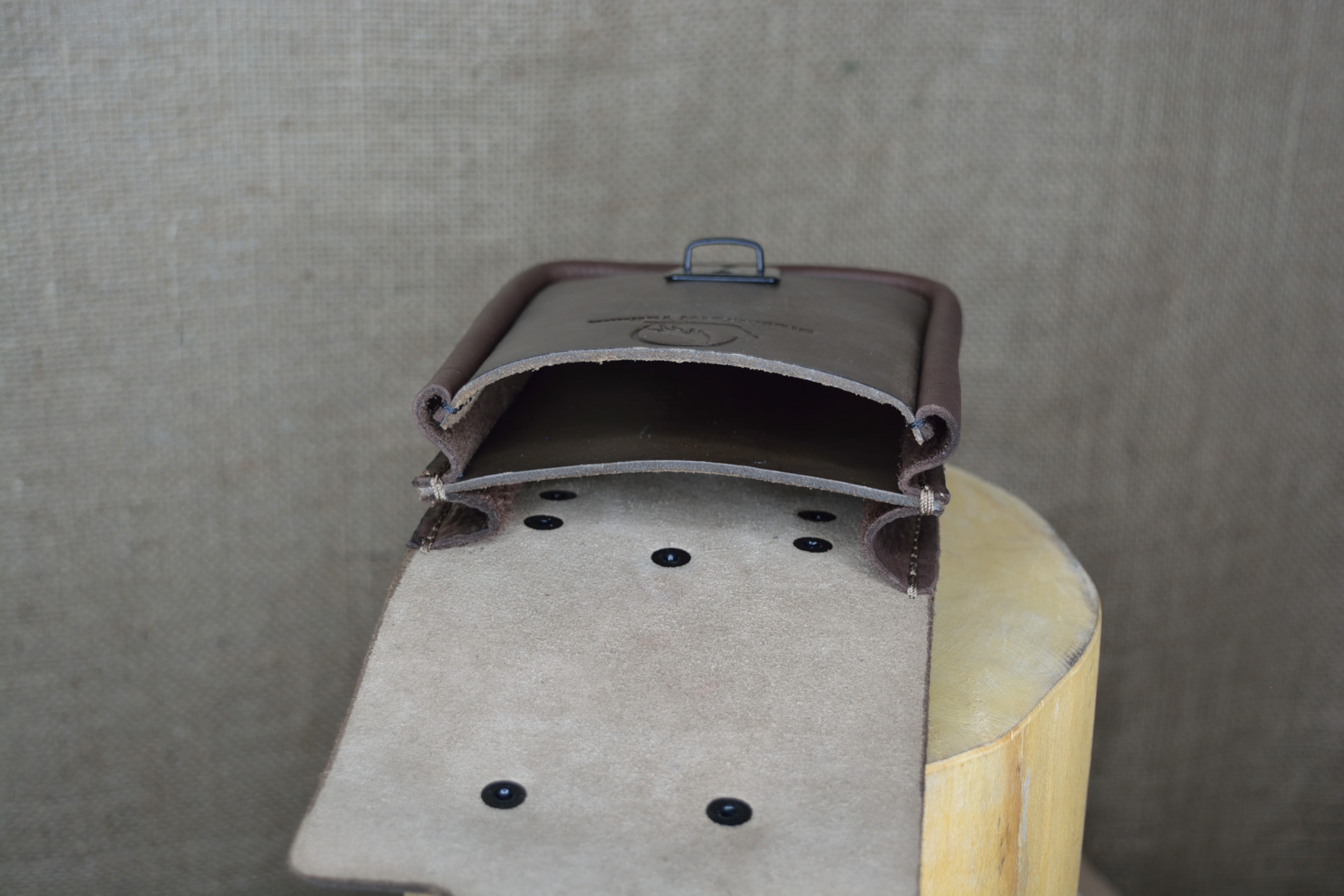 Kožená kapsa dvojitá na výšku s kombinovaným zapínáním ozdobná střední - kvalitní kožená kapsa vyrobená ručně z pravé hovězí kůže. Kožená kapsa se skládá ze dvou přihrádek. Zapínání kapsy je řešeno pomocí kombinace kovového zámečku a přezky. Na klapně je nanýtován ozdobný puh kůže a je ozdobně řezaná. Na zadní straně má dvě kožená poutka pro uchycení na opasek.