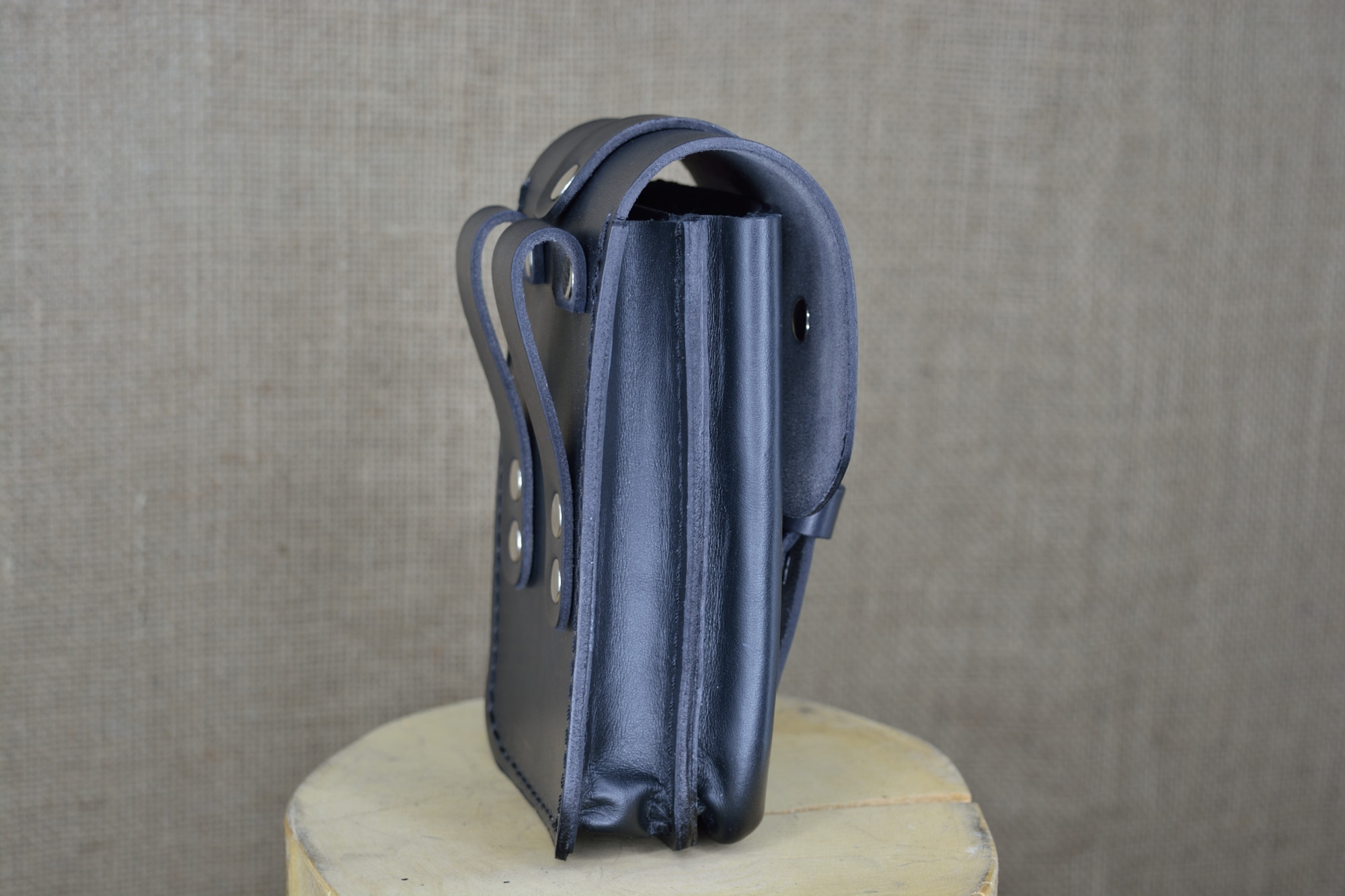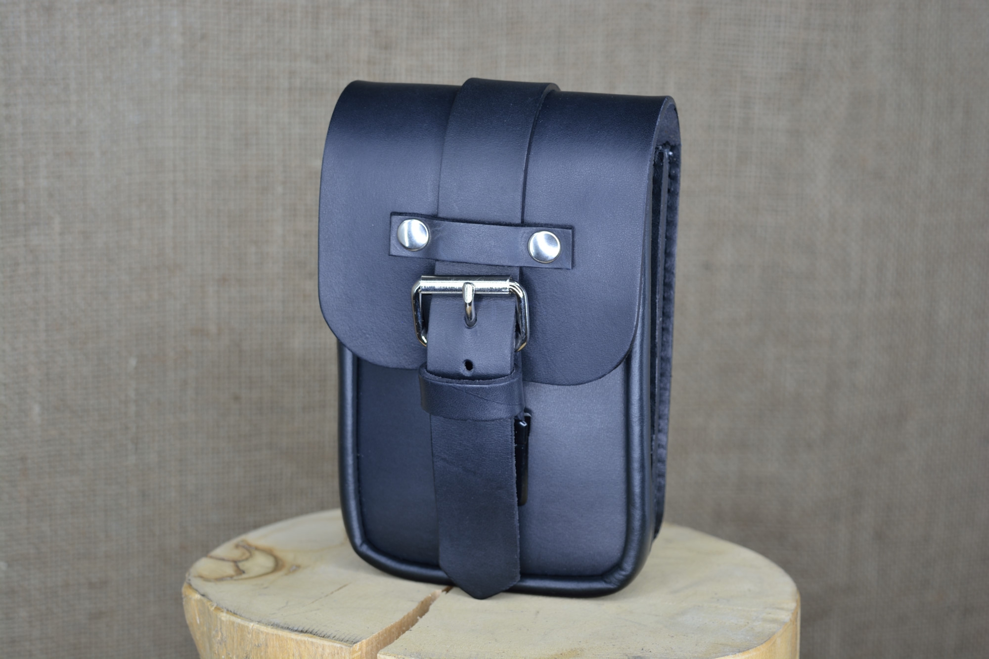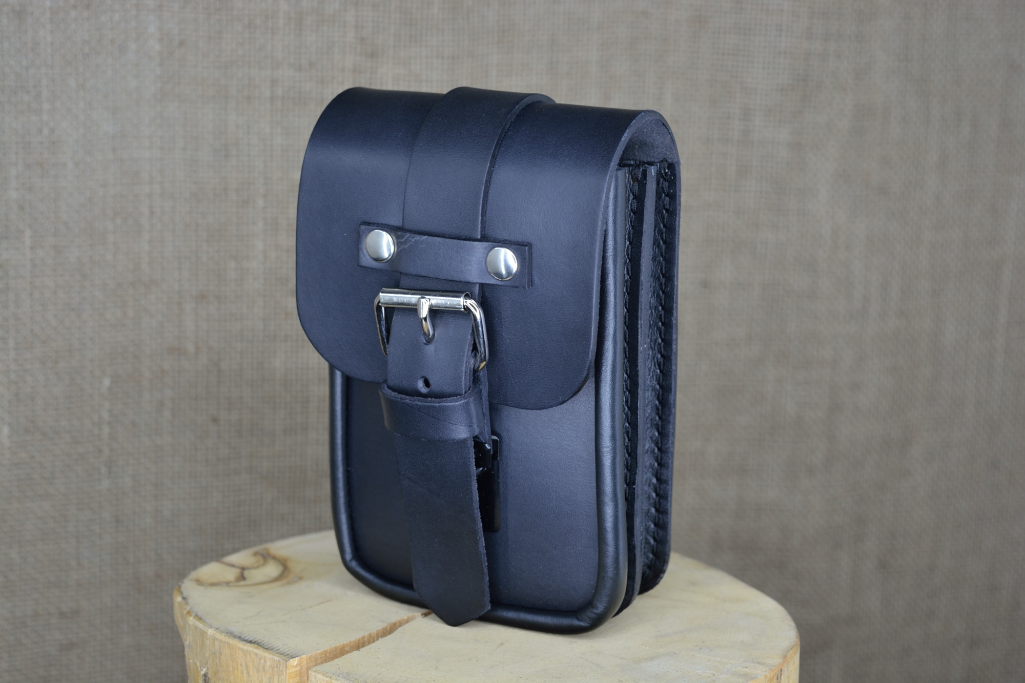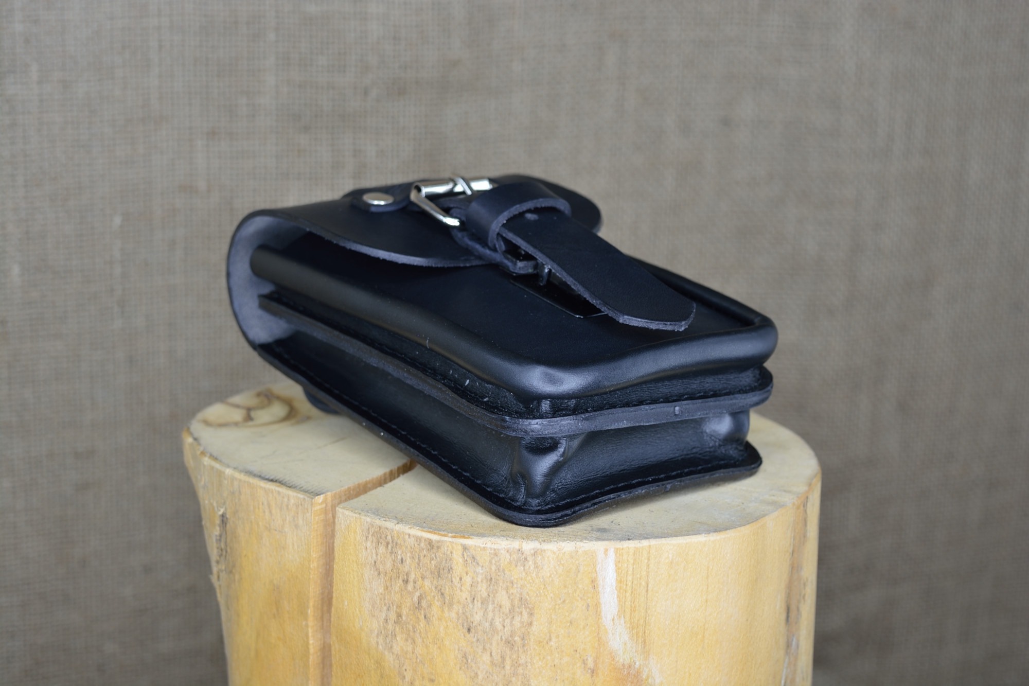 Kožená kapsa dvojitá na výšku s kombinovaným zapínáním ozdobná větší - kvalitní kožená kapsa vyrobená ručně z pravé hovězí kůže. Kožená kapsa se skládá ze dvou přihrádek. Zapínání kapsy je řešeno pomocí kombinace kovového zámečku a přezky. Na klapně je nanýtován ozdobný puh kůže. Na zadní straně má dvě kožená poutka pro uchycení na opasek.