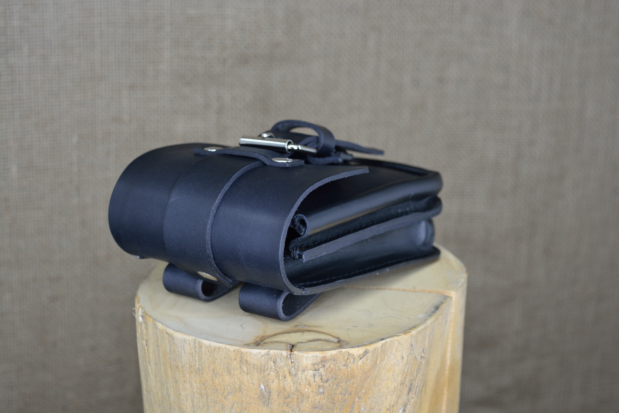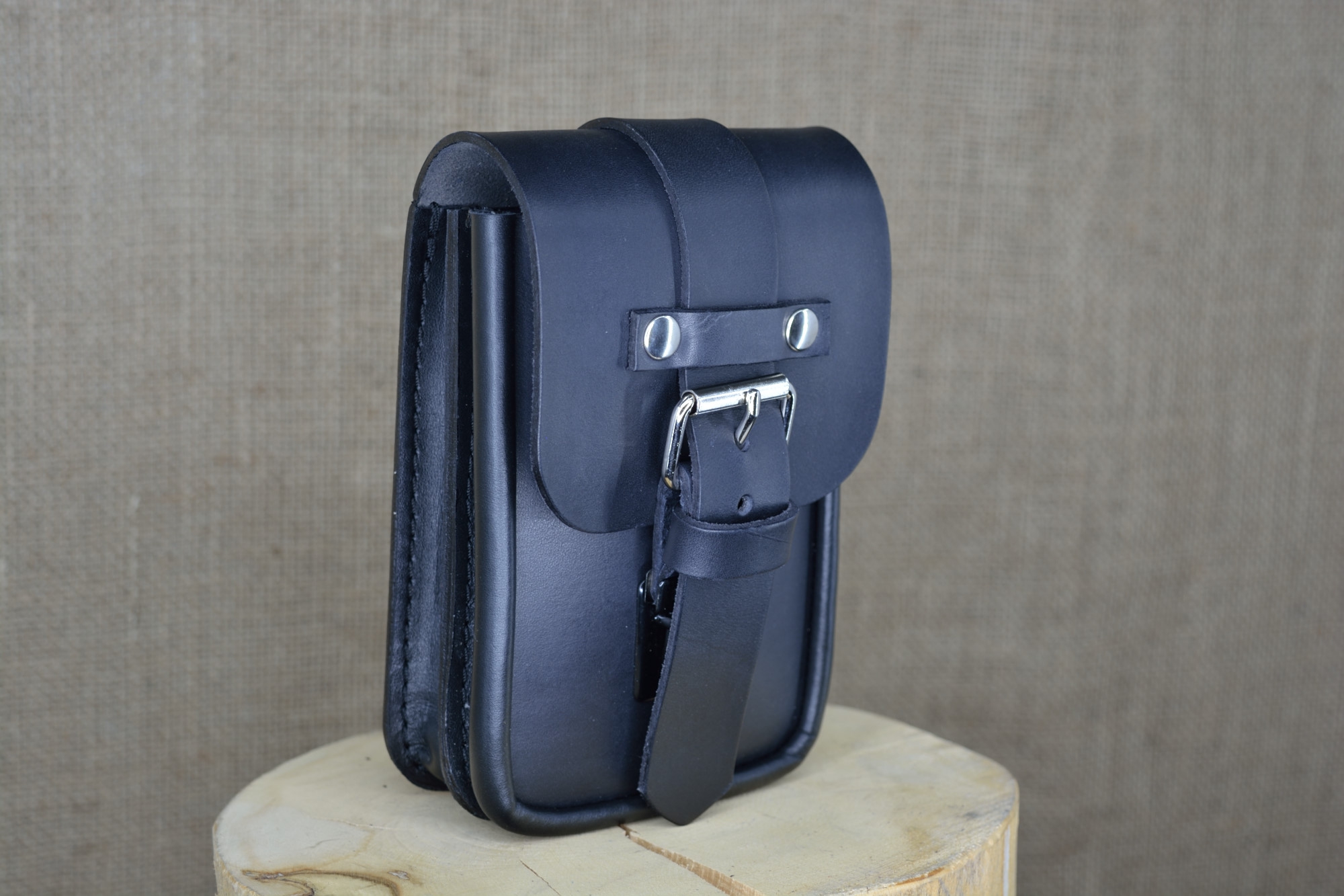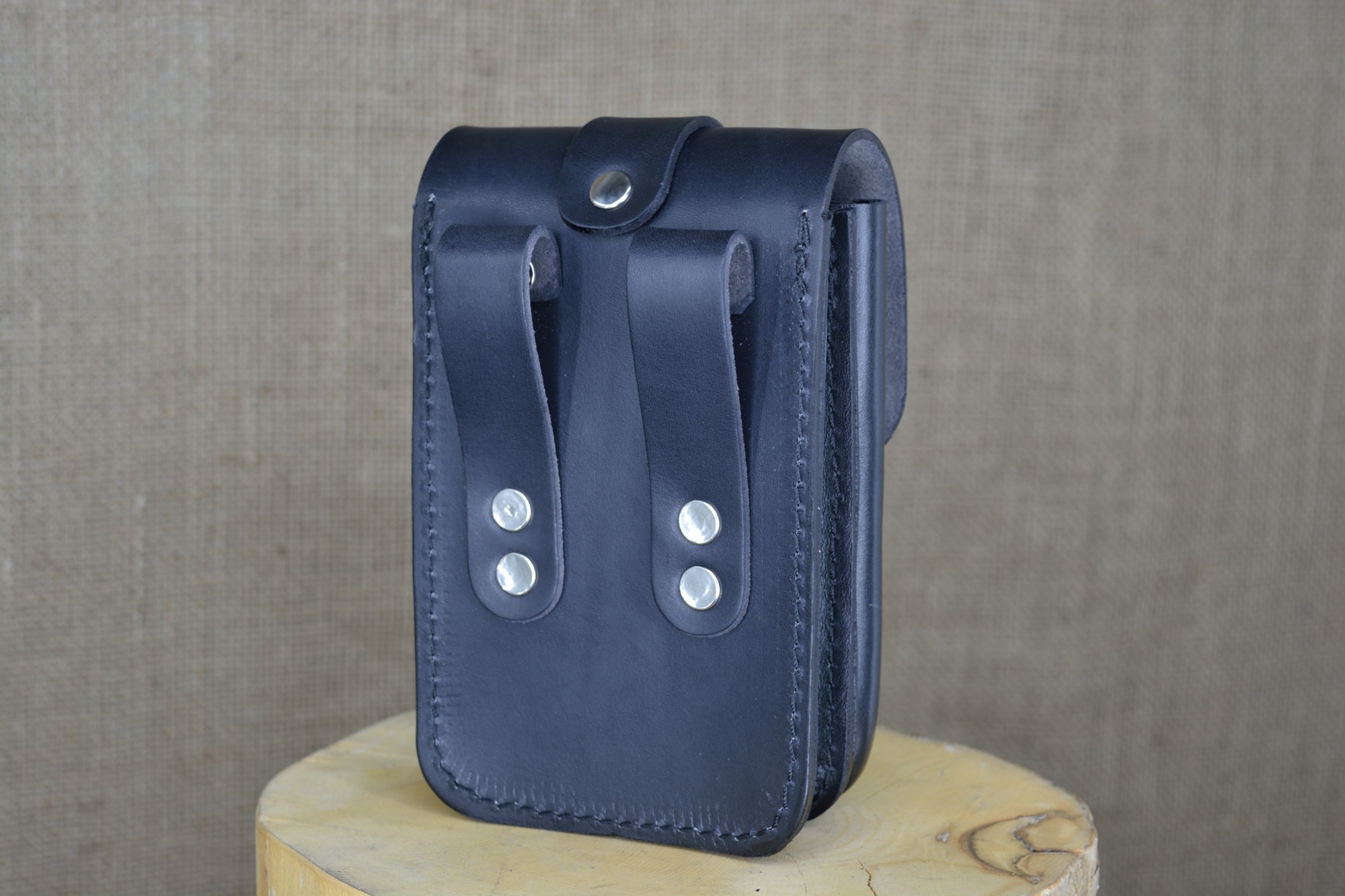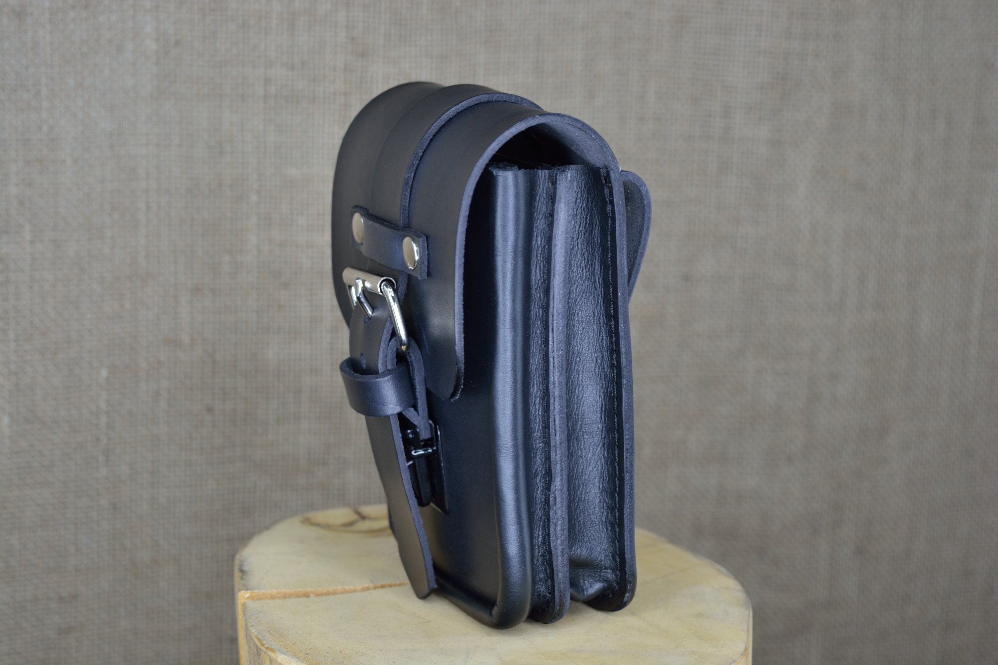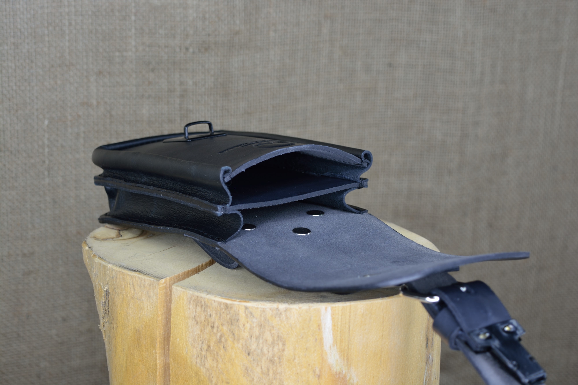 Kožená kapsa dvojitá na výšku s kombinovaným zapínáním ozdobná větší - kvalitní kožená kapsa vyrobená ručně z pravé hovězí kůže. Kožená kapsa se skládá ze dvou přihrádek. Zapínání kapsy je řešeno pomocí kombinace kovového zámečku a přezky. Na klapně je nanýtován ozdobný puh kůže. Na zadní straně má dvě kožená poutka pro uchycení na opasek.