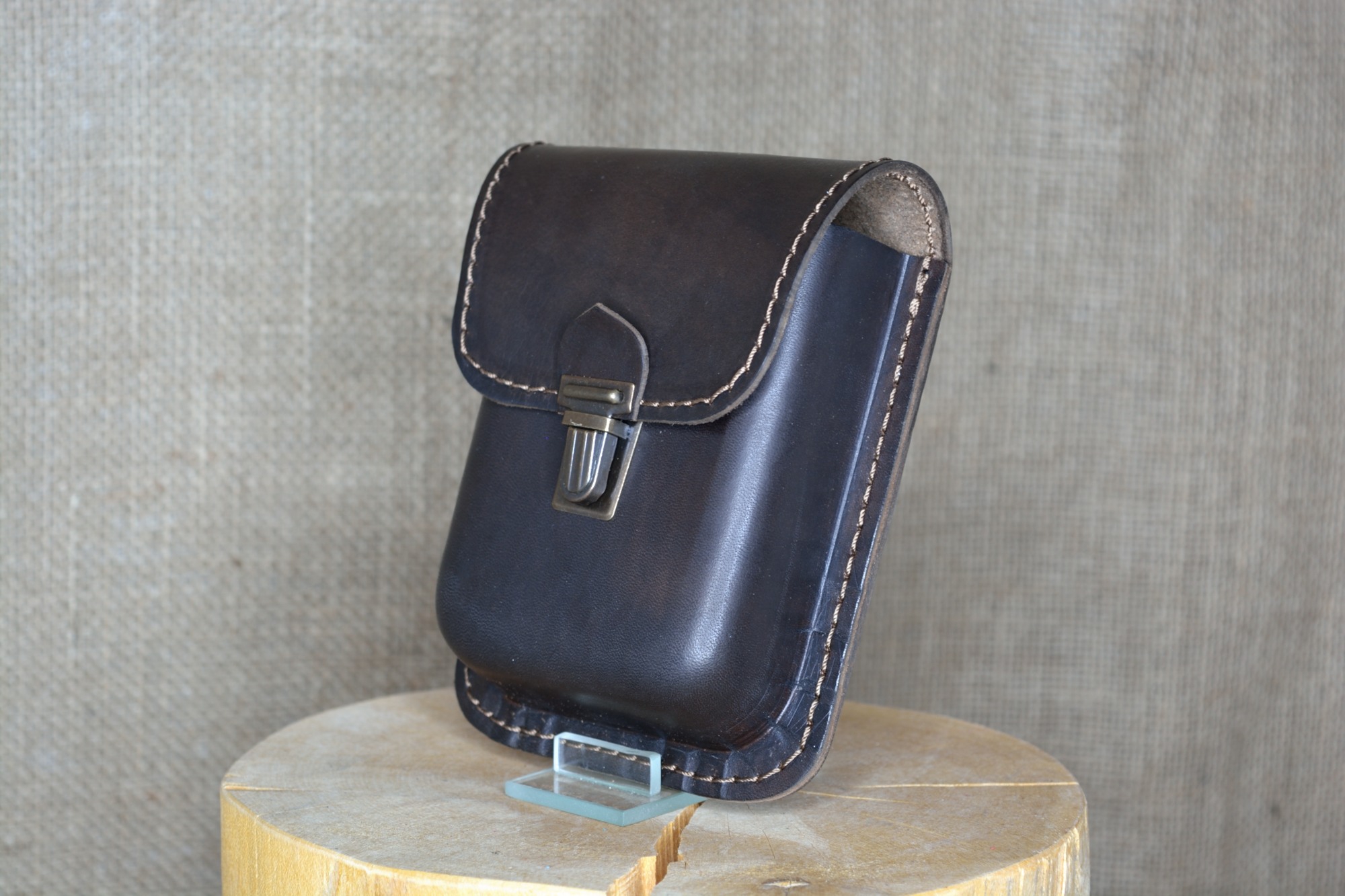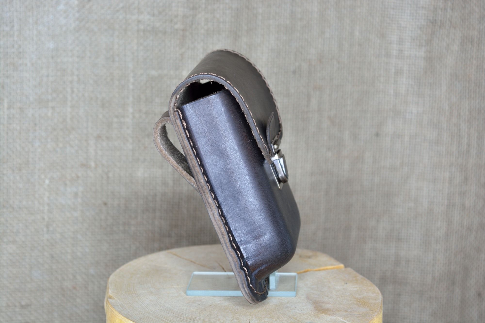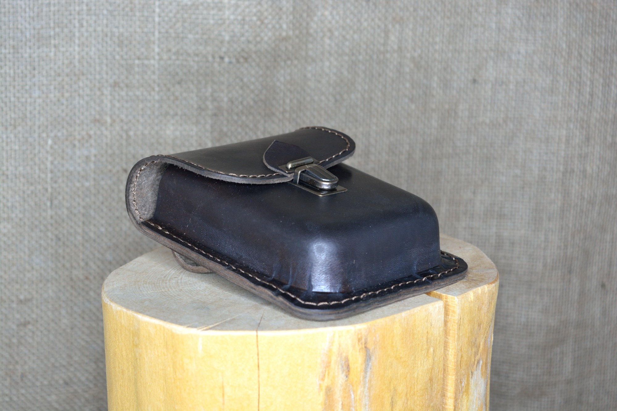 Kožená kapsa Klasik na zámeček - kvalitní kožená kapsa vyrobená ručně z pravé hovězí kůže. Kožená kapsa má jednu větší přihrádku a je vhodná pro nošení drobností jako klíče, mobil, peněženka, cigarety. Zapínání kapsy je řešeno pomocí kovového zámečku, který poskytuje bezpečné uzavření kapsy a pomocí kterého je možné kapsu jednoduše a rychle uzavírat a otevírat. Na zadní straně má dvě kožená poutka pro uchycení na opasek.