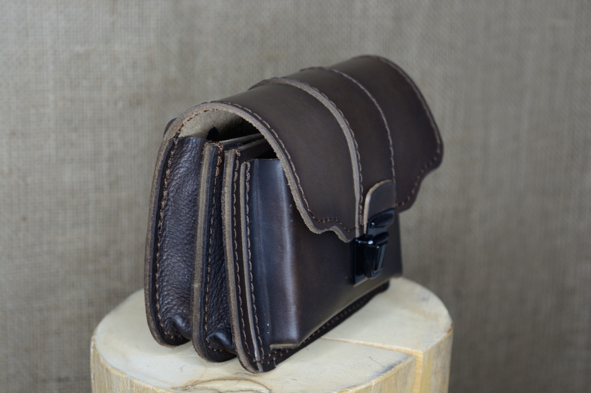 Kožená kapsa řezaná dvojitá s přední kapsou na zámeček - kvalitní kožená kapsa vyrobená ručně z pravé hovězí kůže. Kožená kapsa má dvě větší přihrádky a na předním díle má našitou ještě jednu zmenšenou kapsu. Kapsa má klapnu s ozdobným pásem kůže, který je ozdobně uchycen pomocí nýtů. Kapsa se uzavírá pomocí zámečku. Na zadní straně má tato kožená kapsa našitá dvě kožená poutka pro uchycení na opasek.