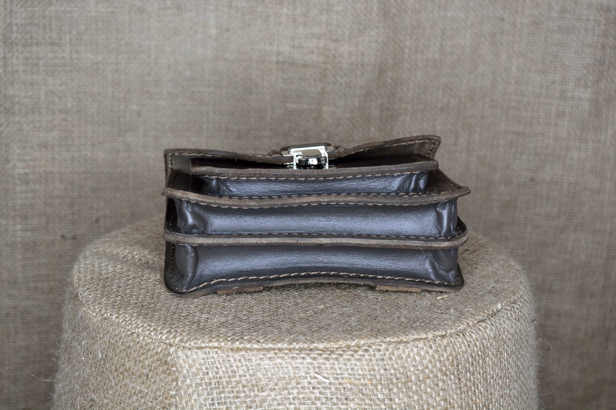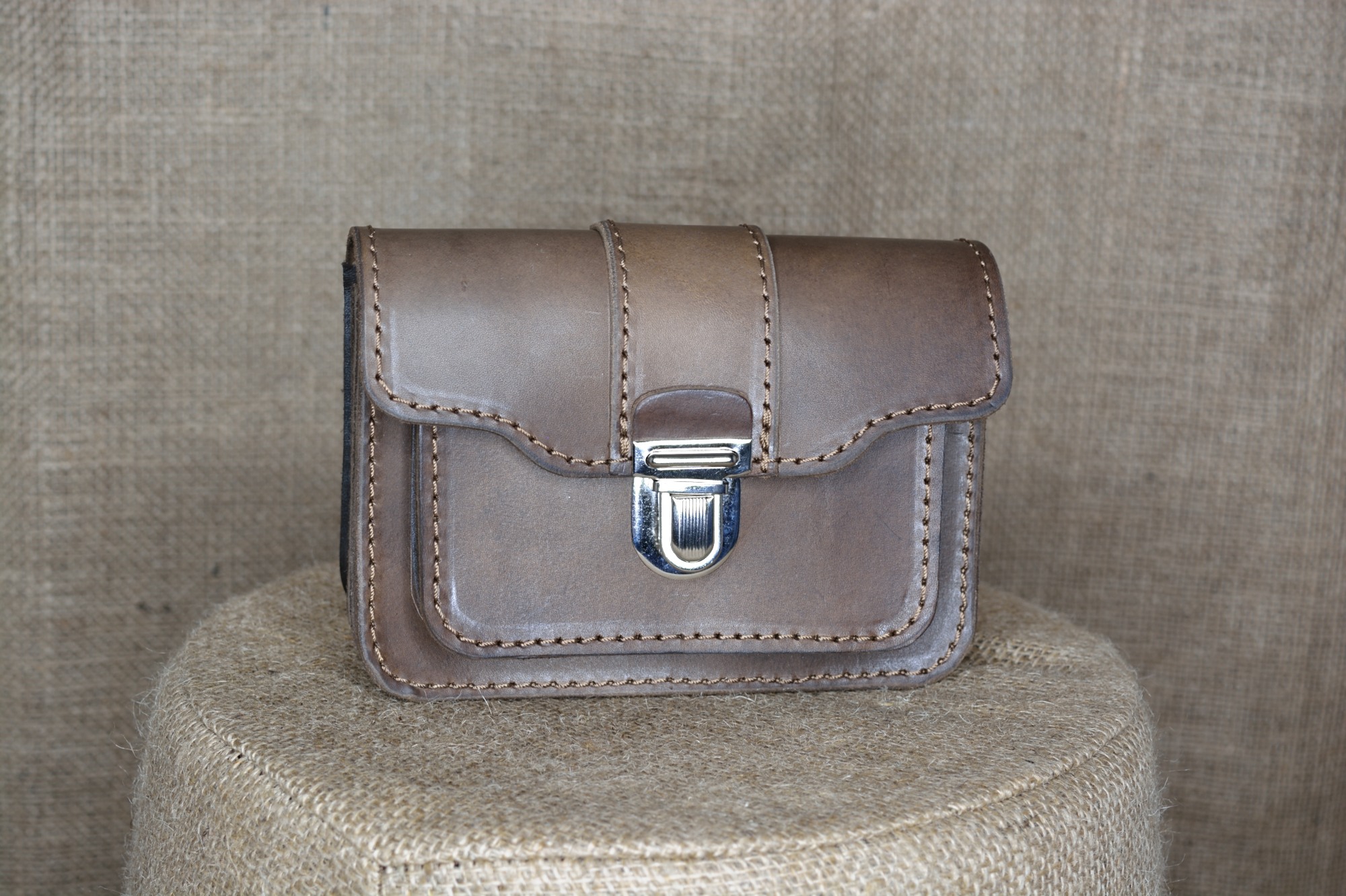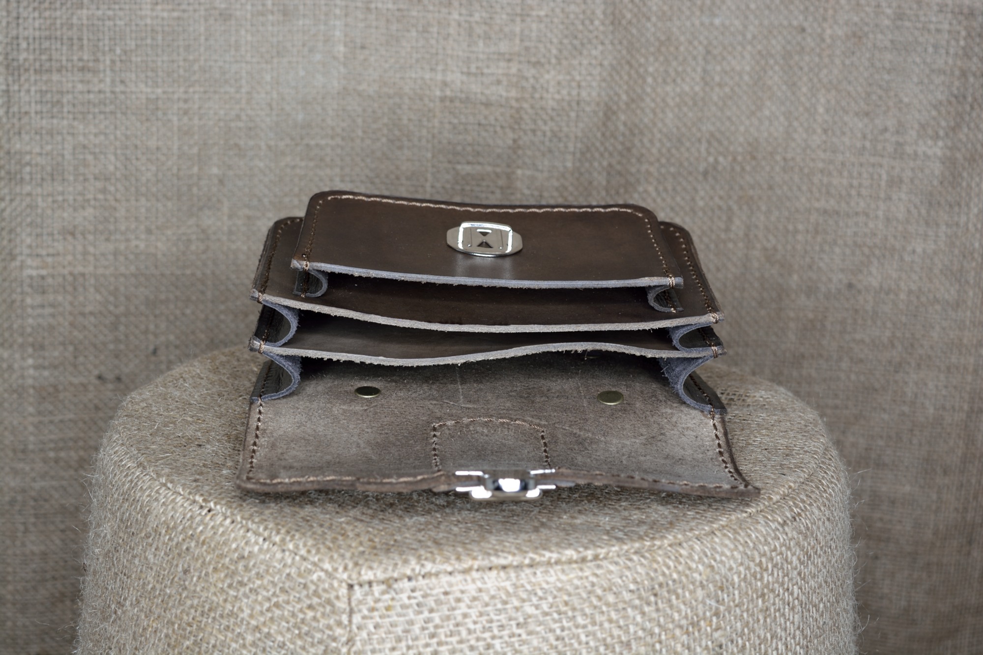 Kožená kapsa řezaná na zámeček dvojitá větší - kvalitní kožená kapsa vyrobená ručně z pravé hovězí kůže. Kožená kapsa má dvě větší přihrádky a na předním díle má našitou ještě jednu menší přihrádku. Kapsa má klapnu s ozdobným pásem kůže, která se uzavírá pomocí zámečku. Na zadní straně má tato kožená kapsa našitá dvě kožená poutka pro uchycení na opasek.