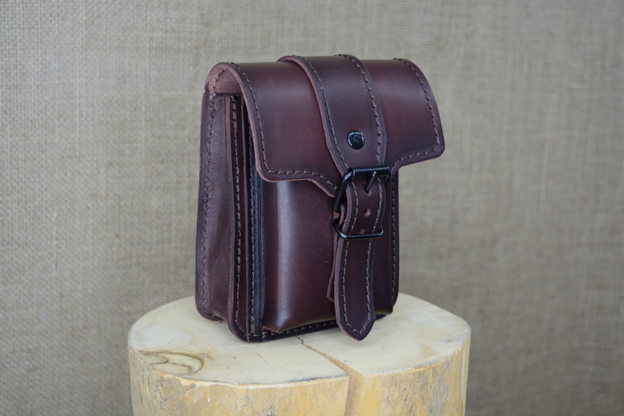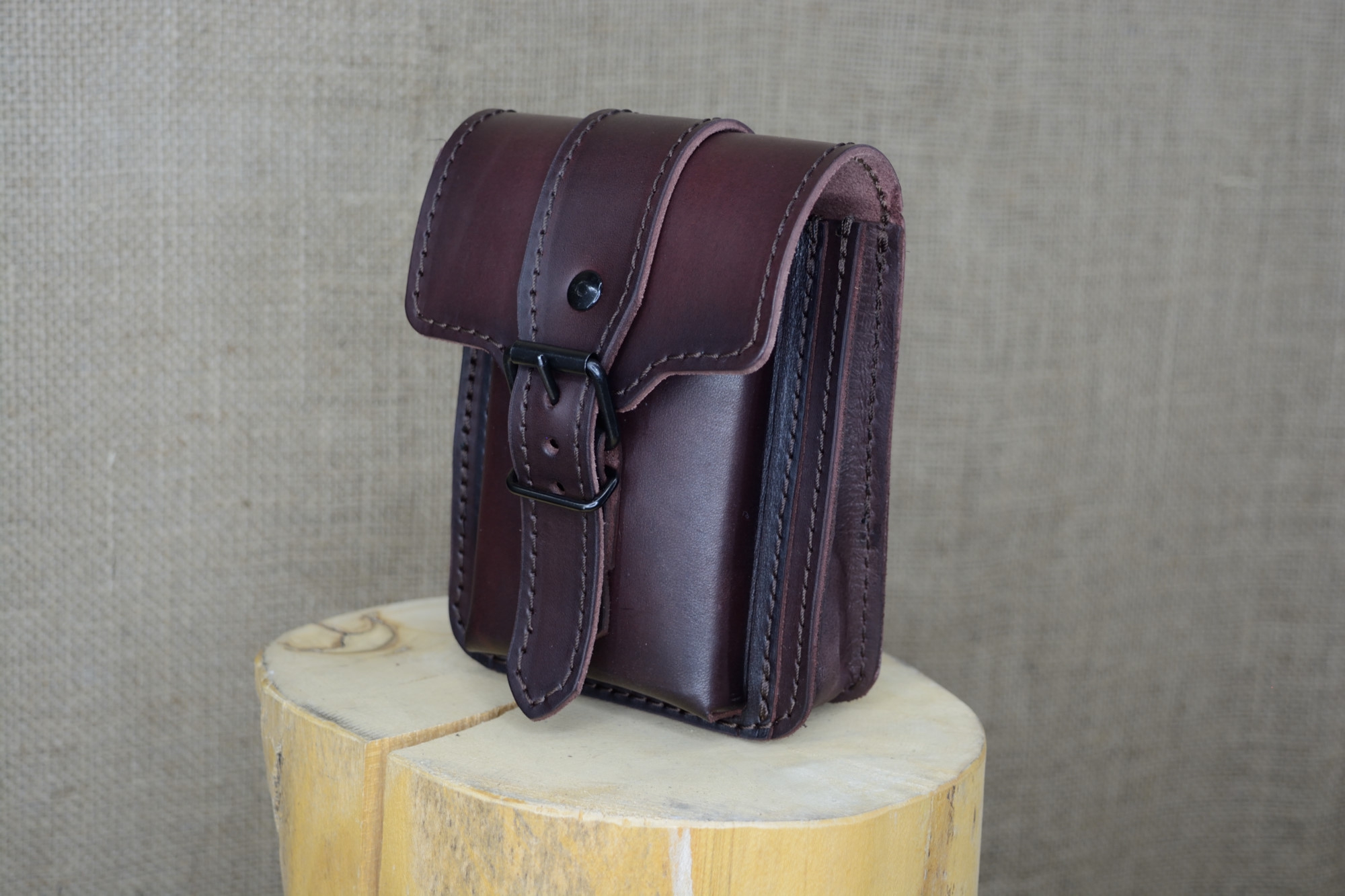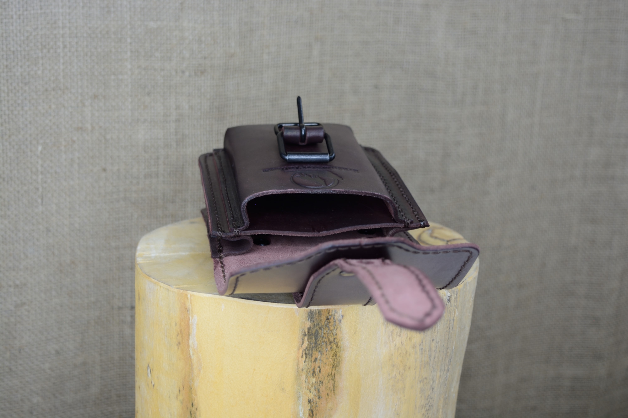 Kožená kapsa smart na výšku na přezku - kvalitní kožená kapsa vyrobená ručně z pravé hovězí kůže. Kožená kapsa má dvě větší přihrádky, které jsou navrženy tak, aby v nich bylo možné pohodlně nosit mobilní telefon o rozměrech do 14,5 cm x 8 cm a peněženku do rozměrů 9,5 cm x 13 cm x 3 cm. Kapsa má klapnu s ozdobným jazykem, která se uzavírá pomocí přezky. Na zadní straně má tato kožená kapsa našitá dvě kožená poutka pro uchycení na opasek.