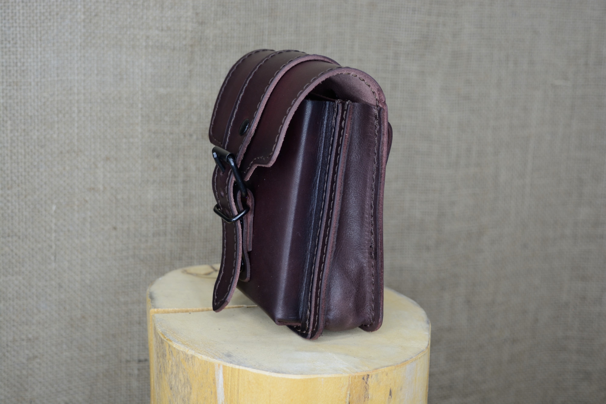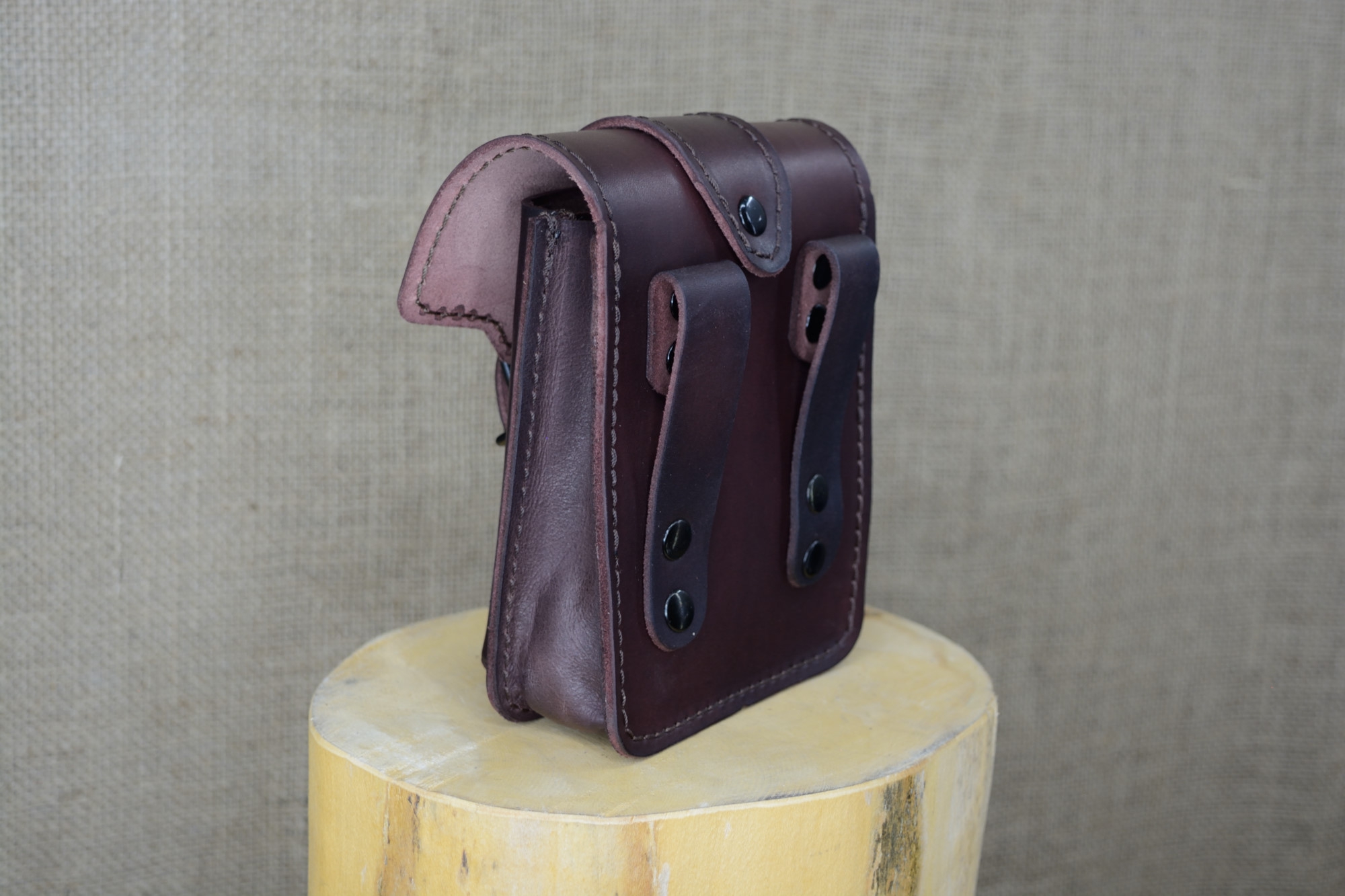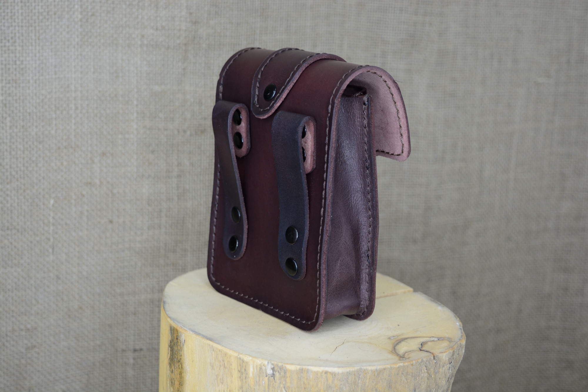 Kožená kapsa smart na výšku na přezku - kvalitní kožená kapsa vyrobená ručně z pravé hovězí kůže. Kožená kapsa má dvě větší přihrádky, které jsou navrženy tak, aby v nich bylo možné pohodlně nosit mobilní telefon o rozměrech do 14,5 cm x 8 cm a peněženku do rozměrů 9,5 cm x 13 cm x 3 cm. Kapsa má klapnu s ozdobným jazykem, která se uzavírá pomocí přezky. Na zadní straně má tato kožená kapsa našitá dvě kožená poutka pro uchycení na opasek.