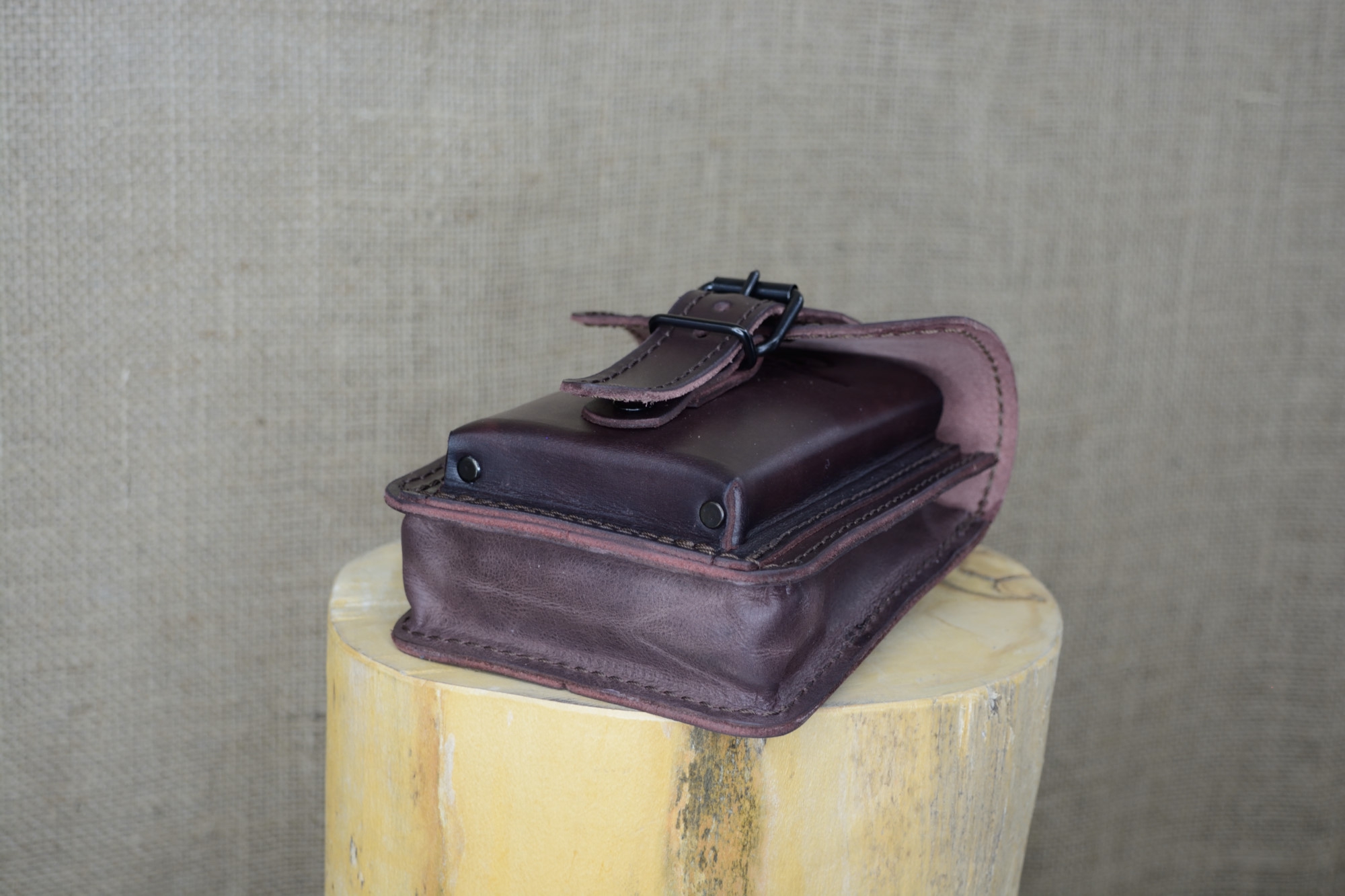 Kožená kapsa smart na výšku na přezku má vnější rozměry V 17 cm x Š 12,5 cm x H 6 cm.