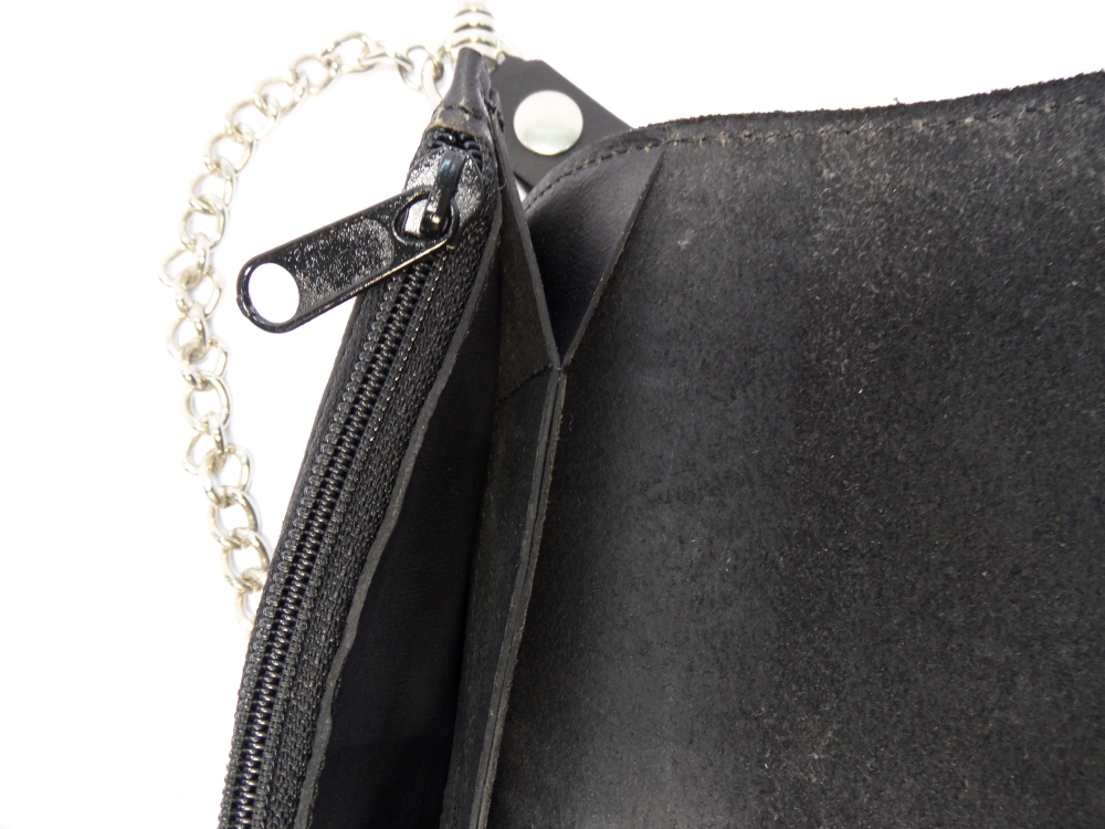 Pozor v této kožené motorkářské peněžence se peníze nosí vždy složené na půl. Celková vnitřní délka přihrádky na peníze je pouze 13 cm.