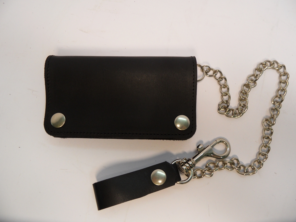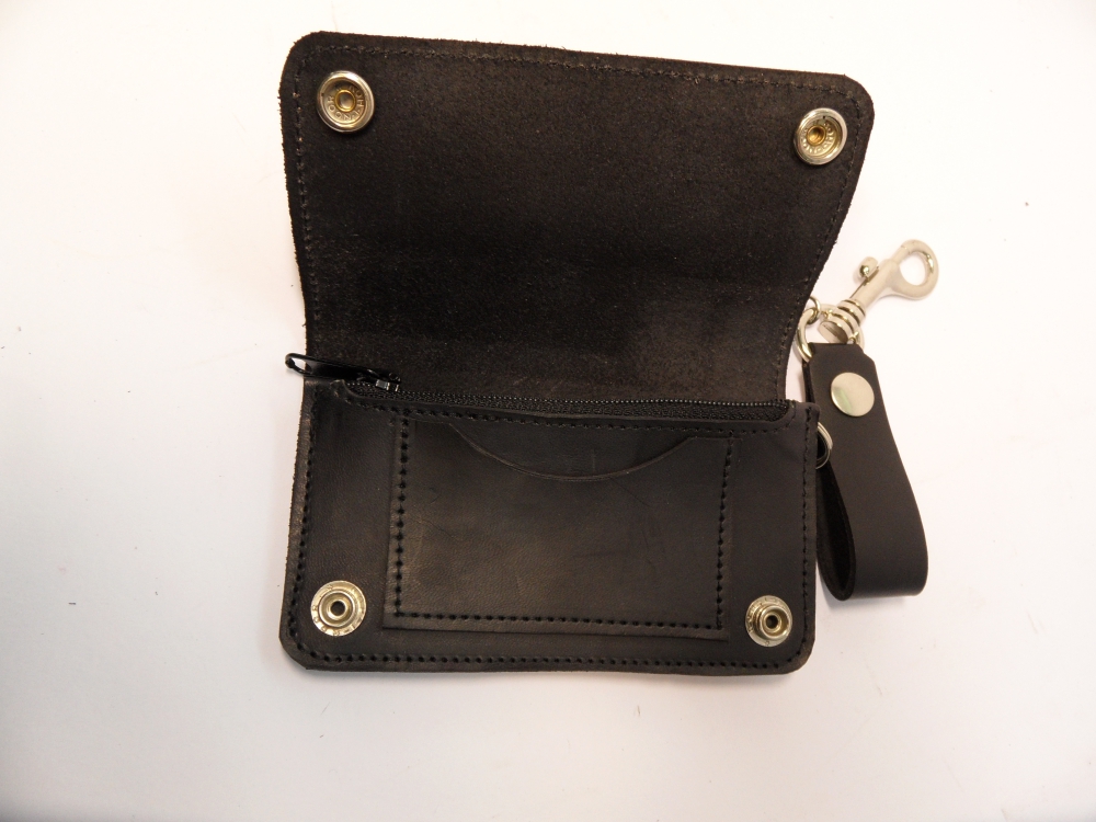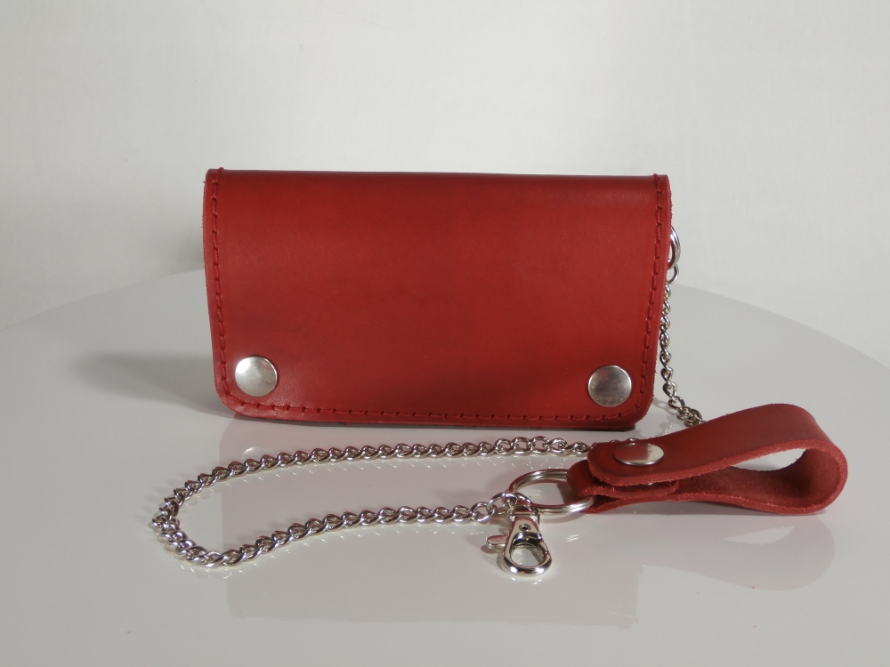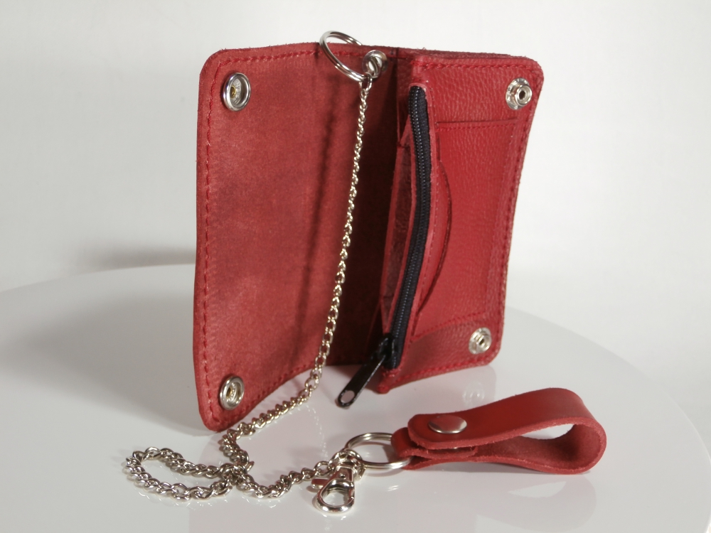 Motorkářská kožená peněženka - kvalitní kožená peněženka vyrobená ručně z pravé hovězí kůže. Peněženka se zavírá na dva kovové druky. Peněženka je vybavena karabinou s koženým poutkem na kovový druk a řetězy pro snadné uchycení ke kalhotám.