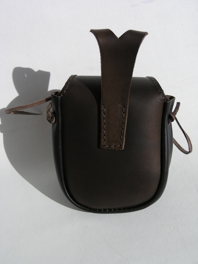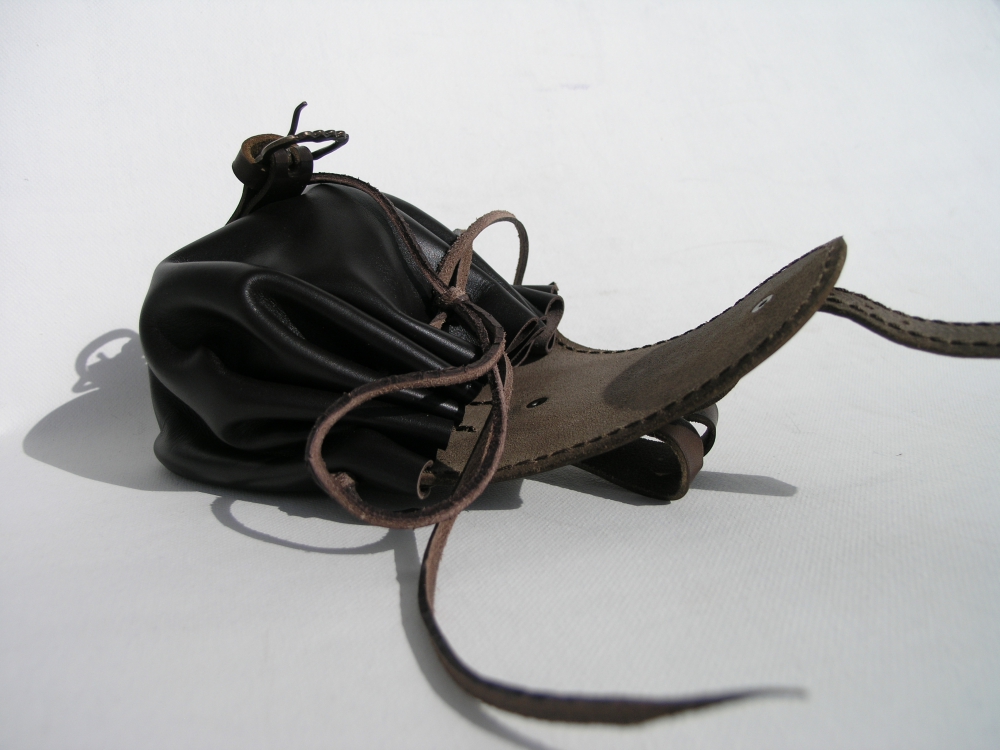 Kožený historický měšec na přezku - kvalitní kožený historický měšec vyrobený ručně z pravé hovězí kůže. Zadní strana koženého měšce je tvořena jedním kusem kůže, ke kterému je našité ozdobné poutko pro nošení na opasku. Kožený měšec má zavírání řešeno klasicky - zatahováním koženou šňůrkou. Měšec má však navíc ještě klapinku, která se zavírá pomocí přezky. Kožený měšec je výborným historickým doplňkem, který umocní Váš dobový vzhled.