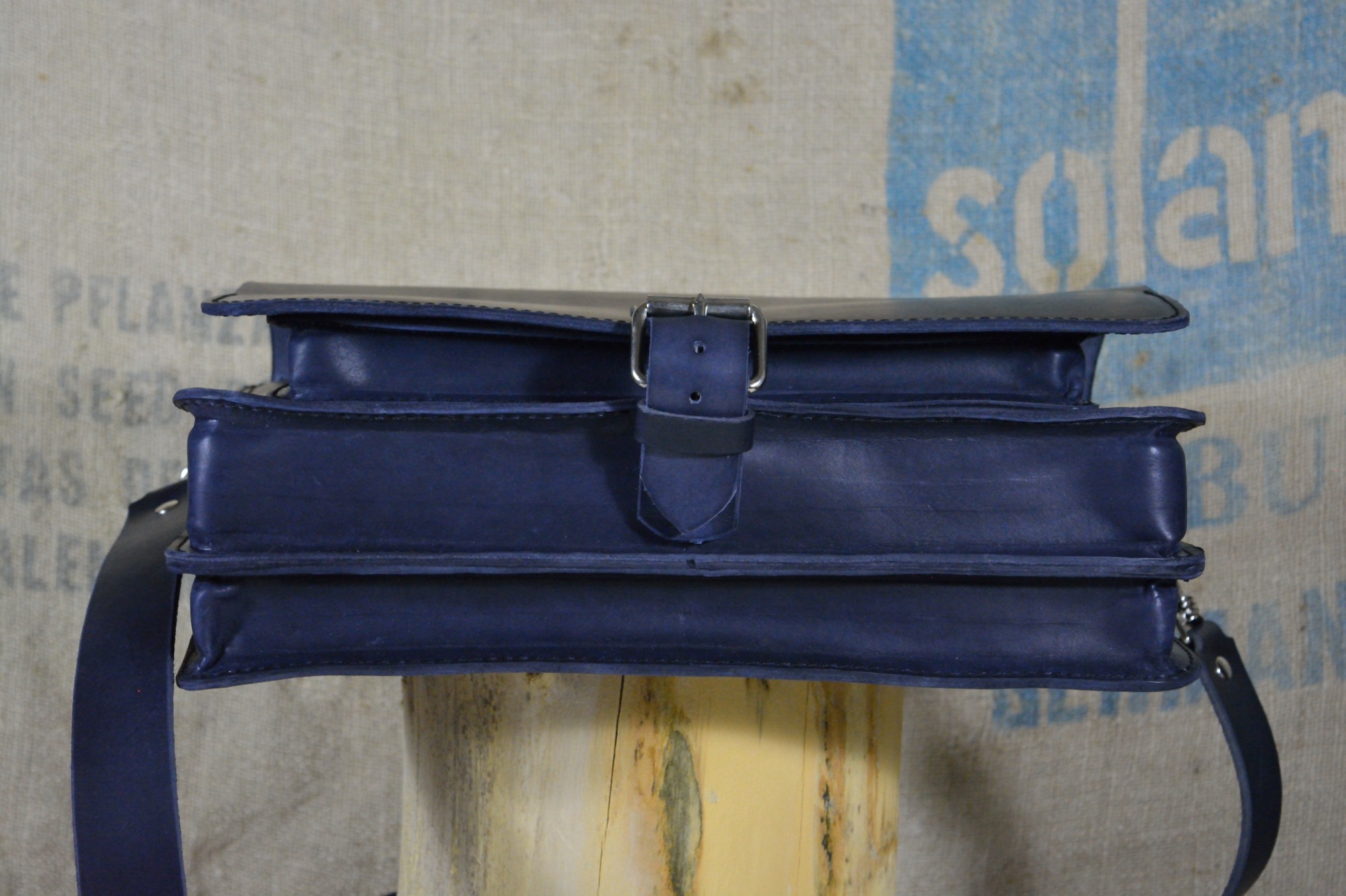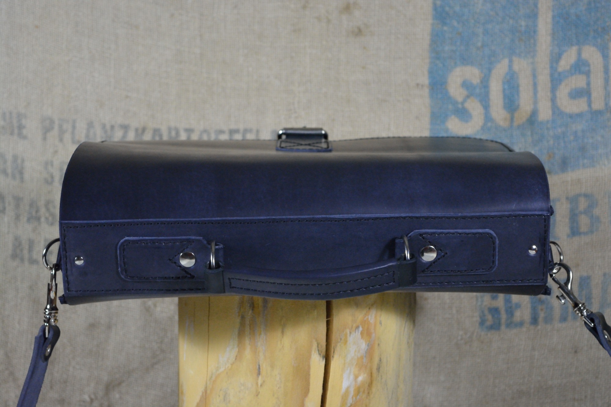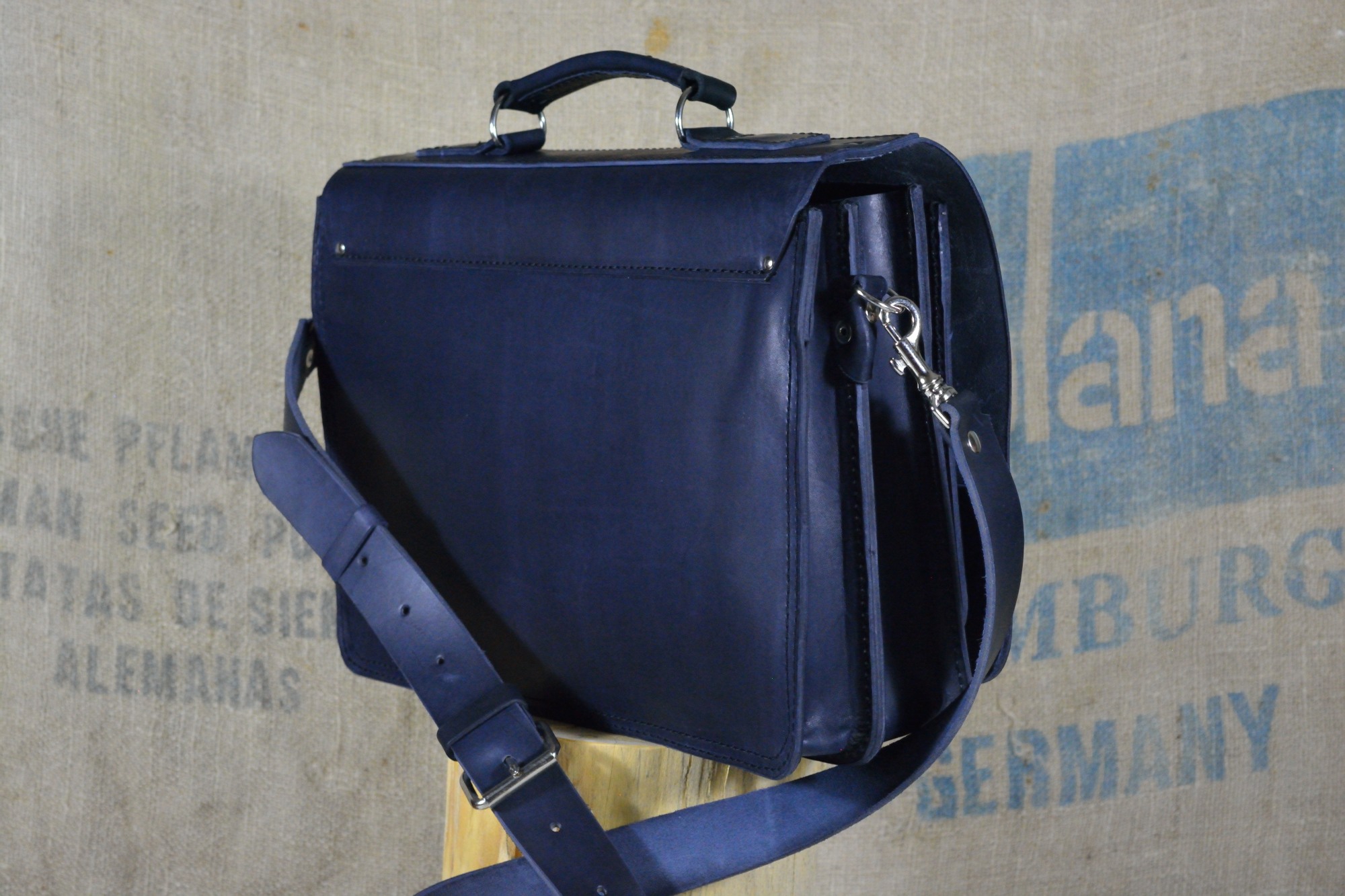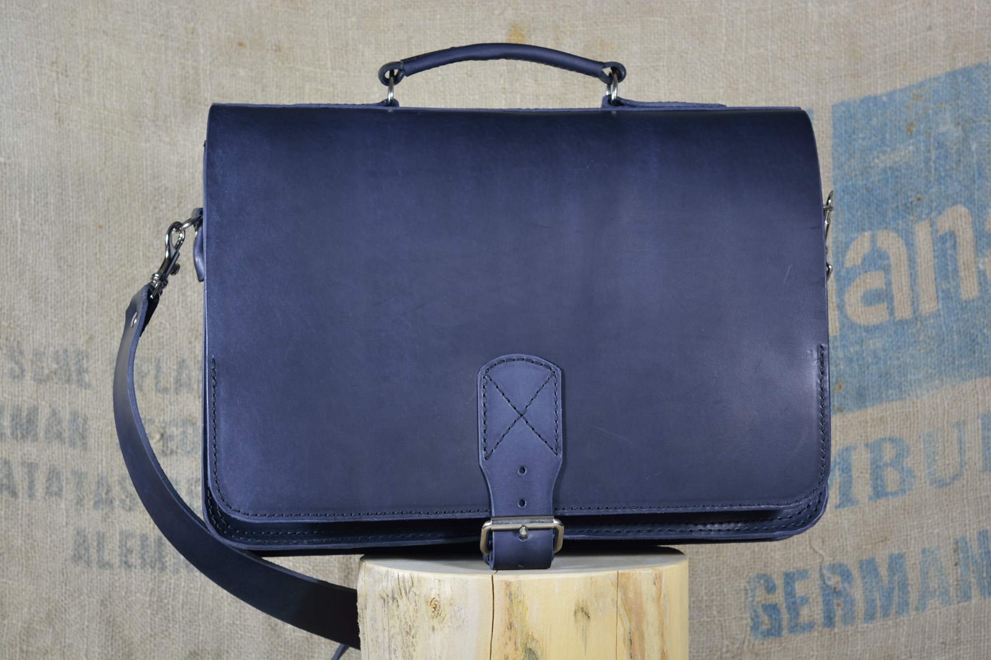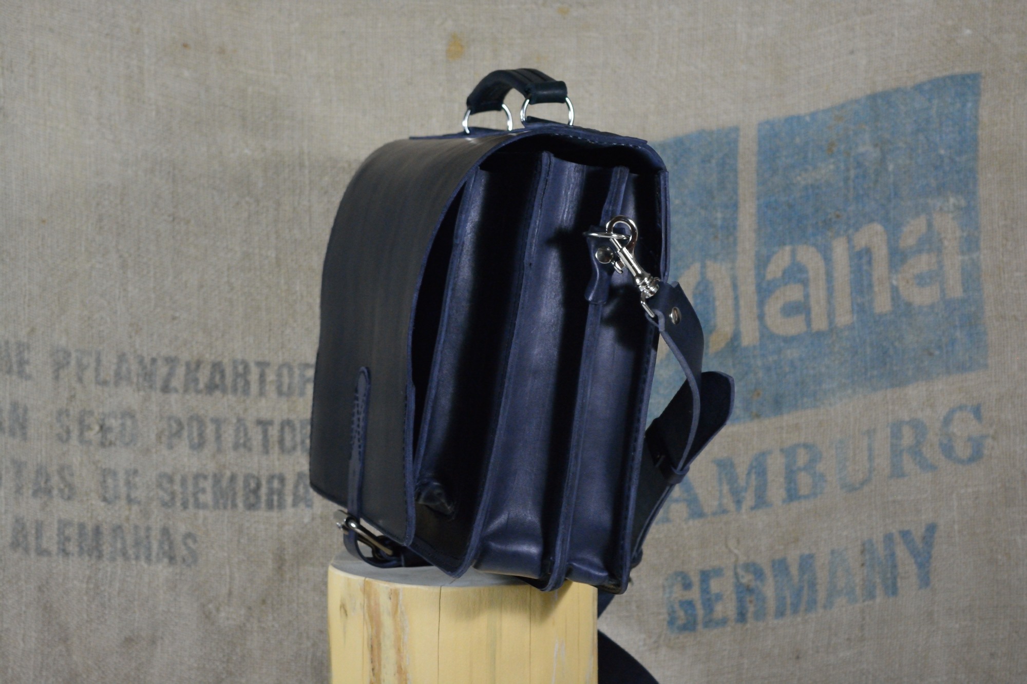 Kabela se uzavírá na přezku, má držátko do ruky a dlouhý kožený řemen připevněn k bokům brašny pomocí karabin. Délku řemene přes rameno je možné upravovat pomocí přezky.