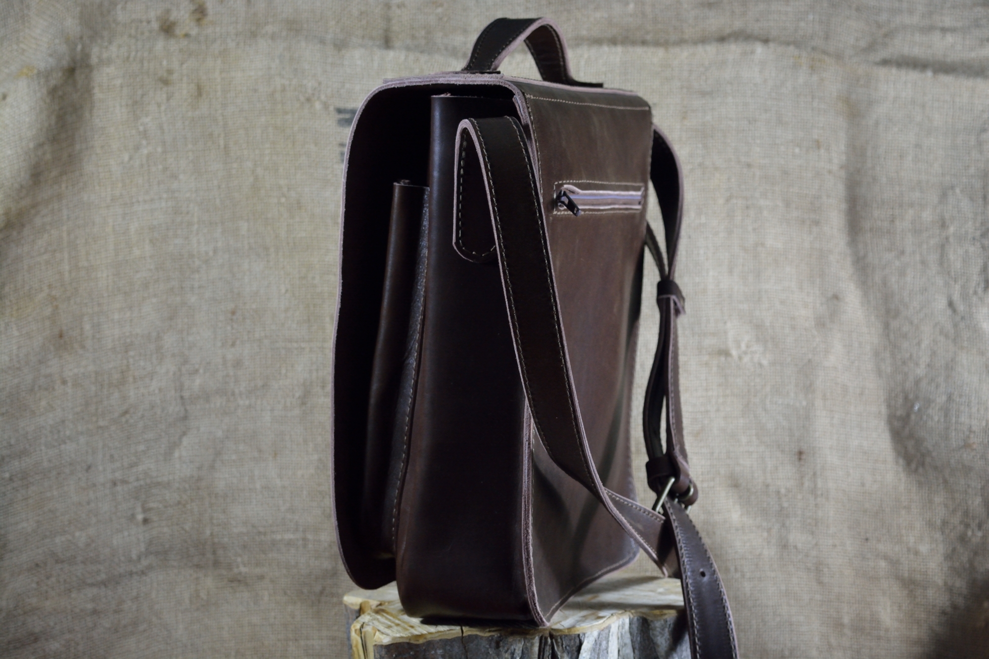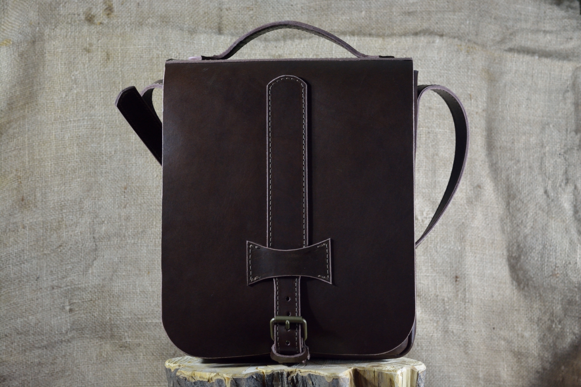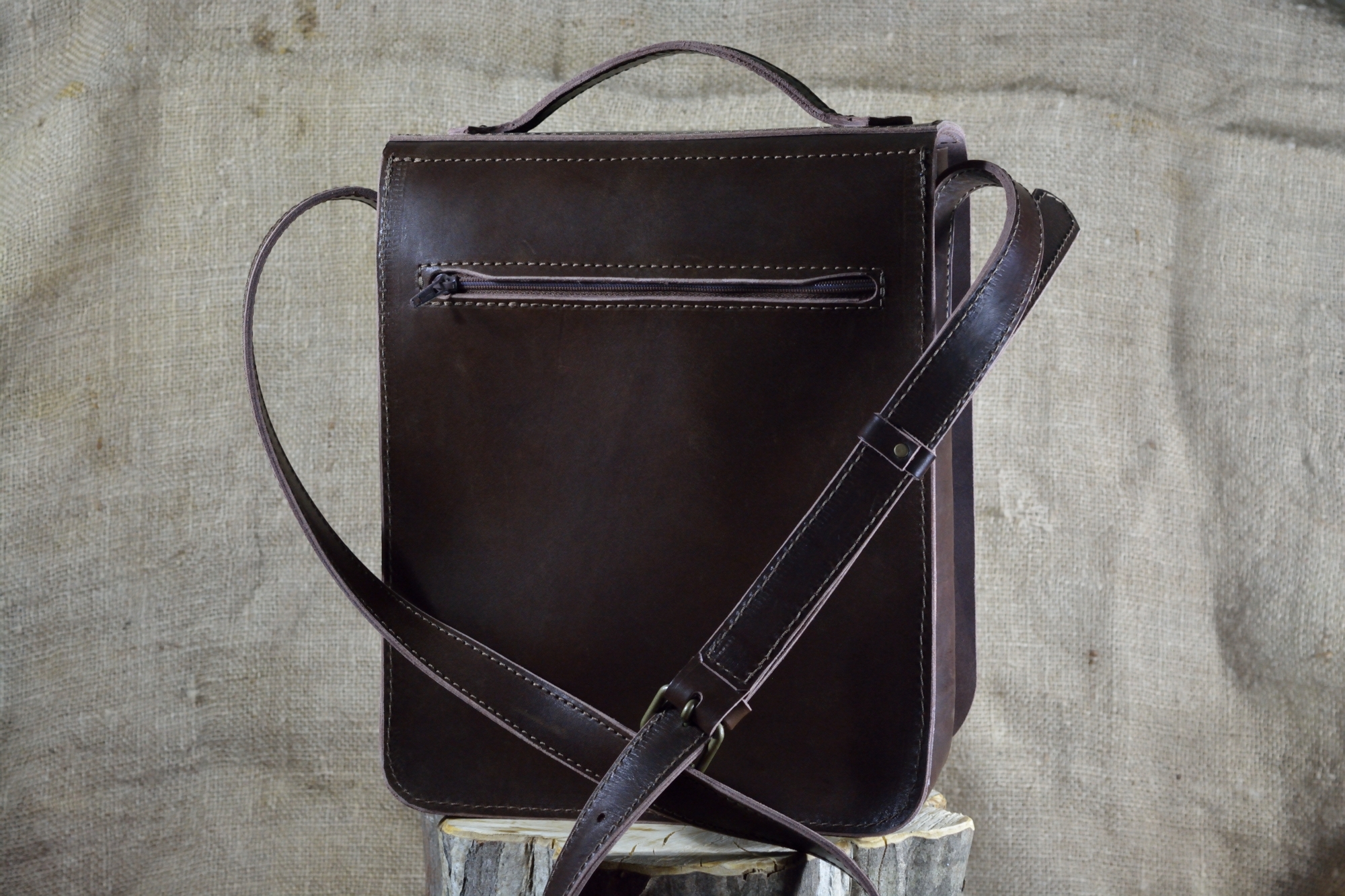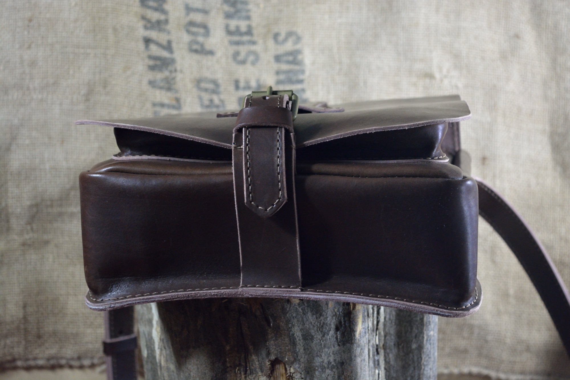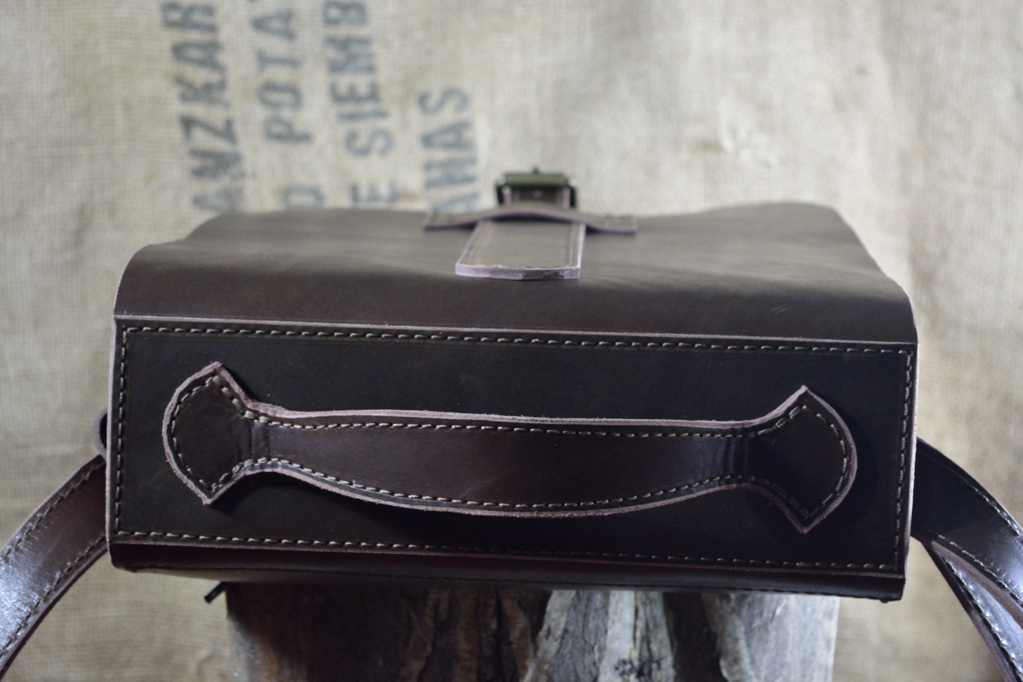 Pánská kožená brašna Myslivec s držadlem - kvalitní pánská kožená brašna vyrobená z pravé hovězí kůže - hlazenice, která je ručně barvená. Kožená brašna Myslivec je vyrobená z kůže tlusté 2,5 mm a řemen brašny o šířce 3 cm je vyroben z kůže tlusté 3 mm. Kožená brašna je uzpůsobená tak, aby se do ní v pohodě vešel formát A4. Brašna má na předním dílu našitou jednu větší kapsu, na zadní části se nachází zipová kapsa, kterou určitě oceníte. Vnitřní prostor je dostatečné velký a nachází se v něm další zipová kapsička, která je vhodná na doklady, peněženku atd. Kožená brašna se zapíná na přezku. Na vrchní části brašny je našité držadlo do ruky.