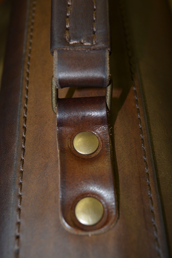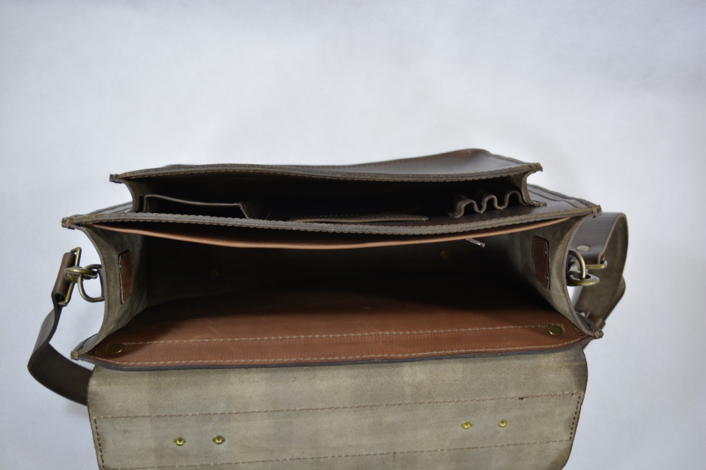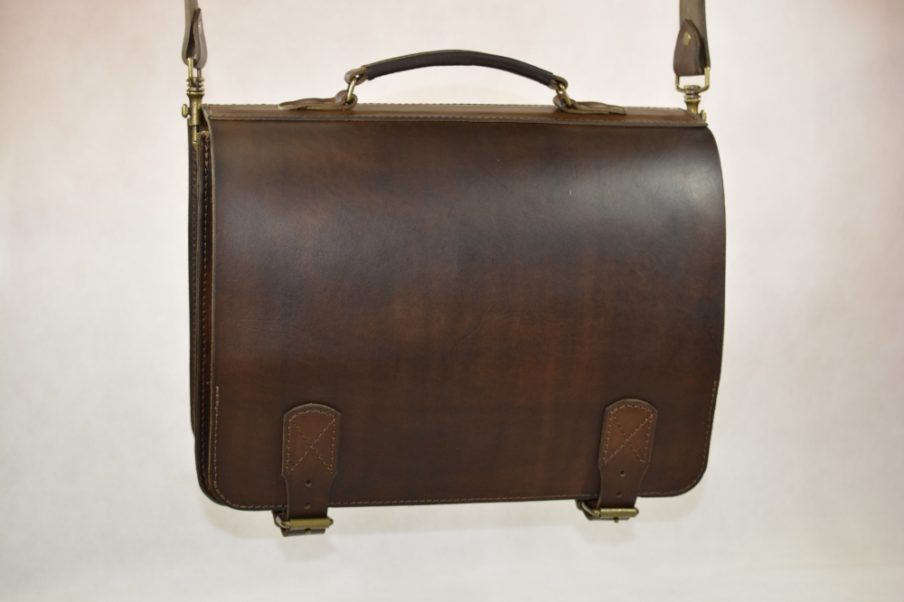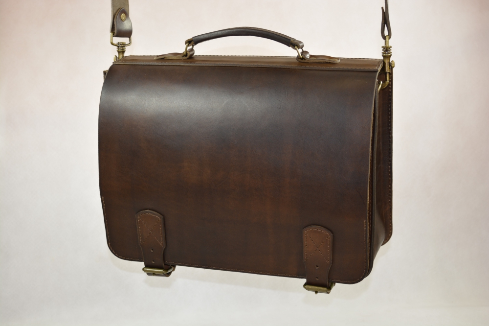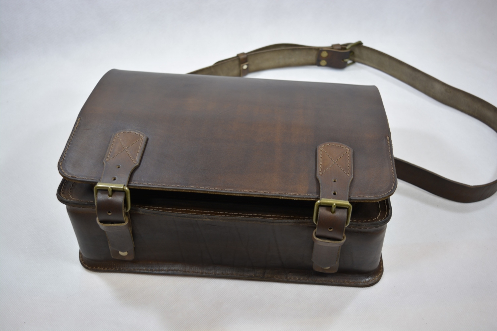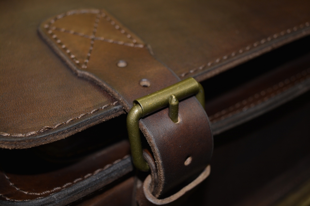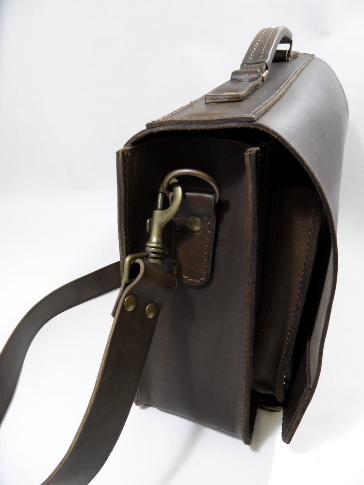 Brašna má kožené držátko do ruky a odepínací kožený řemen přes rameno na karabinky. Délku řemene je možné libovolně nastavovat.