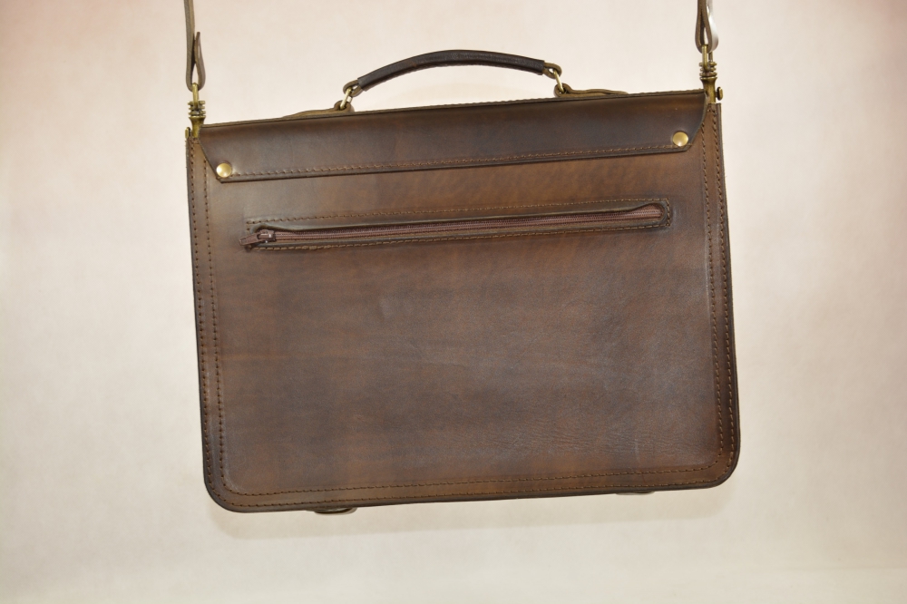 Pánská kožená brašna řezaná s držátkem – kvalitní pánská kožená brašna řezaná z pravé hovězí kůže - usně. Aktovka je uzavíratelná na dvě kovové přezky. Kožená brašna má jedno hlavní oddělení a na předním dílu jednu větší kapsu, ve které se nachází kapsa na mobil a vizitky a úchyty na tři tužky. Na vnitřním předním dílu má všitou volnou koženou kapsu, na které se nachází ještě jedna kapsa na zip. Na zadním hlavním dílu se zvenčí nachází kapsa na zip.