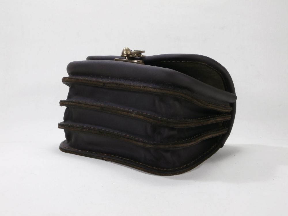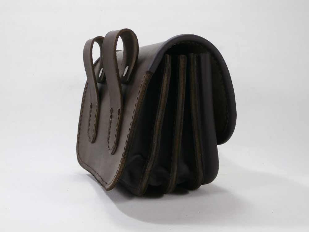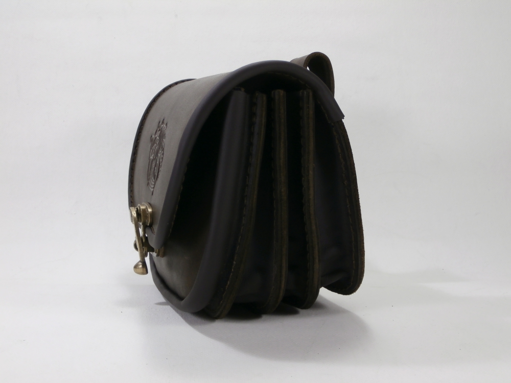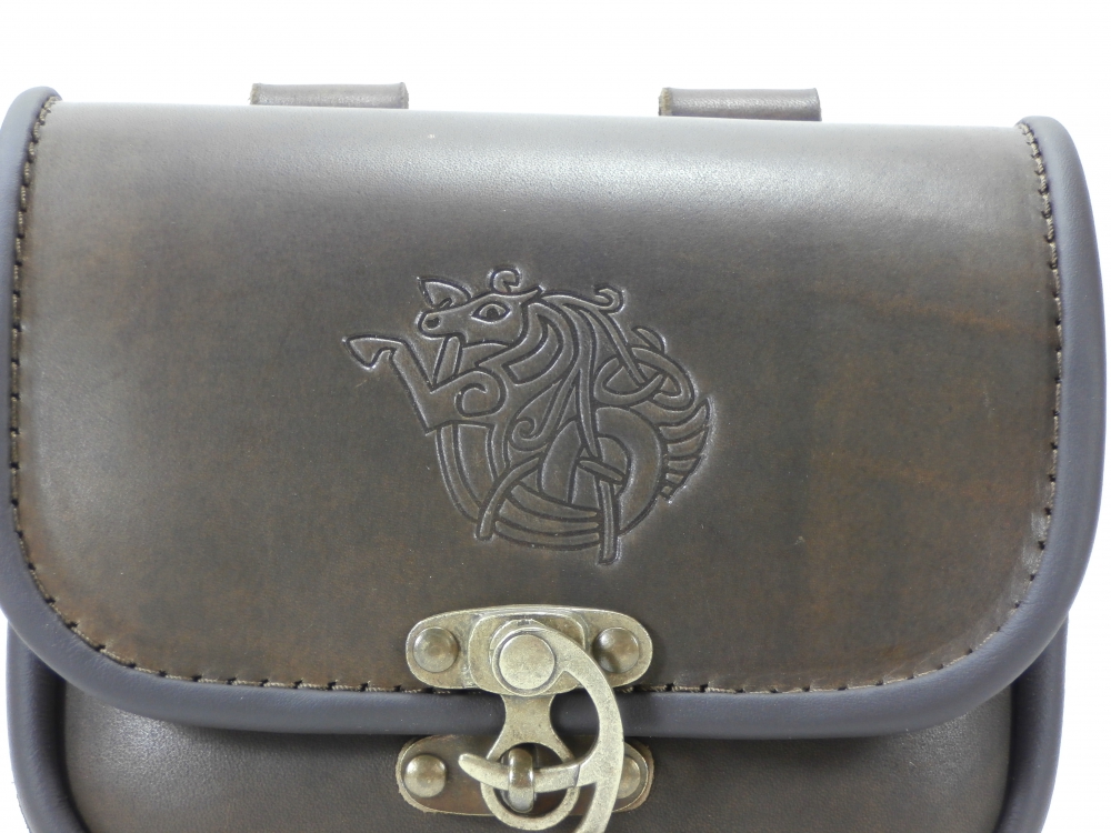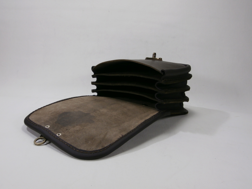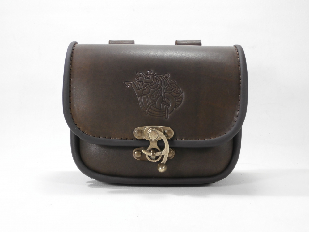Velká kožená historická tašvice čtveřitá hranatá - kvalitní kožená historická tašvice vyrobená ručně z pravé hovězí kůže. Kožená tašvice má čtyři oddělení a zavírání je řešeno koženou klapnou, která je zdobená raženým historickým motivem. Klapna se zavírá pomocí kovové kotvičky. Na zadní straně kožené tašvice se nachází dvě poutka pro zavěšení na opasek.