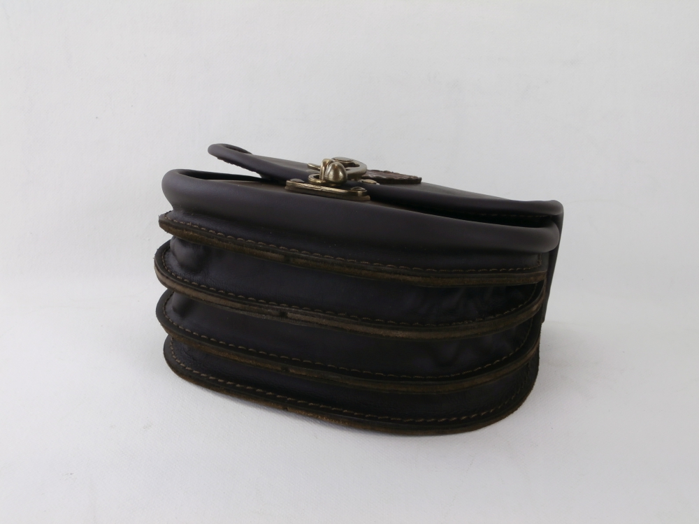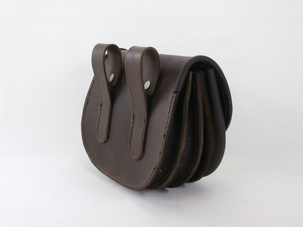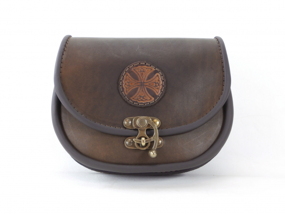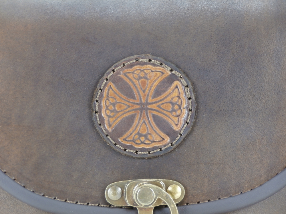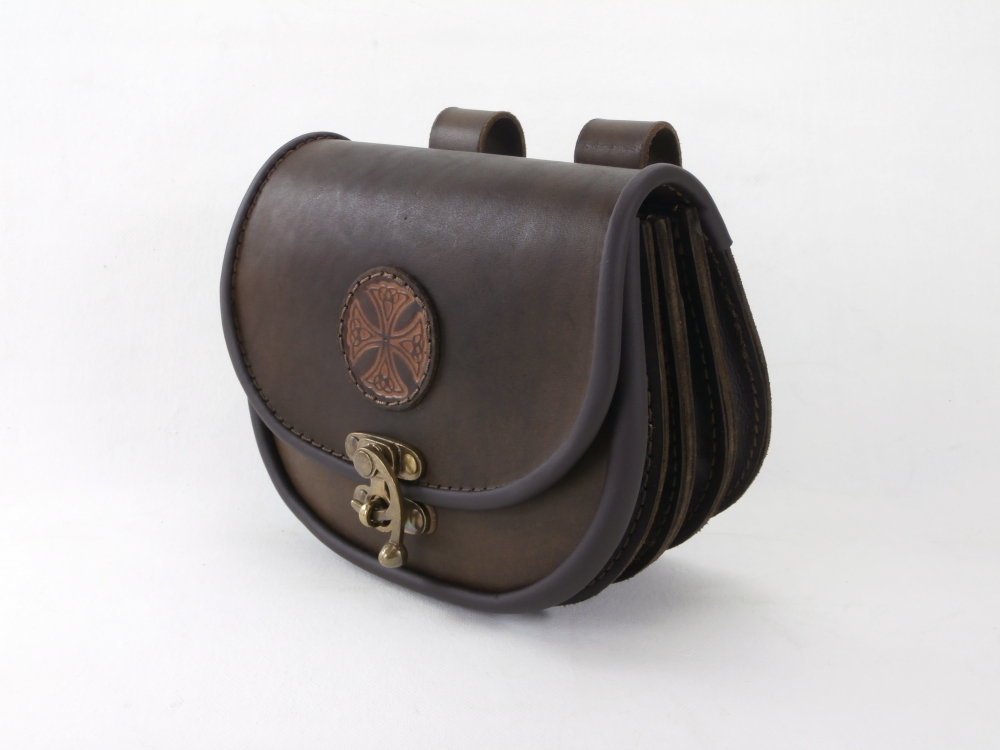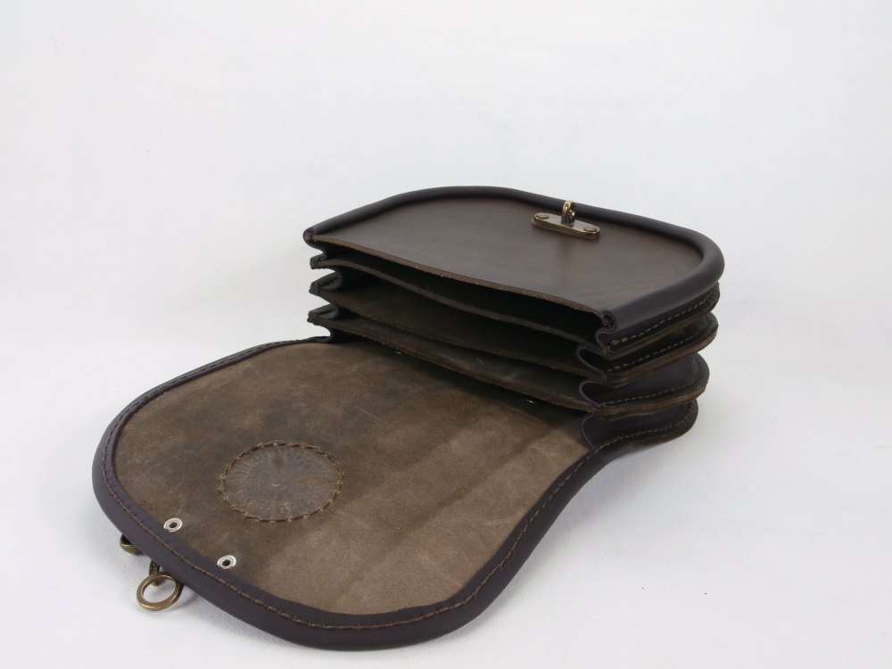 Velká kožená historická tašvice čtveřitá oblá - kvalitní kožená historická tašvice vyrobená ručně z pravé hovězí kůže. Kožená tašvice oblých tvarů má čtyři oddělení a zavírání je řešeno koženou klapnou, která je zdobená raženým historickým motivem. Klapna se zavírá pomocí kovové kotvičky. Na zadní straně kožené tašvice se nachází dvě kožená poutka pro zavěšení na opasek.