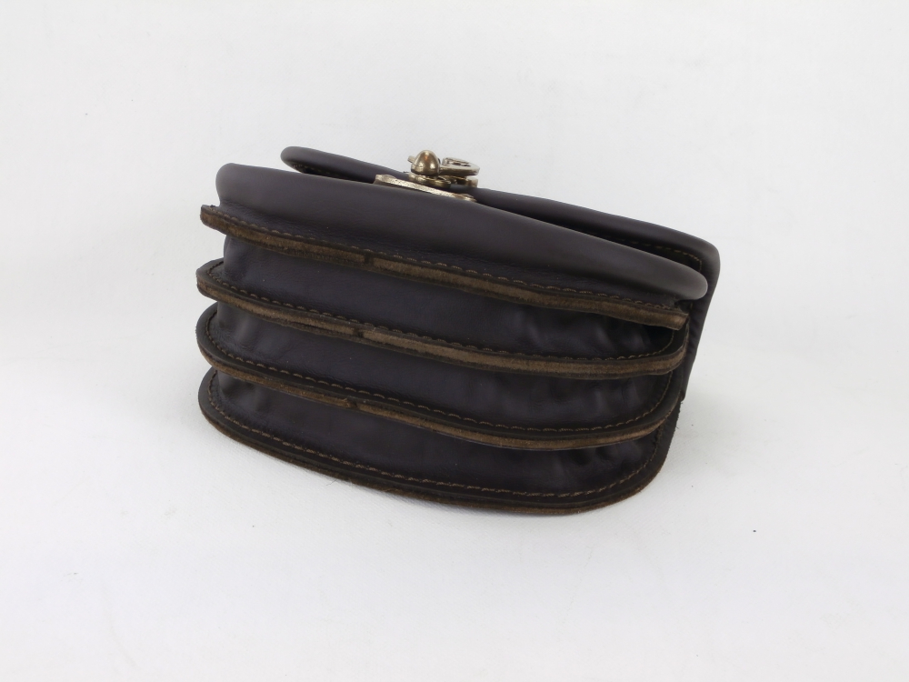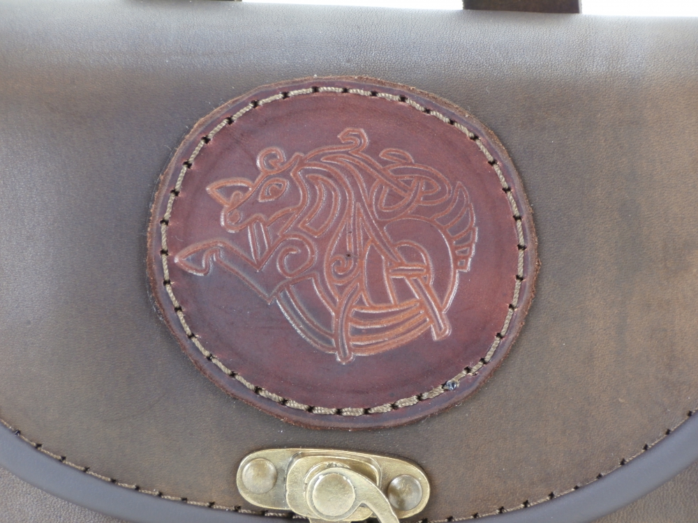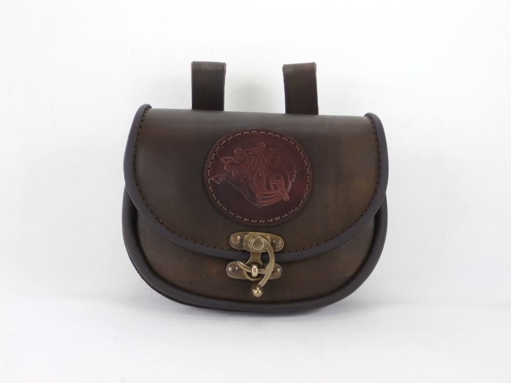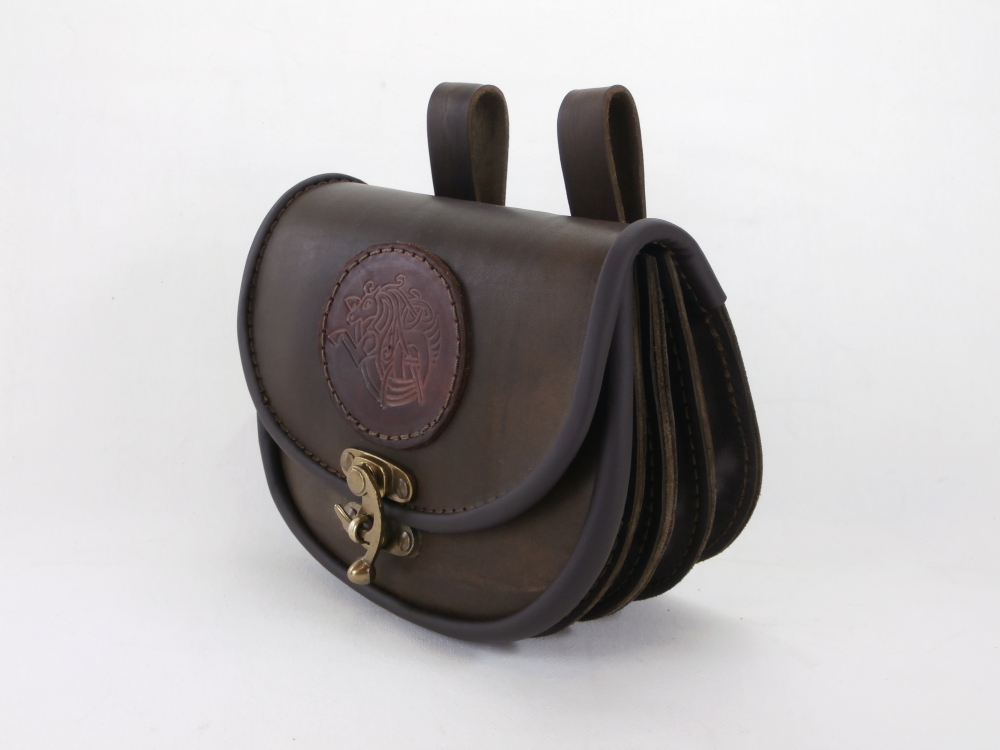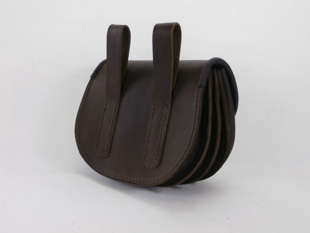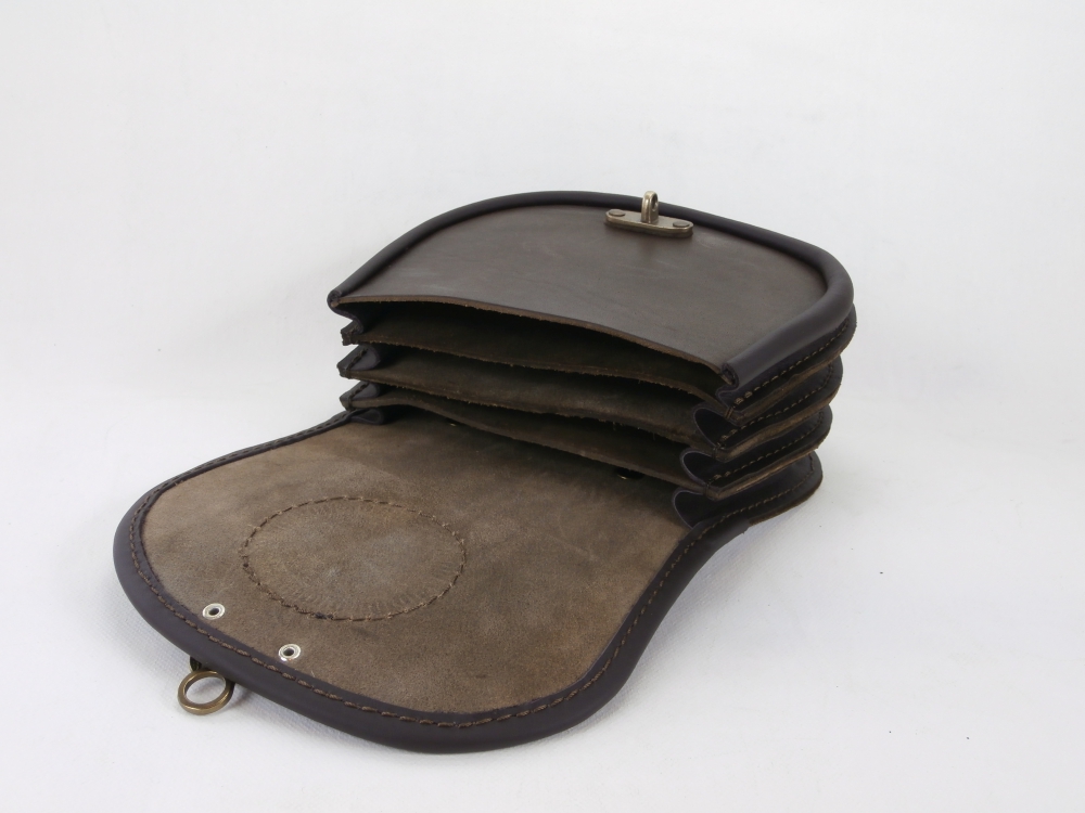 Velká kožená historická tašvice čtveřitá oblá - kvalitní kožená historická tašvice vyrobená ručně z pravé hovězí kůže. Kožená tašvice oblých tvarů má čtyři oddělení a zavírání je řešeno koženou klapnou, která je zdobená raženým historickým motivem. Klapna se zavírá pomocí kovové kotvičky. Na zadní straně kožené tašvice se nachází dvě kožená poutka pro zavěšení na opasek.