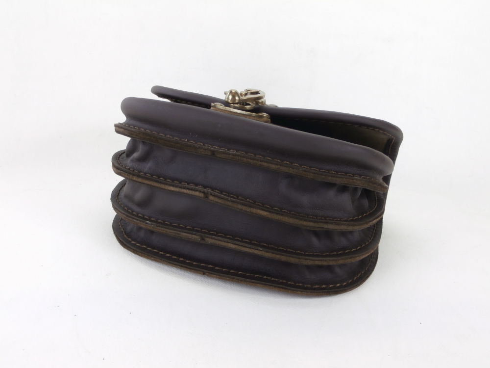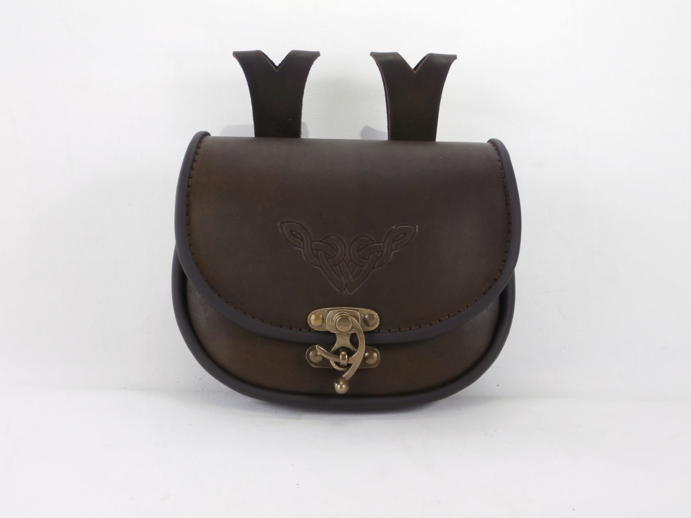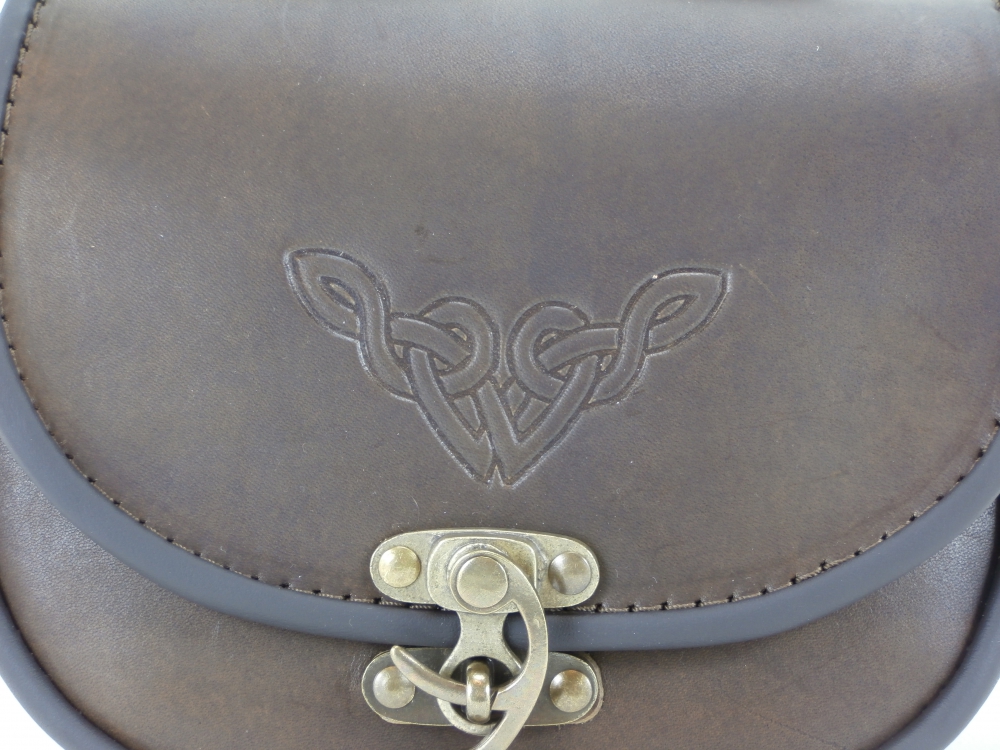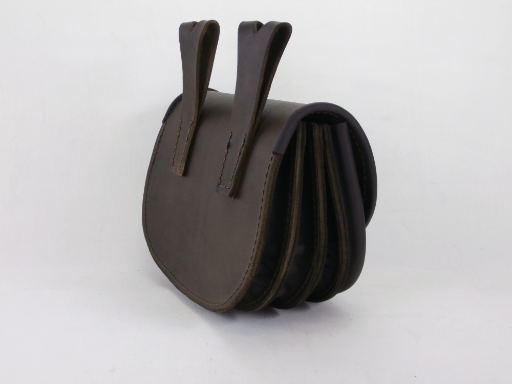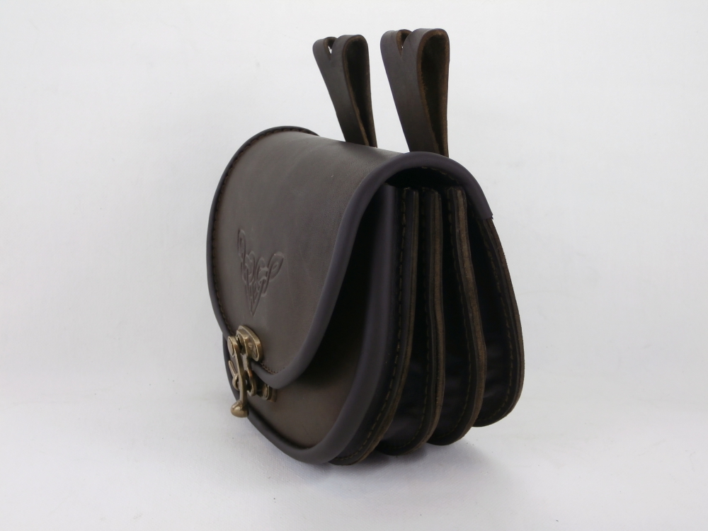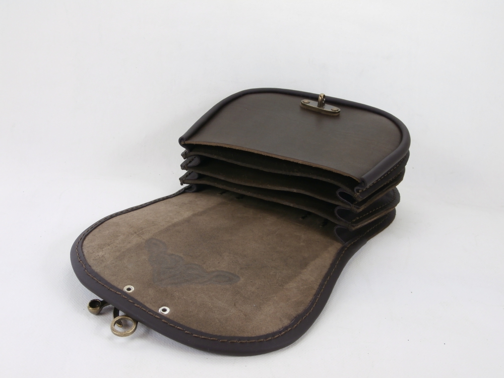 Velká kožená historická tašvice čtveřitá oblá - kvalitní kožená historická tašvice vyrobená ručně z pravé hovězí kůže. Kožená tašvice oblých tvarů má čtyři oddělení a zavírání je řešeno koženou klapnou, která je zdobená raženým historickým motivem. Klapna se zavírá pomocí kovové kotvičky. Na zadní straně kožené tašvice se nachází dvě ozdobná kožená poutka pro zavěšení na opasek.