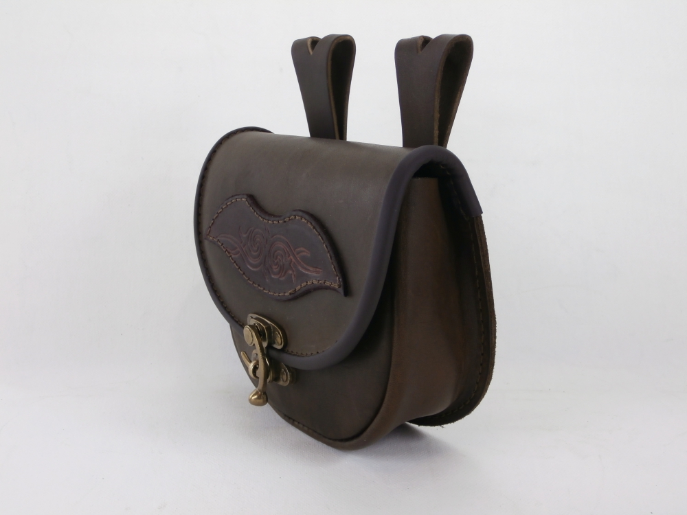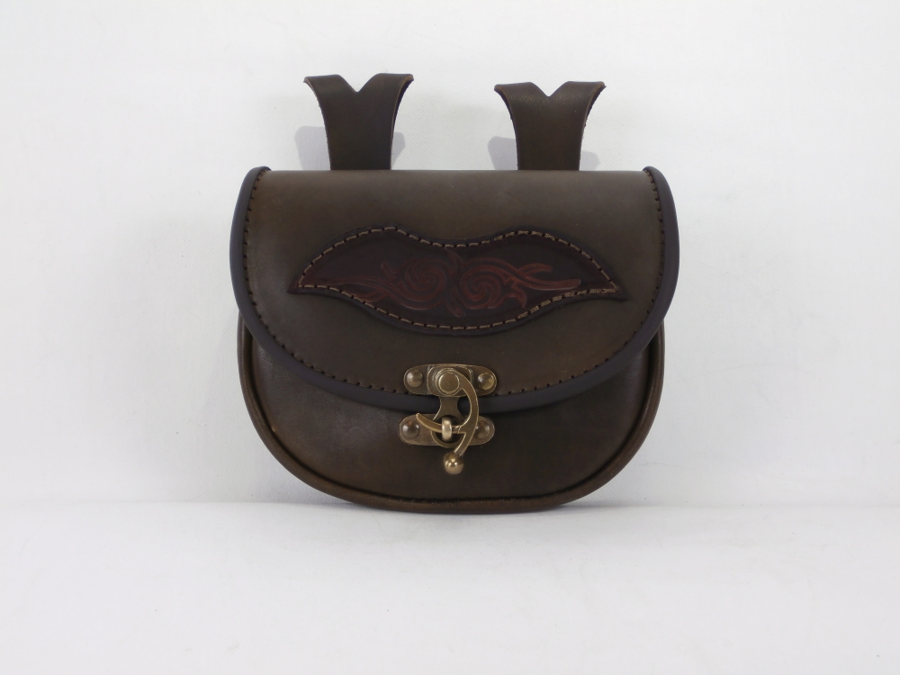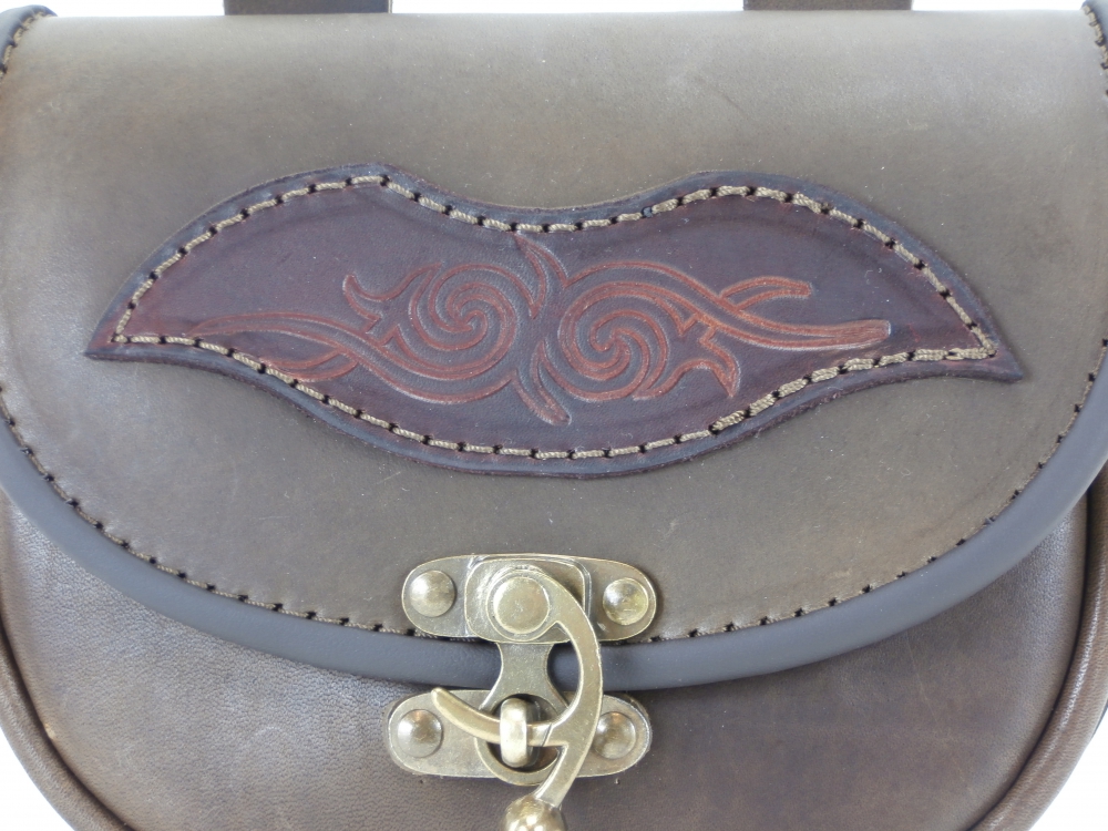 Velká kožená historická tašvice oblá - kvalitní kožená historická tašvice vyrobená ručně z pravé hovězí kůže. Kožená tašvice oblých tvarů má pouze jedno oddělení a zavírání je řešeno koženou klapnou, která je zdobená raženým historickým motivem. Klapna se zavírá pomocí kovové kotvičky. Na zadní straně kožené tašvice se nachází dvě ozdobná poutka pro zavěšení na opasek.