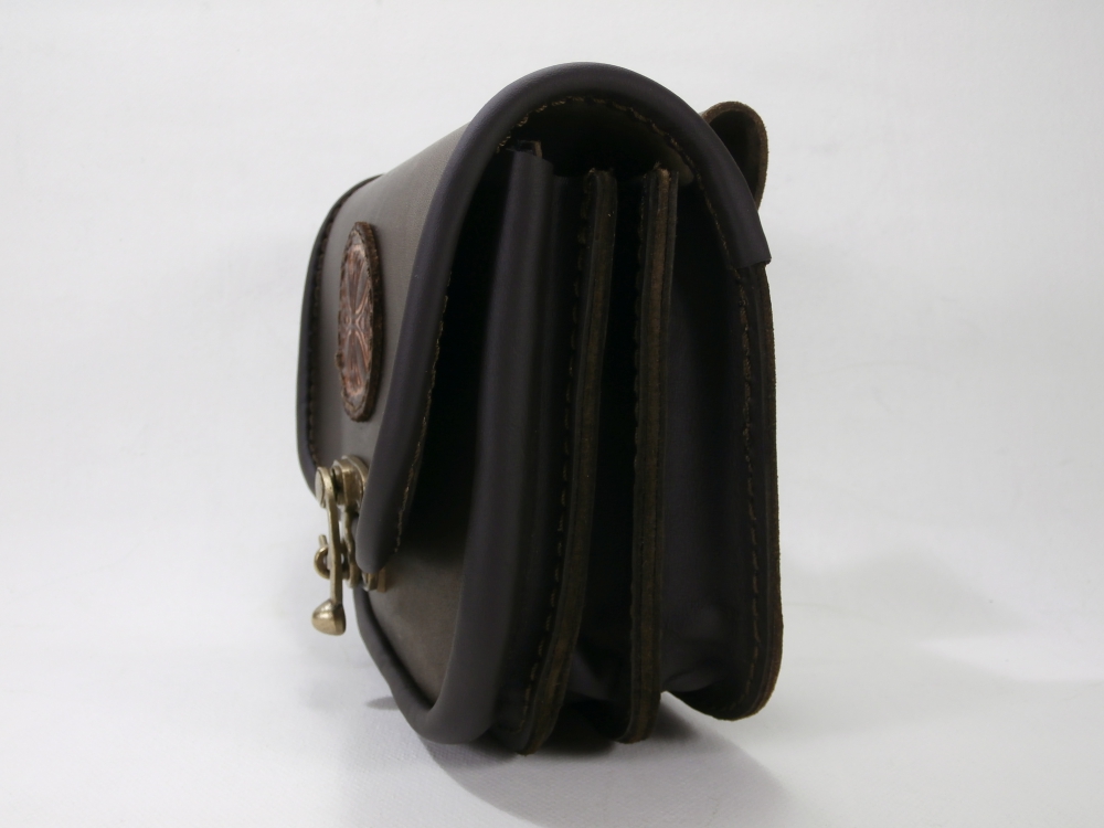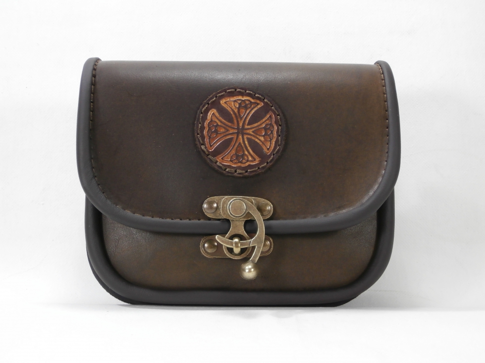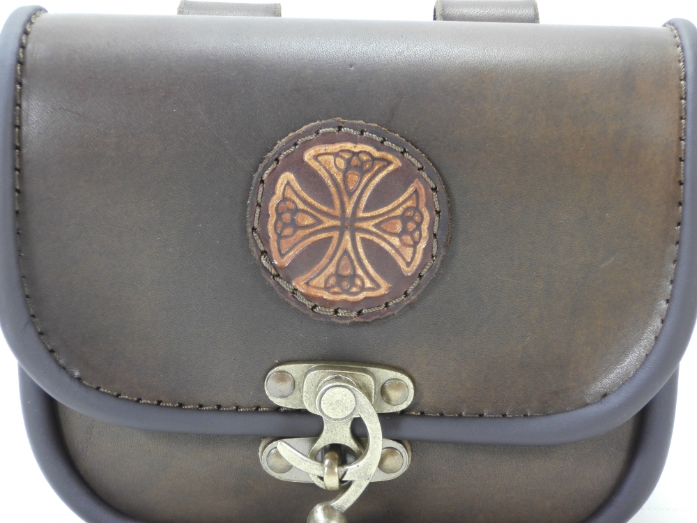 Velká kožená historická tašvice trojitá hranatá - kvalitní kožená historická tašvice vyrobená ručně z pravé hovězí kůže. Kožená tašvice má tři oddělení a zavírání je řešeno koženou klapnou, která je zdobená raženým historickým motivem. Klapna se zavírá pomocí kovové kotvičky. Na zadní straně kožené tašvice se nachází dvě poutka pro zavěšení na opasek.