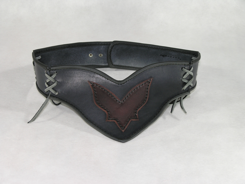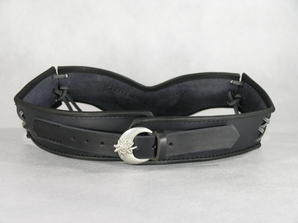 Dámský kožený historický opasek - kvalitní kožený opasek z pravé hovězí kůže o tloušťce 2.5 mm, která zaručuje jeho dlouhou životnost. Opasek je po okrajích lemovaný francouzským lemem. Trojúhelníkový tvar v kombinaci s ozdobnými prvkami po obvodě dodává dámskému koženému historickému opasku autentický dobový vzhled. Opasek se skládá z více častí, které jsou spojeny koženými šňůrami. Kožený historický opasek se zapíná na přezku, která je umístěna na zadní části opasku. Opasek dodáváme v různých velikostech a barvách na míru dle přání zákazníka.