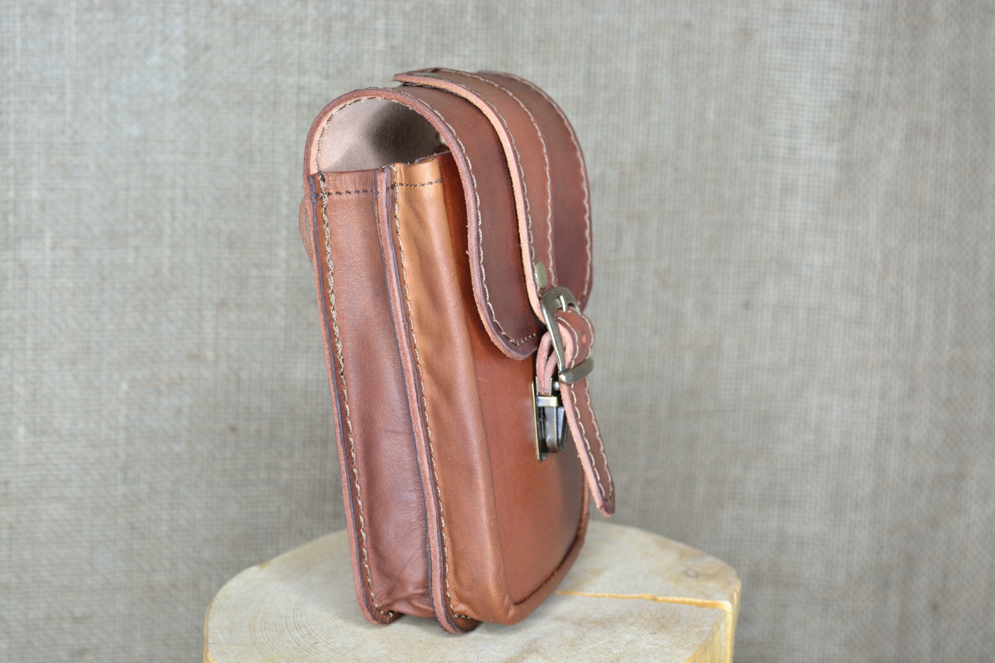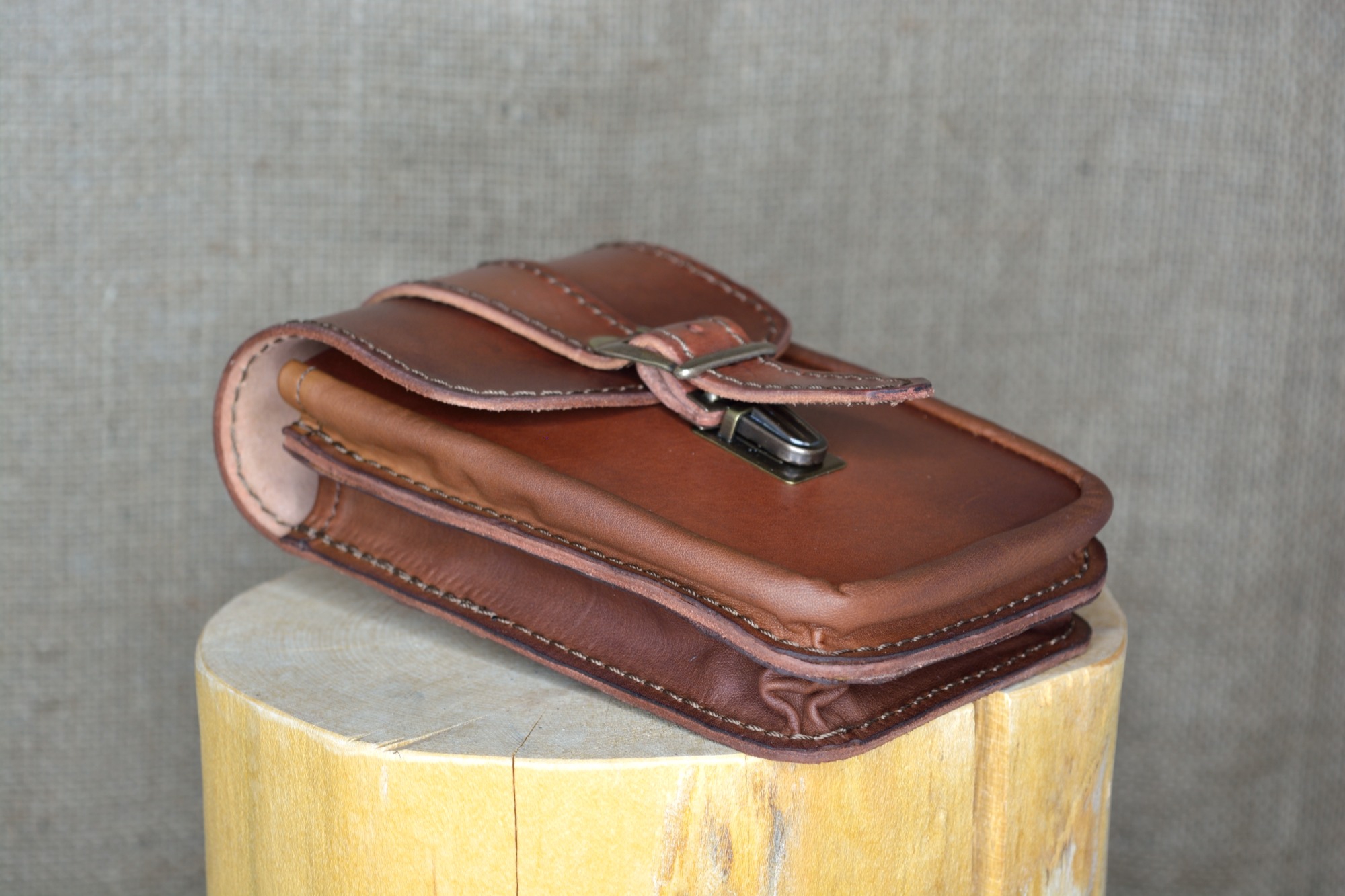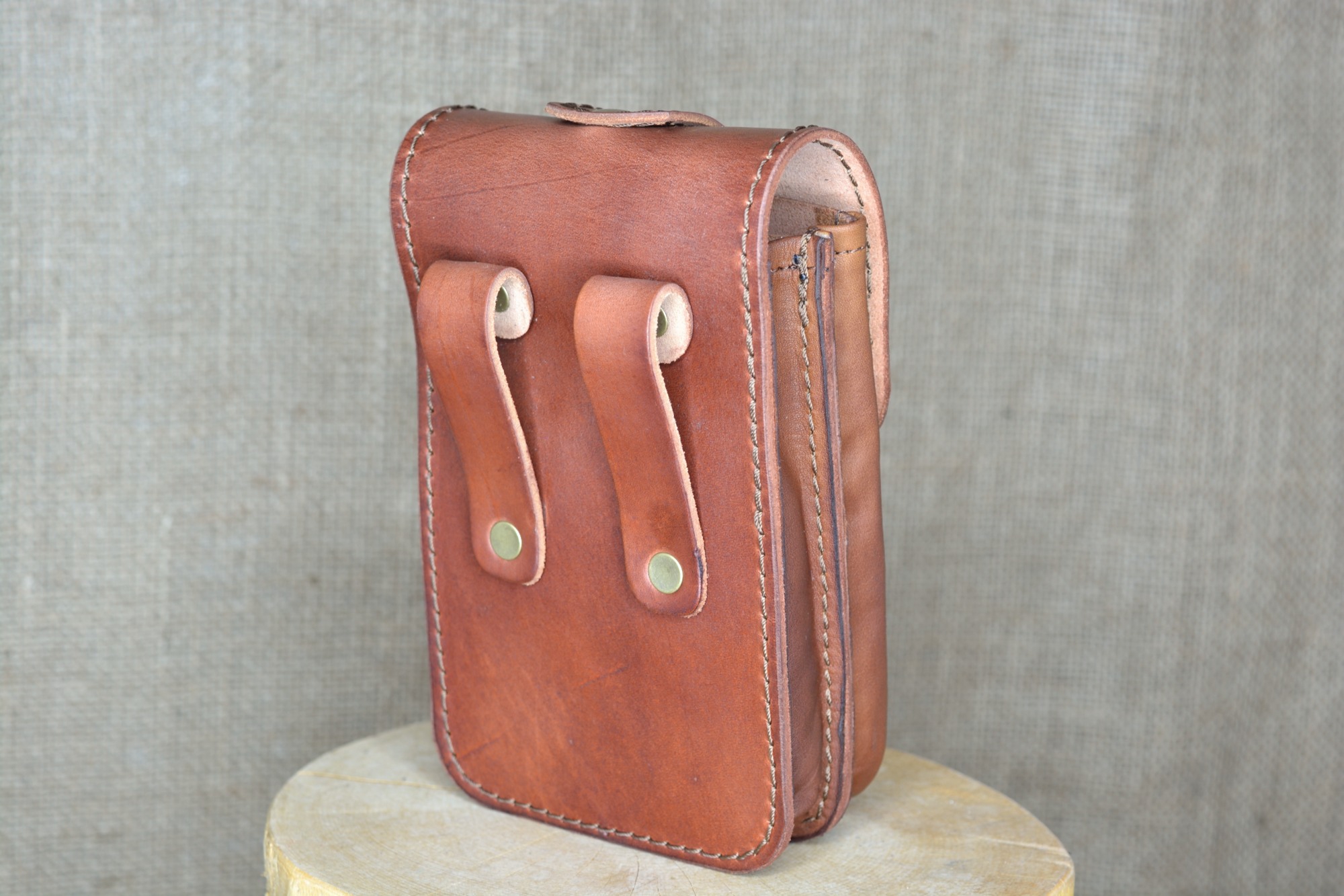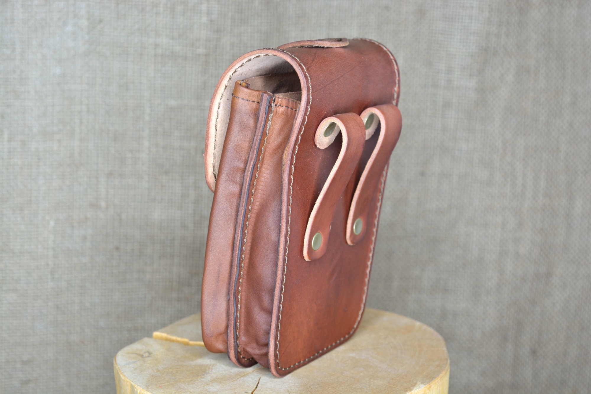 Kožená kapsa dvojitá na výšku s kombinovaným zapínáním větší - kvalitní kožená kapsa vyrobená ručně z pravé hovězí kůže. Kožená kapsa se skládá ze dvou přihrádek. Zapínání kapsy je řešeno pomocí kombinace kovového zámečku a přezky. Na zadní straně má dvě kožená poutka pro uchycení na opasek.