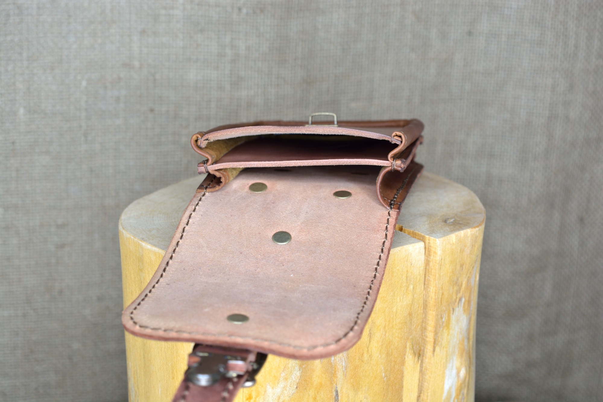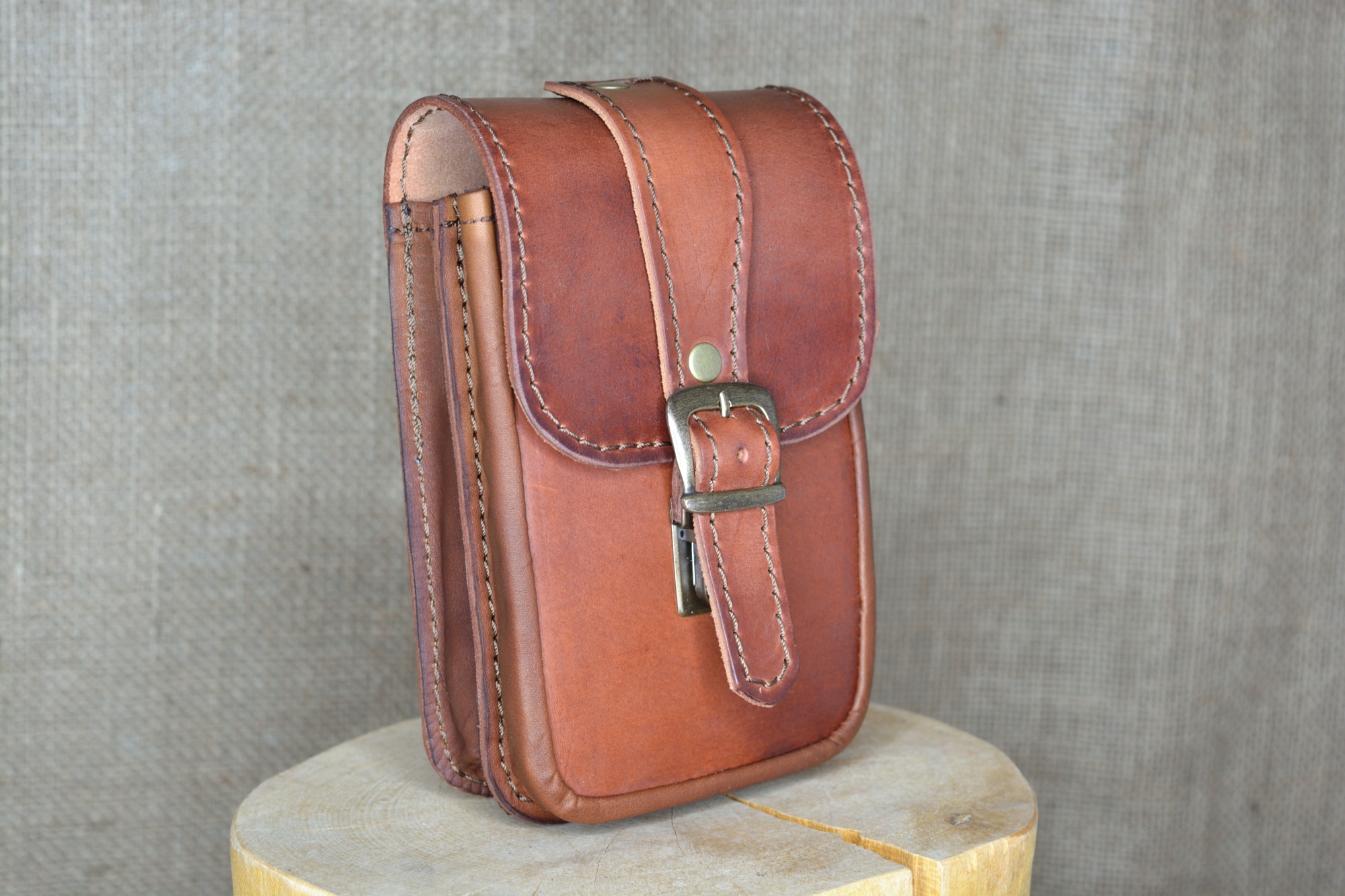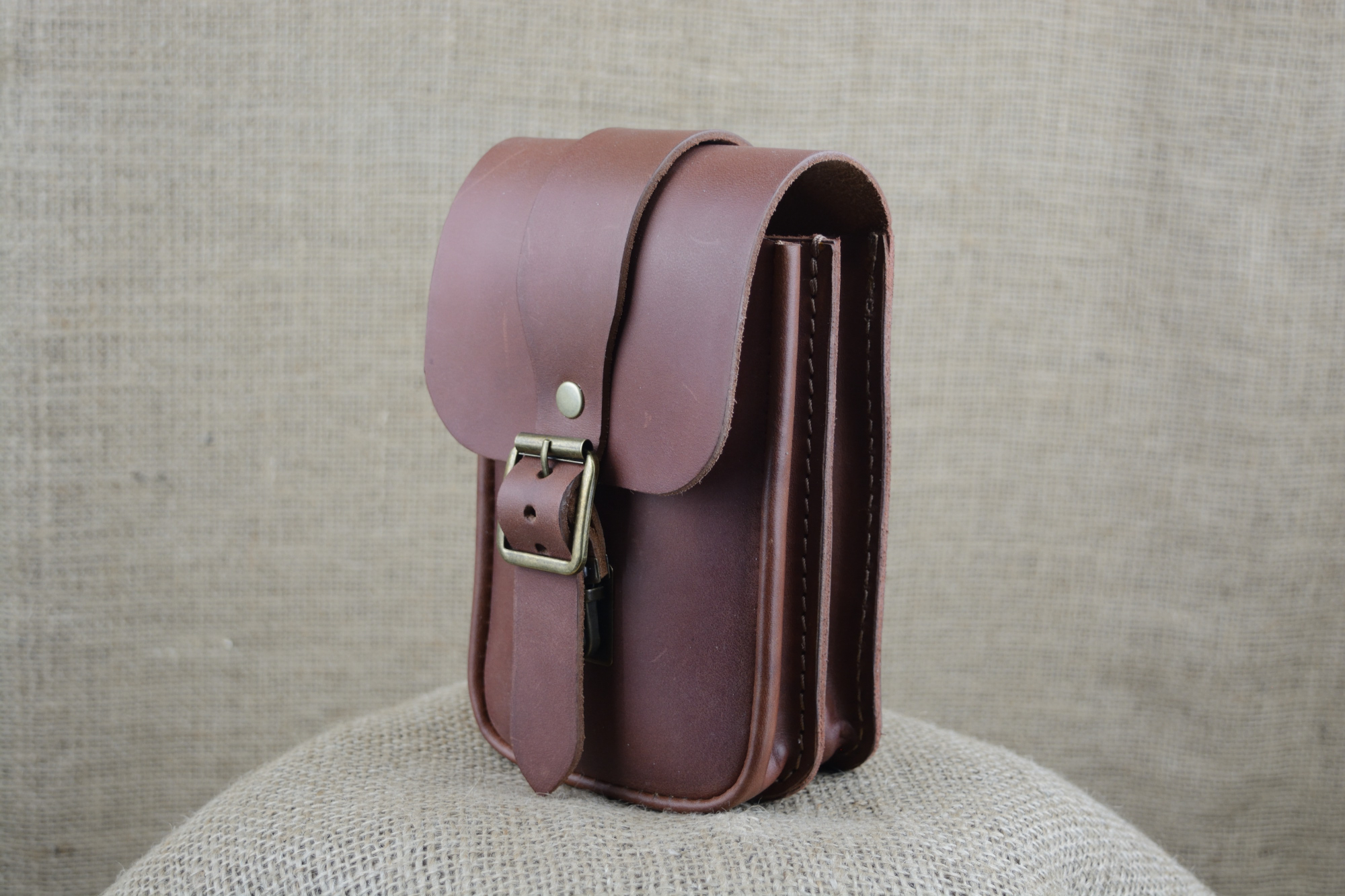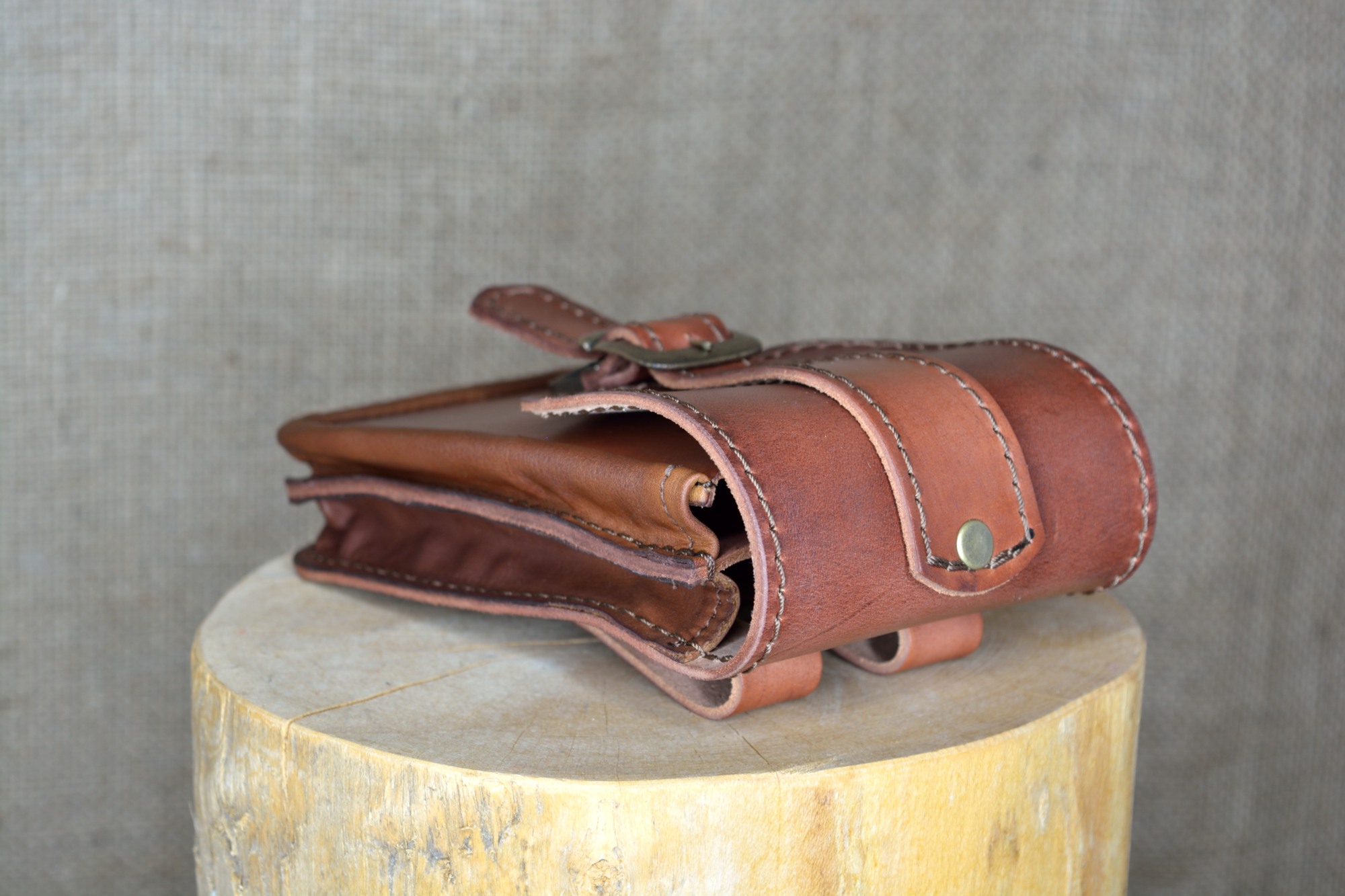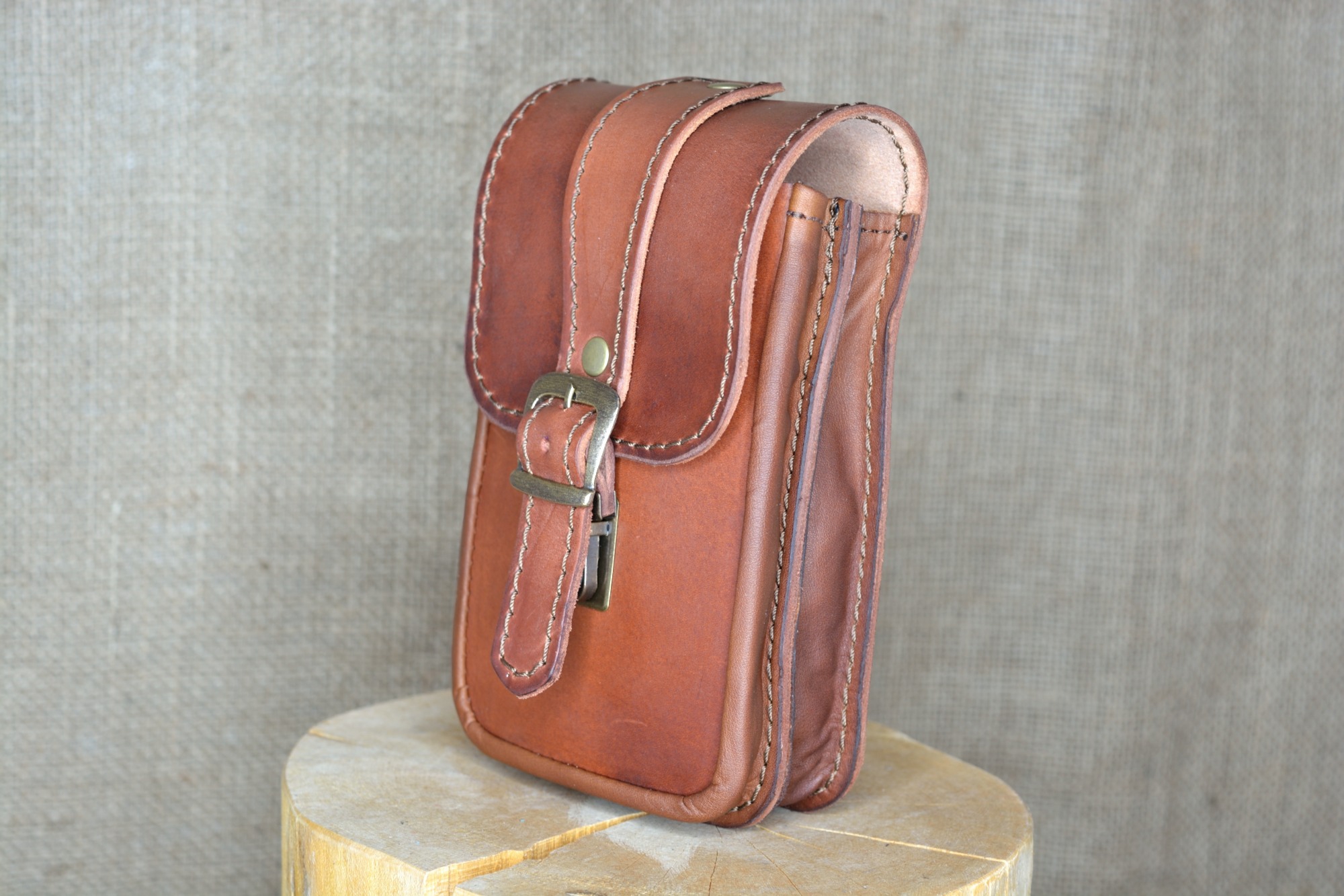 Kožená kapsa dvojitá na výšku s kombinovaným zapínáním větší - kvalitní kožená kapsa vyrobená ručně z pravé hovězí kůže. Kožená kapsa se skládá ze dvou přihrádek. Zapínání kapsy je řešeno pomocí kombinace kovového zámečku a přezky. Na zadní straně má dvě kožená poutka pro uchycení na opasek.