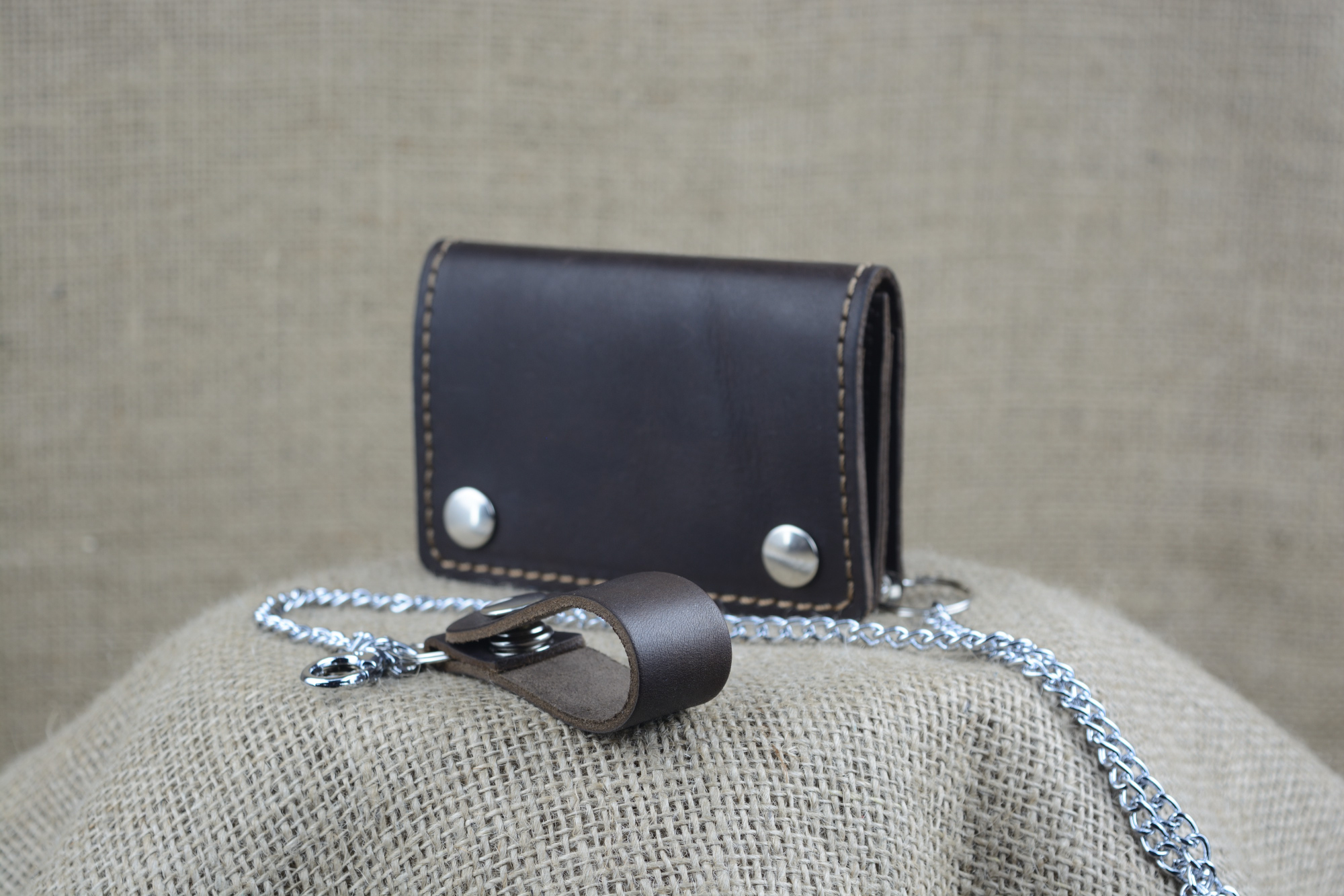 Motorkářská kožená peněženka menší - kvalitní kožená peněženka vyrobená ručně z pravé hovězí kůže. Peněženka se zavírá na dva kovové druky. Peněženka je vybavena karabinou s koženým poutkem na kovový druk a řetězy pro snadné uchycení ke kalhotám.