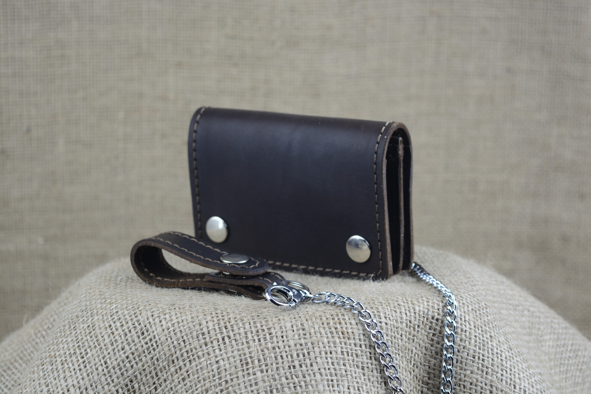 Motorkářská kožená peněženka menší - kvalitní kožená peněženka vyrobená ručně z pravé hovězí kůže. Peněženka se zavírá na dva kovové druky. Peněženka je vybavena karabinou s koženým poutkem na kovový druk a řetězy pro snadné uchycení ke kalhotám.